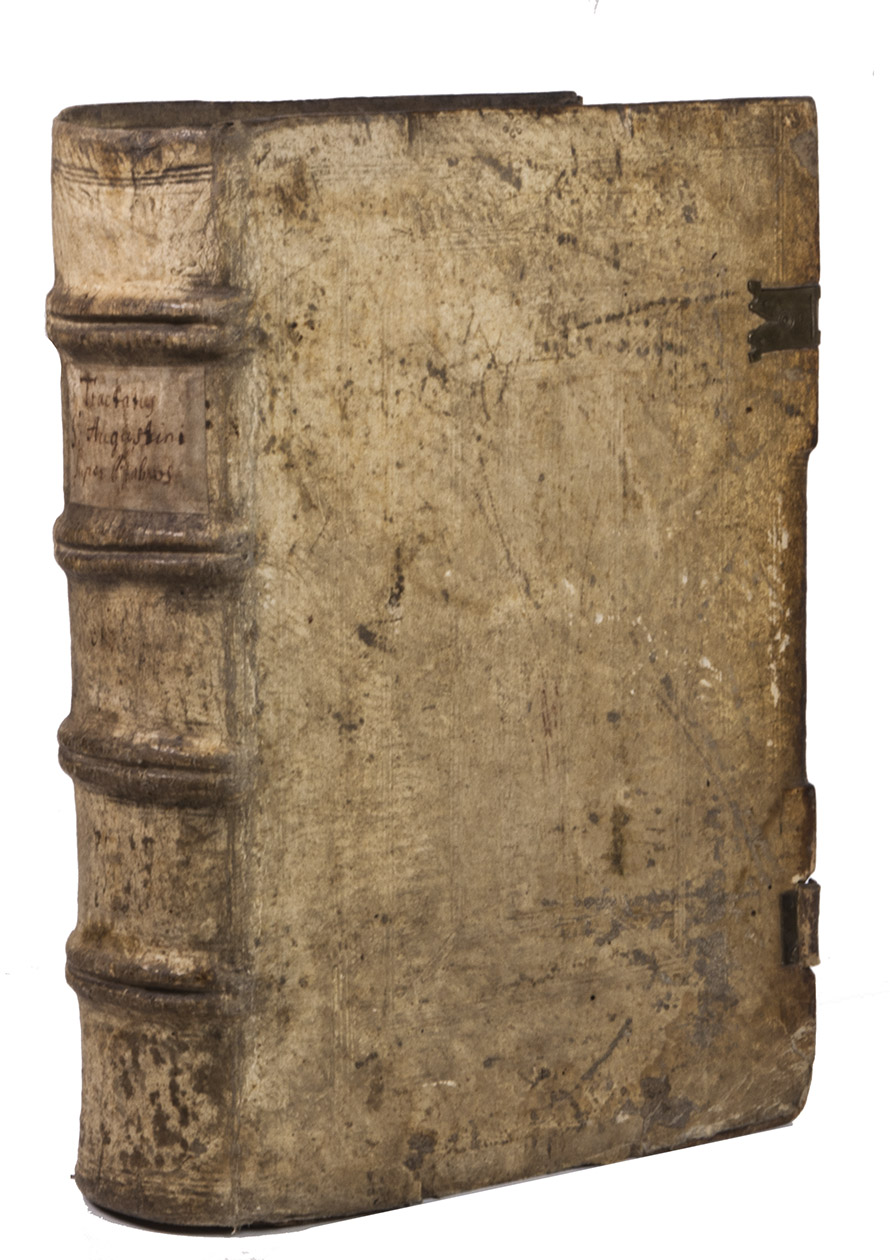 With an owner's inscription on the front pastedown, an annotation in the upper outer corner of the recto of the first blank flyleaf, a (partially) scraped out annotation in the bottom margin of the first text page, and an annotation on the verso of the last text leaf. The boards are rubbed and scraped, strongly affecting the clarity of the blind-tooling, the bottom edges and corners of the boards are scuffed and a tear in the leather at the bottom corner of the back board has been repaired, the edges of the book block are somewhat dust soiled. The gutter between the first two blank flyleaves is cracked, exposing the sewing supports and leather of the binding, a water stain in the bottom corner of the first 4 leaves (including the 2 blank flyleaves), a torn corner on leaf R7 of the 2nd part and leaf (5)6 of the 3rd part, margins foxed throughout. Otherwise in good condition. BM, Catalogue of German books, p. 54; BM, General catalogue, p. 530; Goff A-1243; GW 2909; Hain-Copinger 1971; IDL 519; ISTC ia01272000; Proctor; 7582; USTC 743124; cf. McCarthy, An ecclesiology of groaning: Augustine, the psalms, and the making of Church. In: Theological studies, vol.66 (1), p.23-48, 2005.