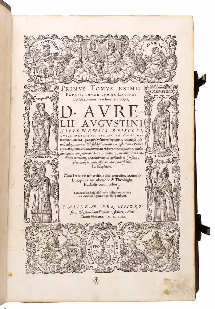 The present work includes a broad range of Augustines writings: his dogmatic treatises (De Trinitate, De civitate Dei), polemical works (notably against Pelagianism and Manichaeism), exegetical texts (Enarrationes in Psalmos, Gospel homilies), ascetic and moral discourses, and the Epistolae. This edition represents an early attempt to consolidate Augustines vast corpus for academic and ecclesiastical use during period following the Council of Trent. It demonstrates the persistence of Augustinian authority in Reformation-era intellectual life, as well as the role of the Swiss printing houses in disseminating patristic texts throughout Europe.