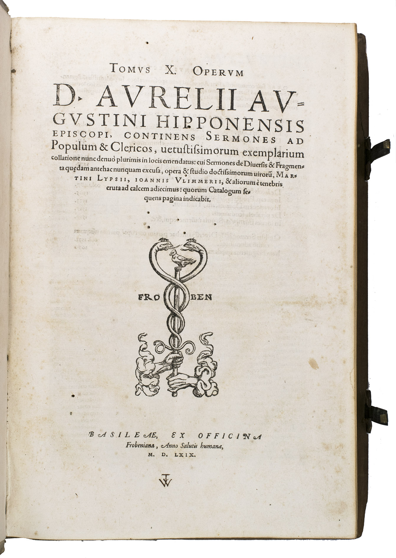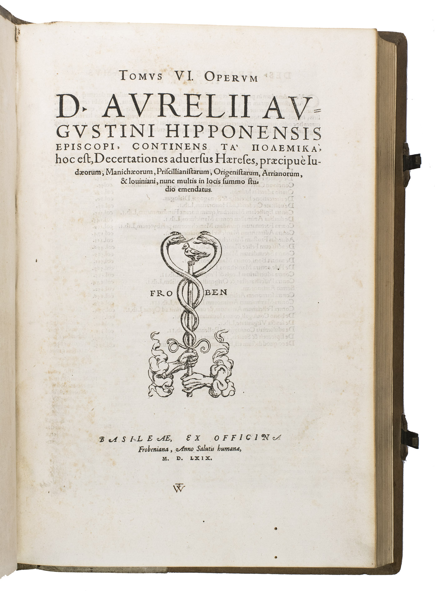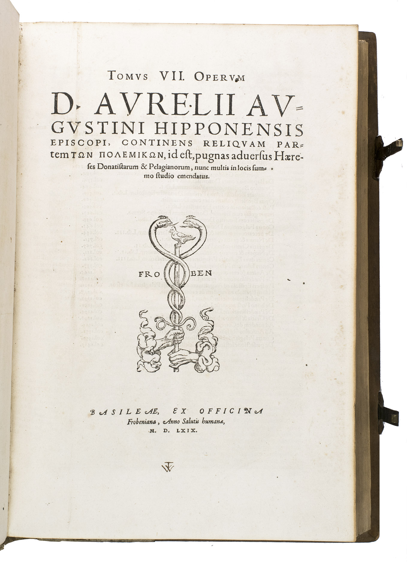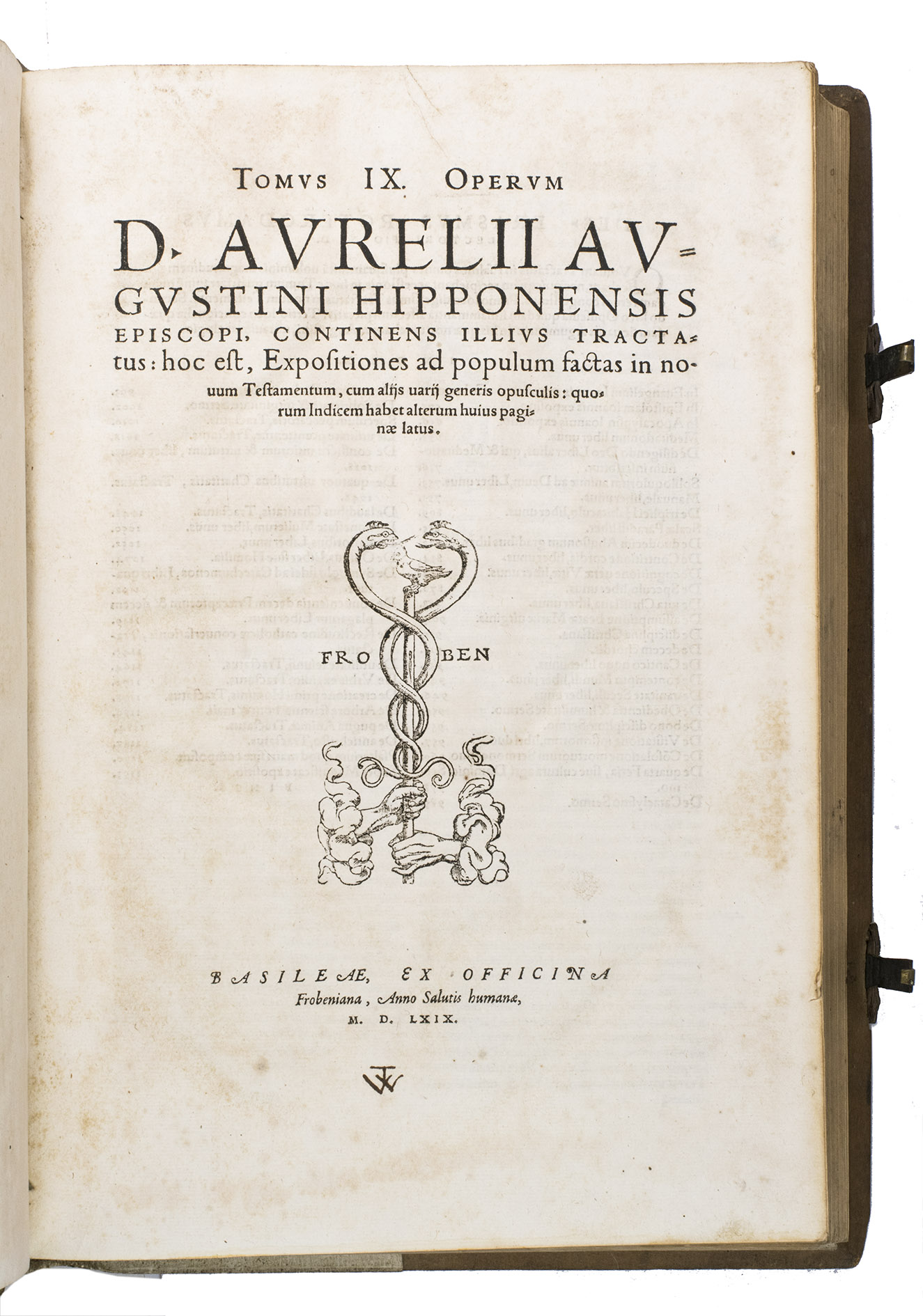 Basel, Ambrosius & Aurelius Froben, 1569. 11 parts in 10 volumes. Folio (38 x 25.5 cm). With the general title page in volume 1 set within an elaborate woodcut frame, all other title pages show the large woodcut Froben printer's device, repeated on all but one verso of the final page in each part. Further with woodcut decorated initials. Contemporary half elaborately blind-tooled pigskin over wooden boards, sewn on 5 supports (volume 1 on 4), with two brass clasps on the fore edge (leather anchor plate, brass clasp and catch plate). With the manuscript titles on the spines and the contents of each volume in manuscript on the bottom edge of all but one volume. Probably bound by Michael Hermann in Stuttgart before 1580.