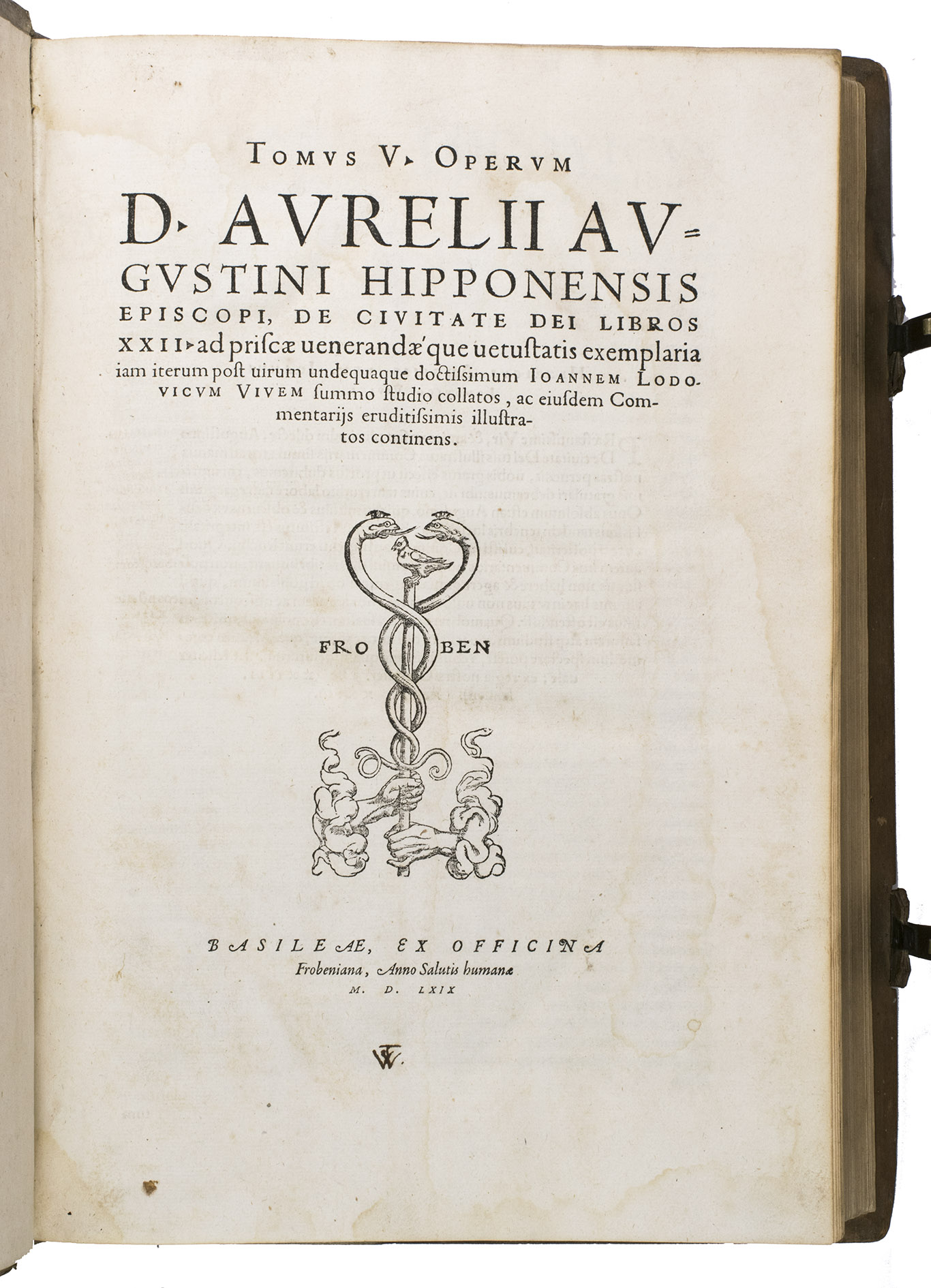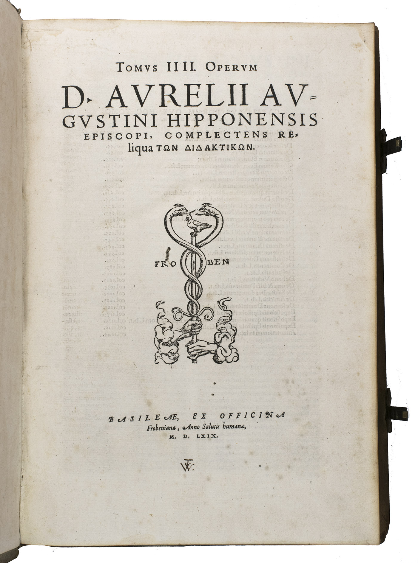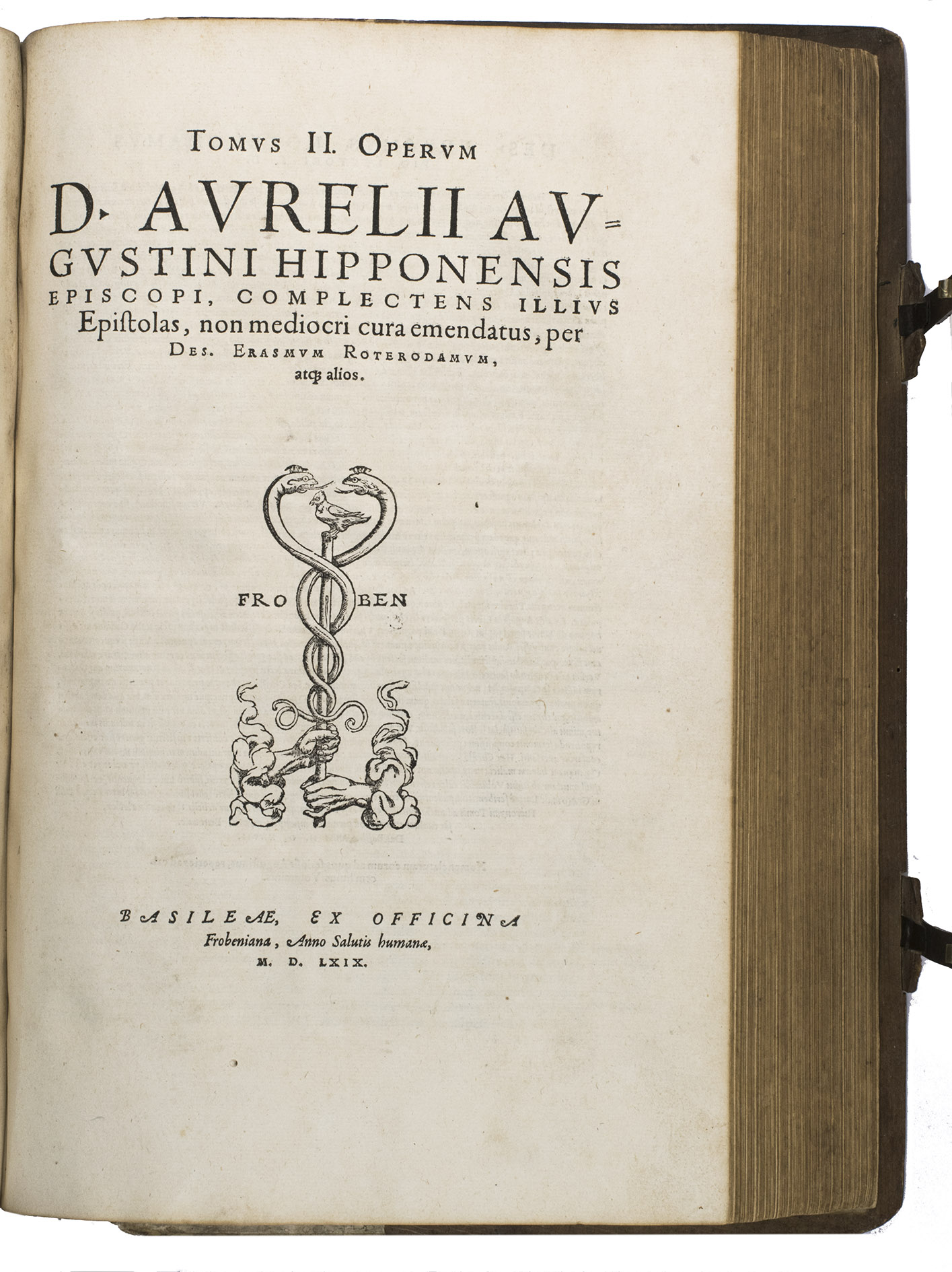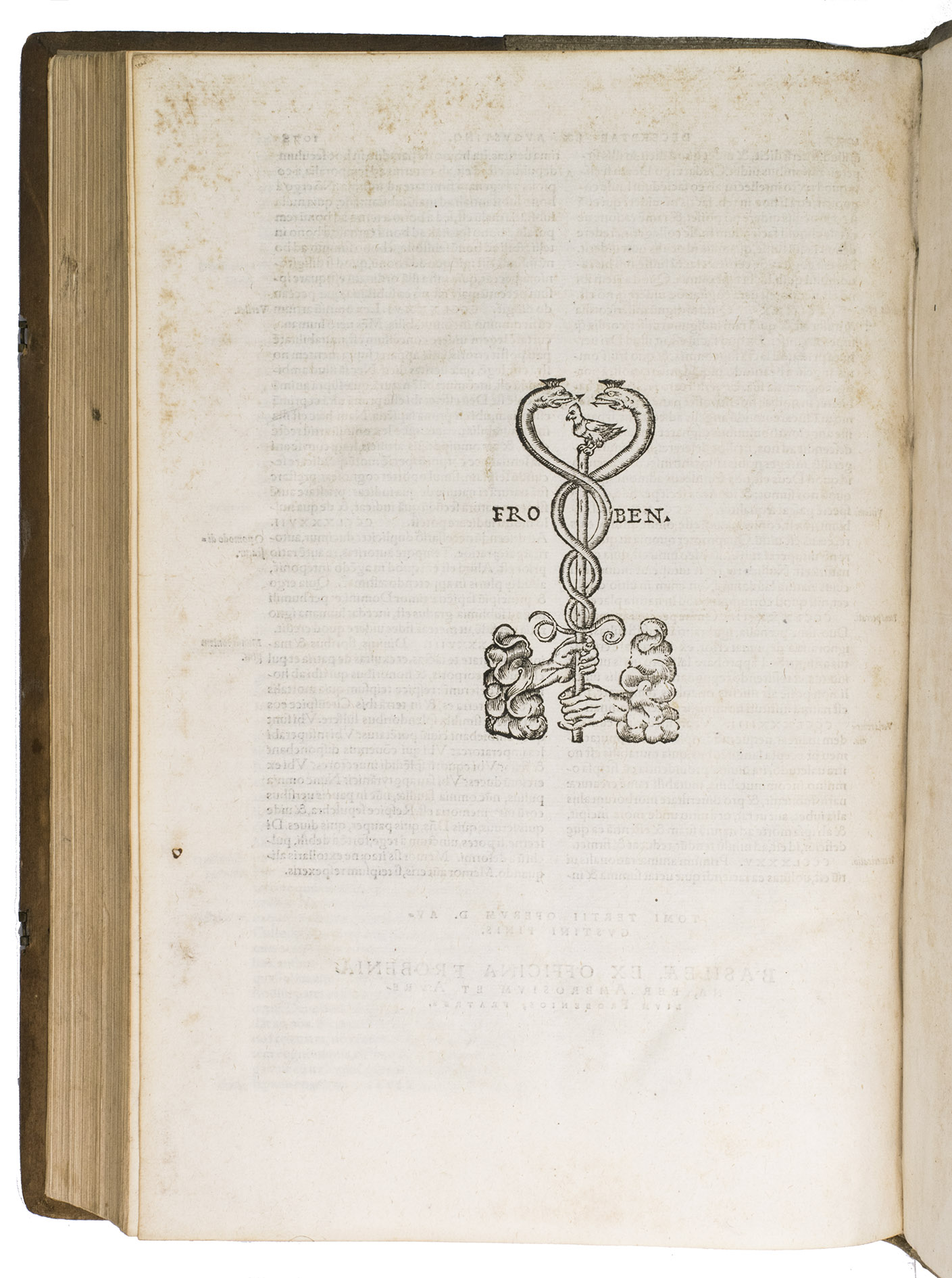 Basel, Ambrosius & Aurelius Froben, 1569. 11 parts in 10 volumes. Folio (38 x 25.5 cm). With the general title page in volume 1 set within an elaborate woodcut frame, all other title pages show the large woodcut Froben printer's device, repeated on all but one verso of the final page in each part. Further with woodcut decorated initials. Contemporary half elaborately blind-tooled pigskin over wooden boards, sewn on 5 supports (volume 1 on 4), with two brass clasps on the fore edge (leather anchor plate, brass clasp and catch plate). With the manuscript titles on the spines and the contents of each volume in manuscript on the bottom edge of all but one volume. Probably bound by Michael Hermann in Stuttgart before 1580.