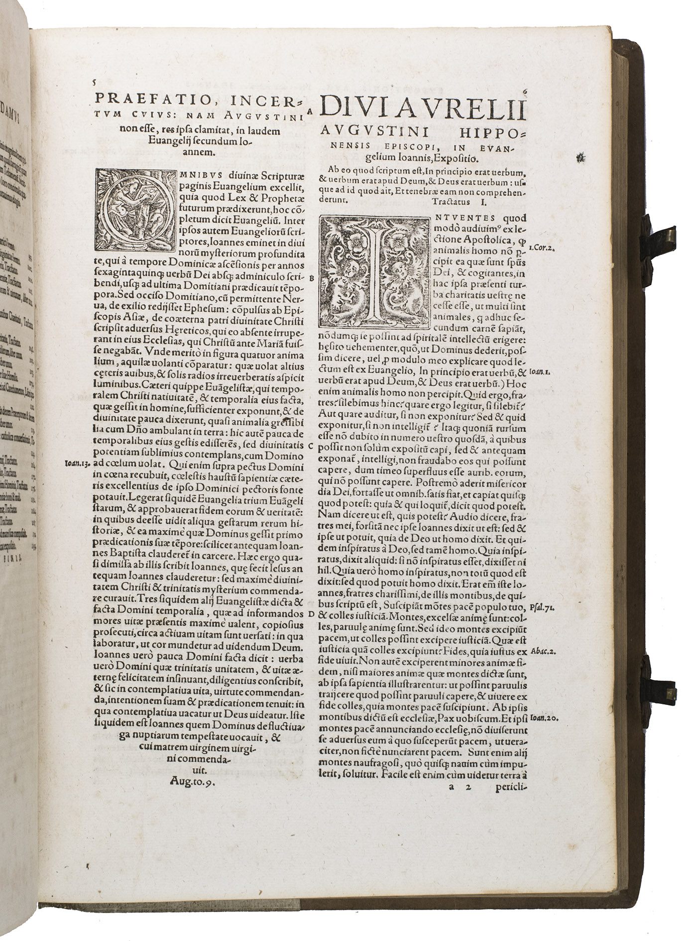 With a manuscript inscription on each of the title pages and a small printed book plate mounted on the front pastedown of volume 1. The bindings are slightly stained and are occasionally slightly bumped and rubbed. The front hinge of volume one is slightly weakened, lacking the upper clasp and anchor plate of volume 7, and the front board of volume 9 is slightly damaged along the fore edge. Internally, the volumes are variably slightly foxed and/or browned, some volumes show very minor water staining, most volumes contain some minor worm holes which affect small parts of the letters. A more detailed condition report, including collations etc., per volume is available upon request. The 10 volumes are overall in very good condition. A handsome and important Renaissance printing of one of the most significant corpora of Christian antiquity. Rare complete in all ten volumes, here uniformly bound. USTC 686573; VD 16 A 4153; WorldCat 1828402, 1406901978, 1090145458, 1002789099, 35656998, 222081178, 1322263024, 1114269923; cf. for the binder see Einbanddatenbank no. 502297b (rolls nos. r004651 and r003964).