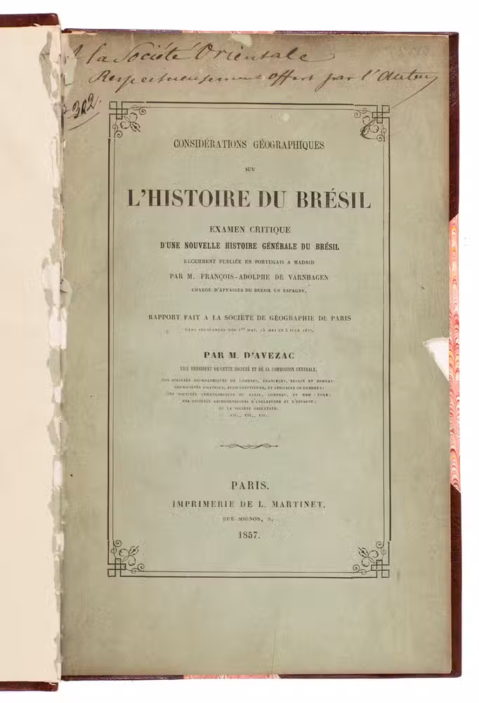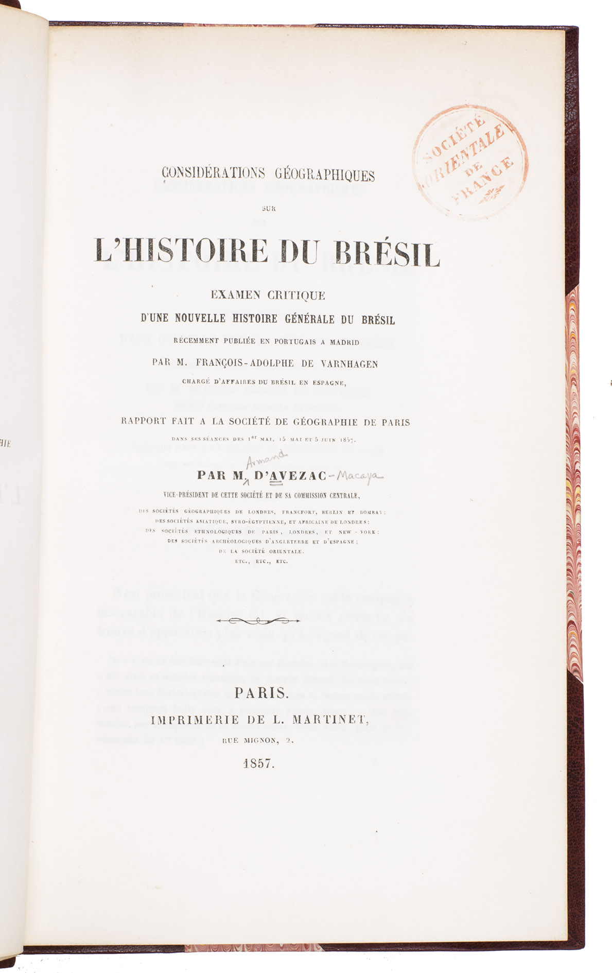 Considérations géographiques sur l'histoire du Brésil. Examen critique d'une nouvelle histoire générale du Brésil recemment publiée en portugais a Madrid par M. François-Adolphe de Varnhagen chargé d'affaires du Brésil en Espagne. Rapport fait à la société de géographie de Paris dans ses séances des 1er Mai et 5 Juin 1857.