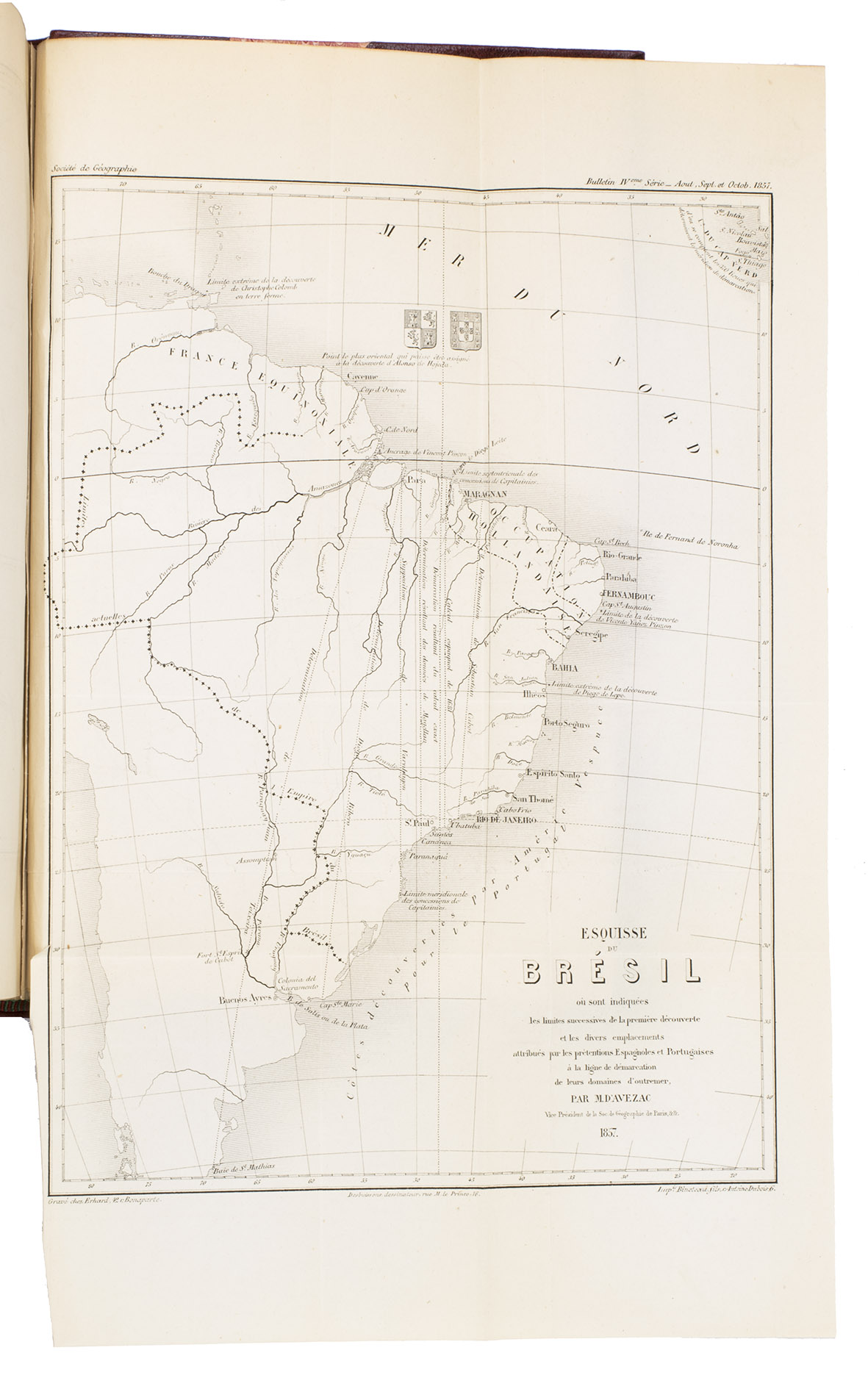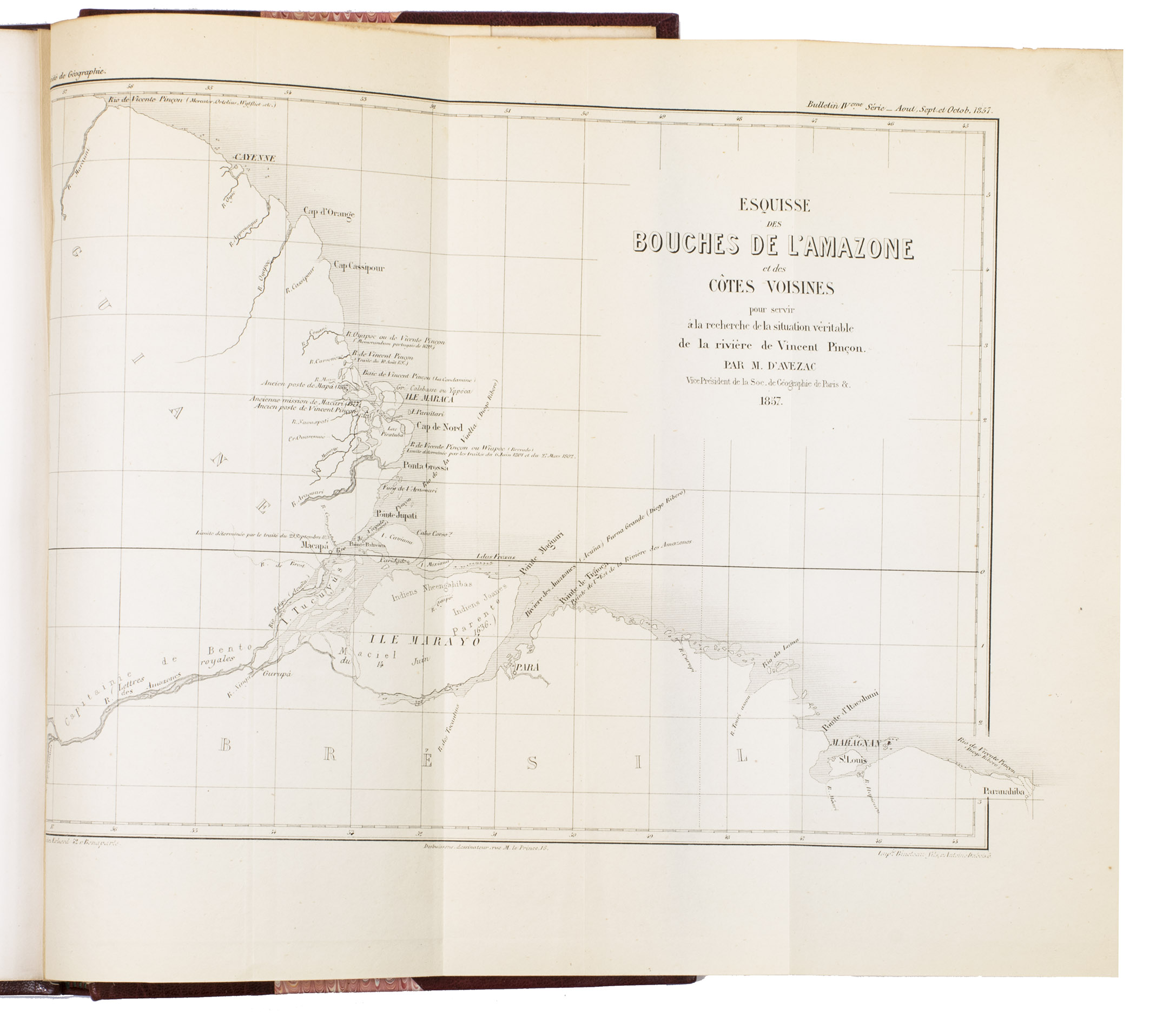 First separate edition of an interesting account of the history of Brazil by Marie Armand Pascal d'Avezac de Castera-Macaya (1800-1875). It is an extract from the Bulletin de la Société de Géographie (the Août-Octobre 1857 issue) with a separately printed new title-page. It includes two folding maps, one of (the greater part of) South America, especially Brazil and one showing the estuary of the Amazon river.