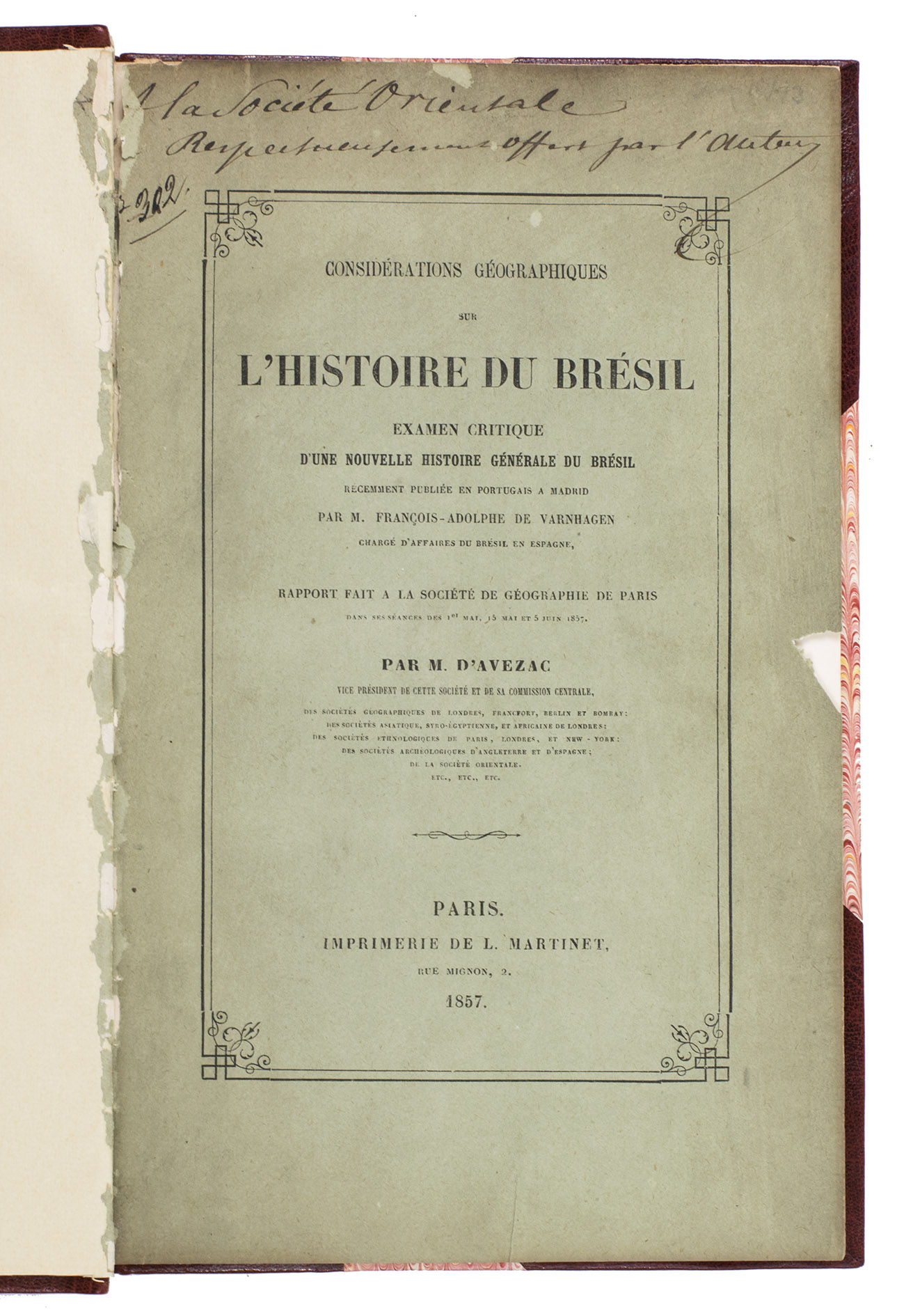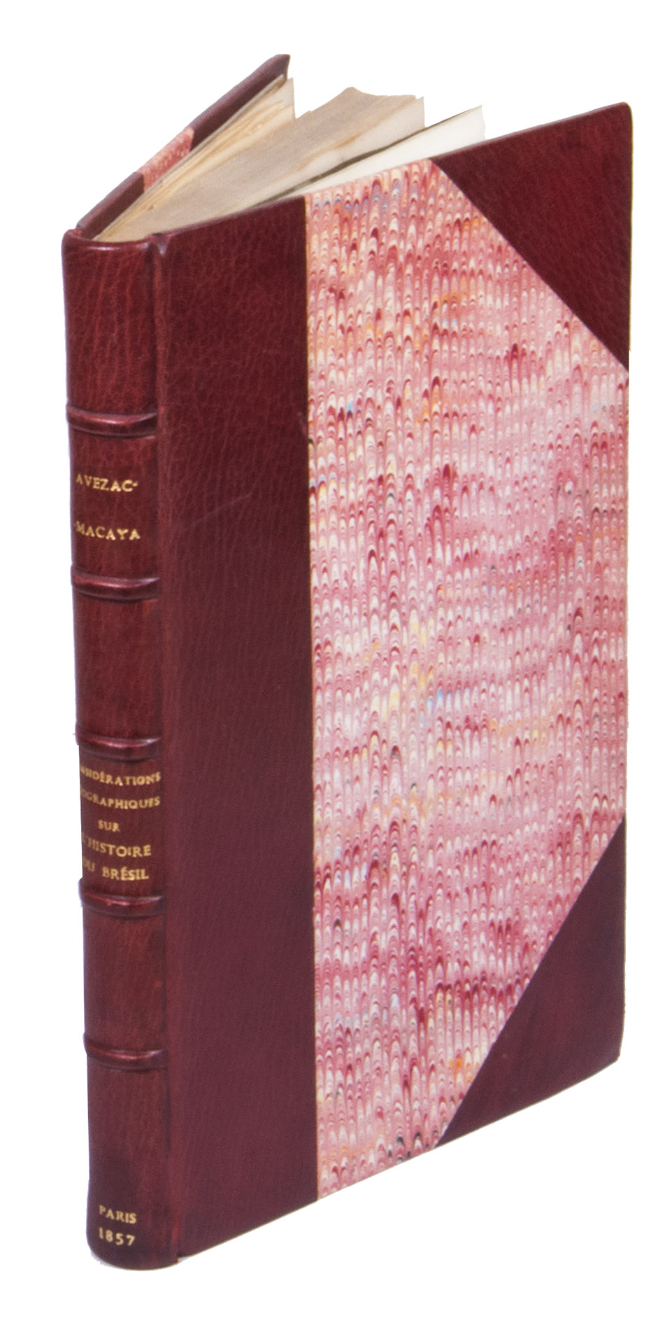 In this work D'Avezac disputes several of Varnhagen's views concerning the period of the discoveries. He does not agree that Vespucci's second voyage was made in the company of Hojeda. Varnhagen defended his position in his Examen de quelques points de l'histoire geographique de Brésil (Paris, 1858). He believed that d'Avezac disagreed with his opinions because he supported the French assertions that the boundaries of French Guyana should stretch to the banks of the Amazon. D'Avezac replied to Varnhagen in Les voyages de Americ Vespuce au compte de l'Espange ... (Paris, 1858). It is also a criticism of Varnhagen's work about Vespucci's first voyage. Good presentation copy of a geographical history of Brazil. Borba de Moraes, p. 57; Rodriques 301; Sabin 2491; not in Welsh.