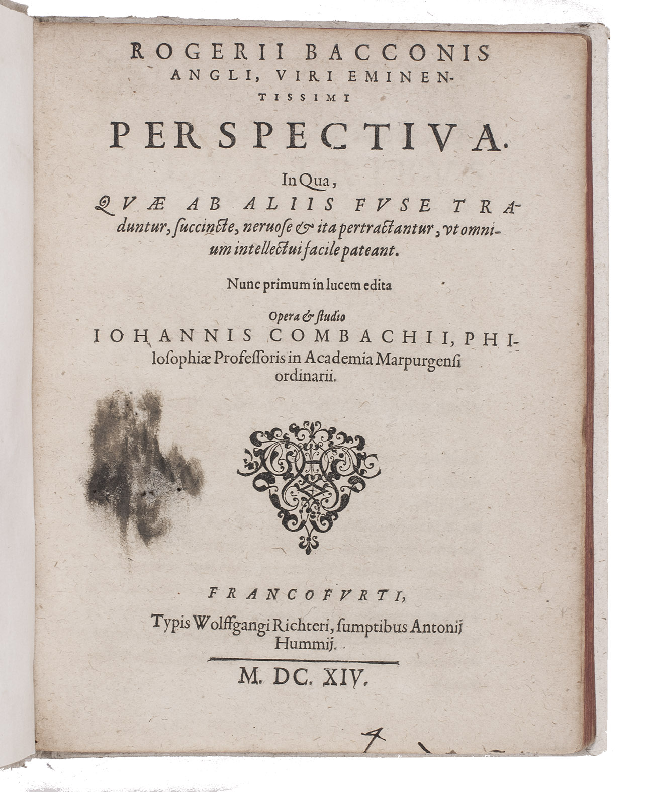 First edition of a famous work on optics by the English natural philosopher and mathematician Roger Bacon (ca. 1220-ca. 1292). Bacon was well read in Arabic and ancient Greek sources on optics and perspective, a subject hardly studied in Europe during the earlier Middle Ages. The main sources for his theories were the writings of Euclid, Ptolemy and Alhazen (Ibn al-Haytham), and he followed Robert Grosseteste concerning the importance of light and in his emphasis on the use of lenses, not only for burning, but also for magnification to aid natural vision. Bacon advised magnifying glasses for old people as well as for people with weak eyes. The Perspectiva belonged to Bacon's Opus maius, compiled in manuscript in 1266-1267. The present edition was based on a medieval manuscript and was edited by Johann Combach (1585-1651), professor of philosophy at Marburg in Germany