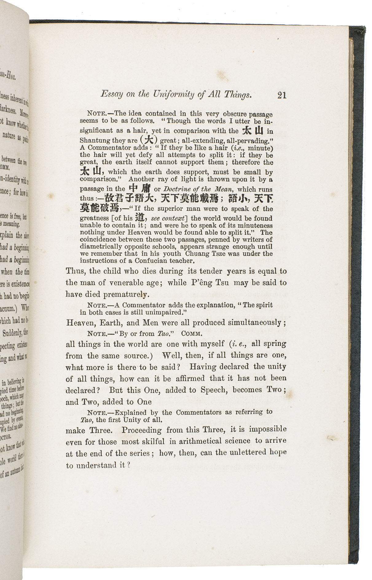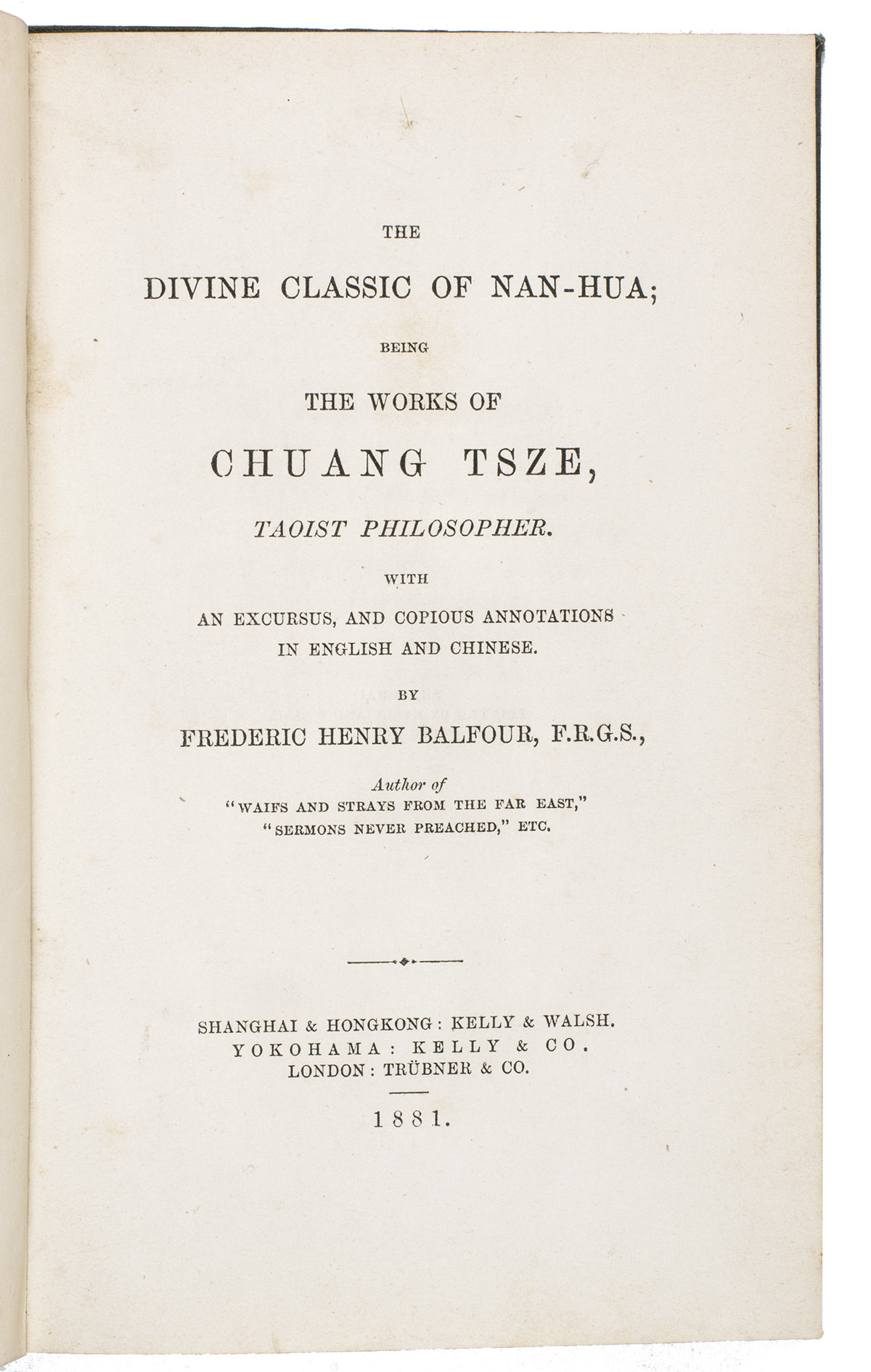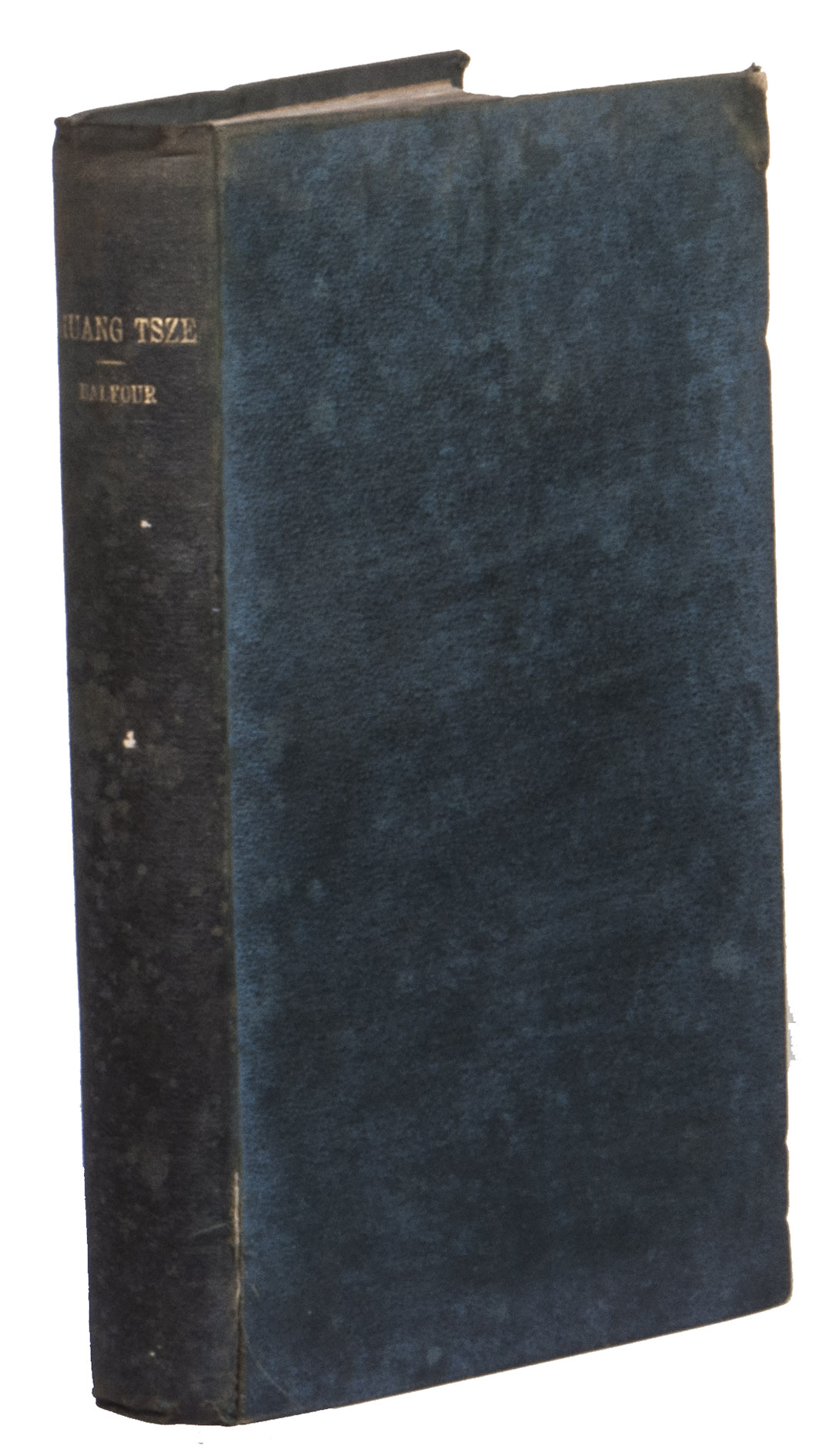 The boards are somewhat rubbed, the edges and corners of the boards are somewhat scuffed and bumped, the front joint is weakened at the foot. The work is lightly foxed throughout, a brown stain on page 183. Otherwise in good condition. BMC General 2, p. 221, col. 600; Jisc (8 copies in British libraries); cf. Zhao, Z., "A study of Balfours English translation of the Zhuangzi in light of comparative religion", in: Humanities and social sciences communications 11 (1604), 2024.