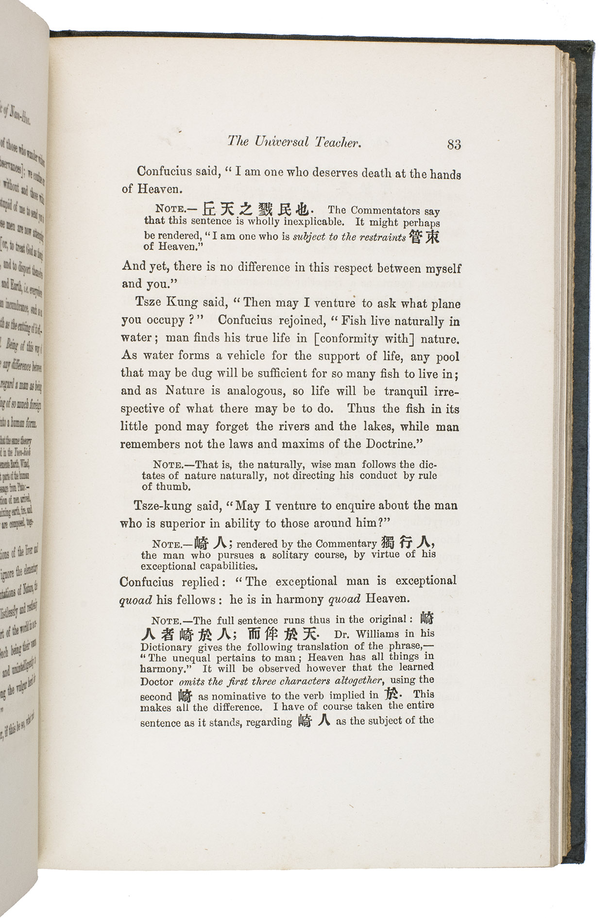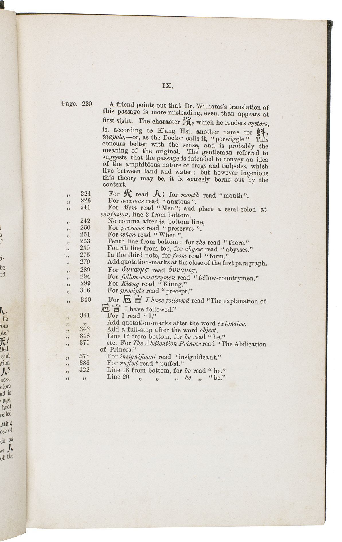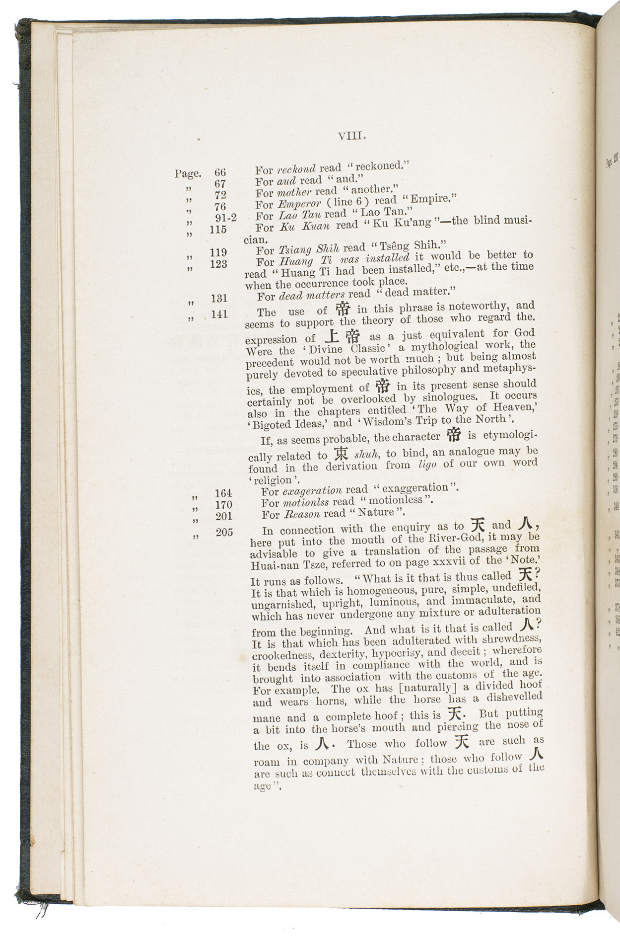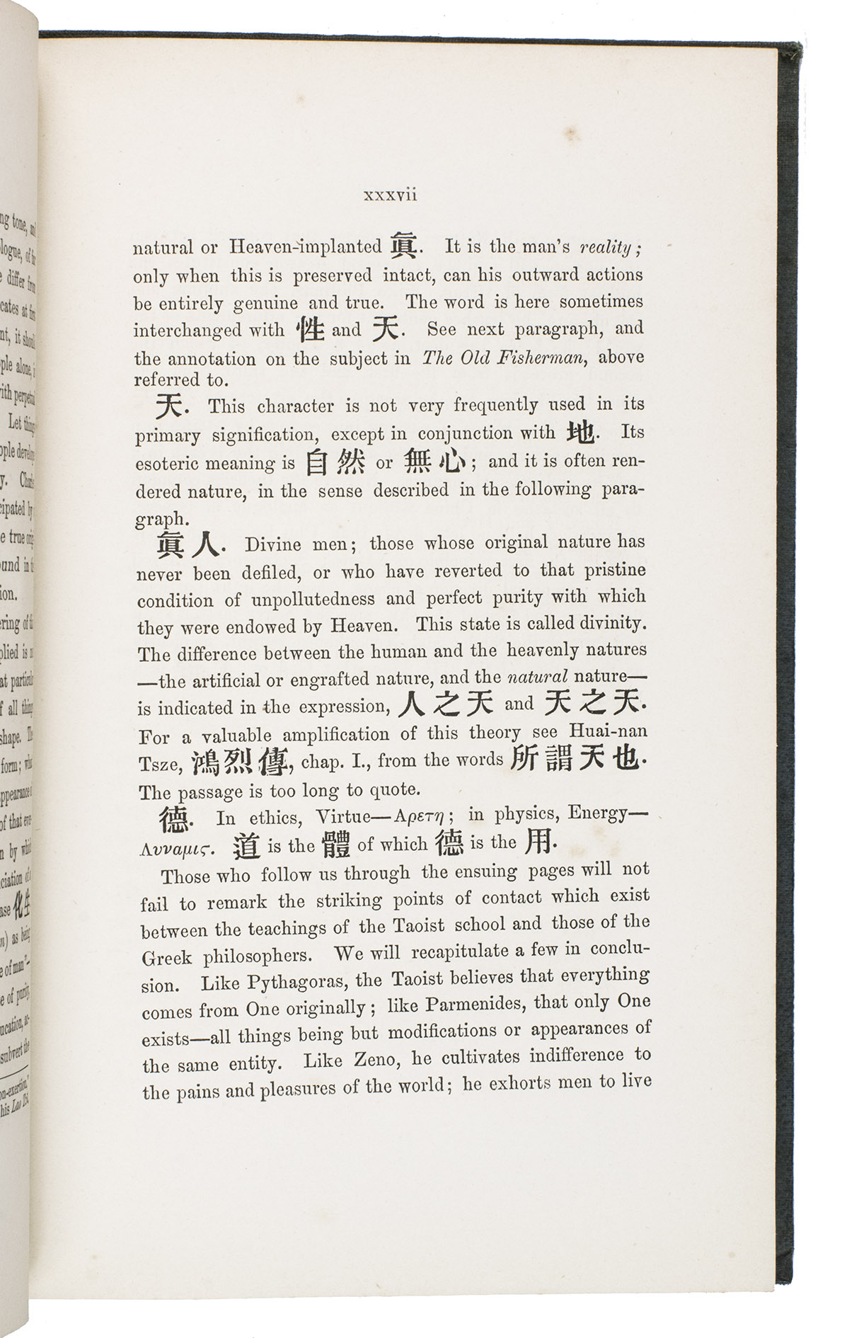 The boards are somewhat rubbed, the edges and corners of the boards are somewhat scuffed and bumped, the front joint is weakened at the foot. The work is lightly foxed throughout, a brown stain on page 183. Otherwise in good condition. BMC General 2, p. 221, col. 600; Jisc (8 copies in British libraries); cf. Zhao, Z., "A study of Balfours English translation of the Zhuangzi in light of comparative religion", in: Humanities and social sciences communications 11 (1604), 2024.