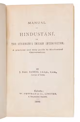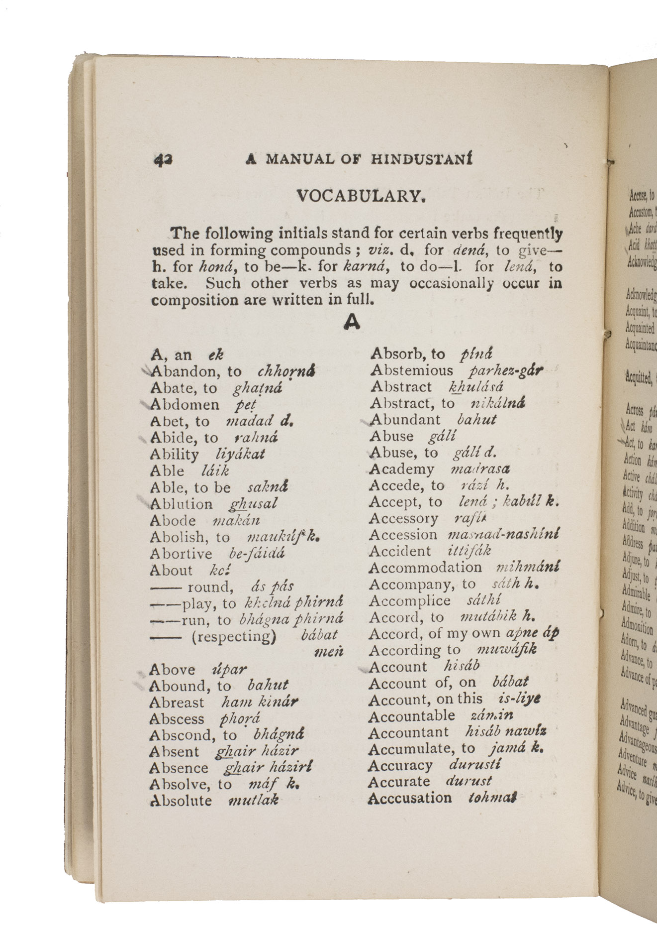 With a large drawing on the front endpapers of flowers, an owner's inscription on the front pastedown, and an inscription on the first flyleaf, which appears to be a packing list in English. The binding shows some signs of wear, with a water stain on the upper part of the back board, the cloth has somewhat frayed along the edges of the boards, and the spine has discoloured. The leaves have somewhat browned. Otherwise in good condition. This edition not in WorldCat; cf. BM, General catalogue, vol 2, p. 281-1073 (other ed.); Safadi, A., The colonial construction of Hindustani 1800-1947, 2012, pp. 1 and 38.