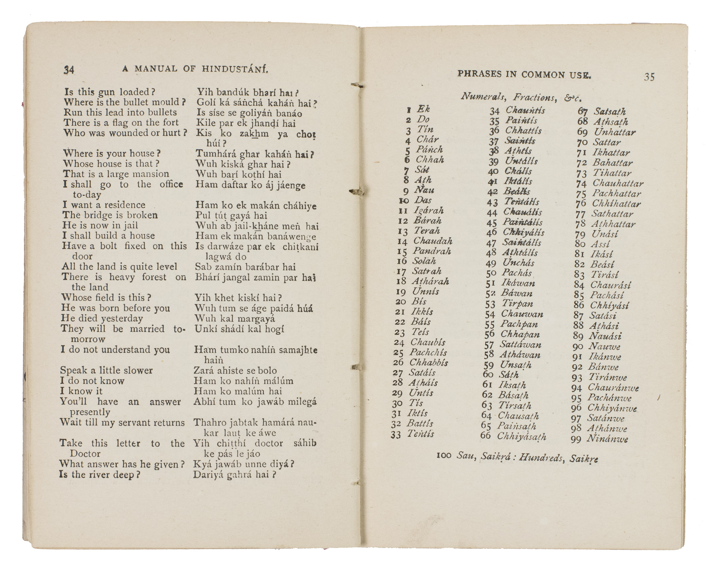 The only-known copy of the second edition of an extremely rare pocket-sized manual for the Hindustani language, which was clearly meant for everyday use. The second edition appears to be more rare than the first (1886) and third (1894) editions, as we have not been able to find any other copies either on the market, in libraries or mentioned in reference works. A possible explanation for this is its size. Whereas the first edition was in octavo, this second edition is significantly smaller. As a result, it must have been much more practical, but also more prone to getting lost.