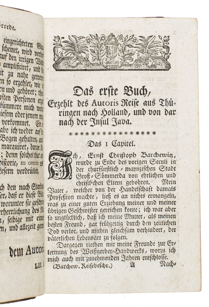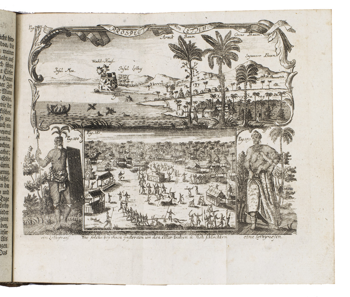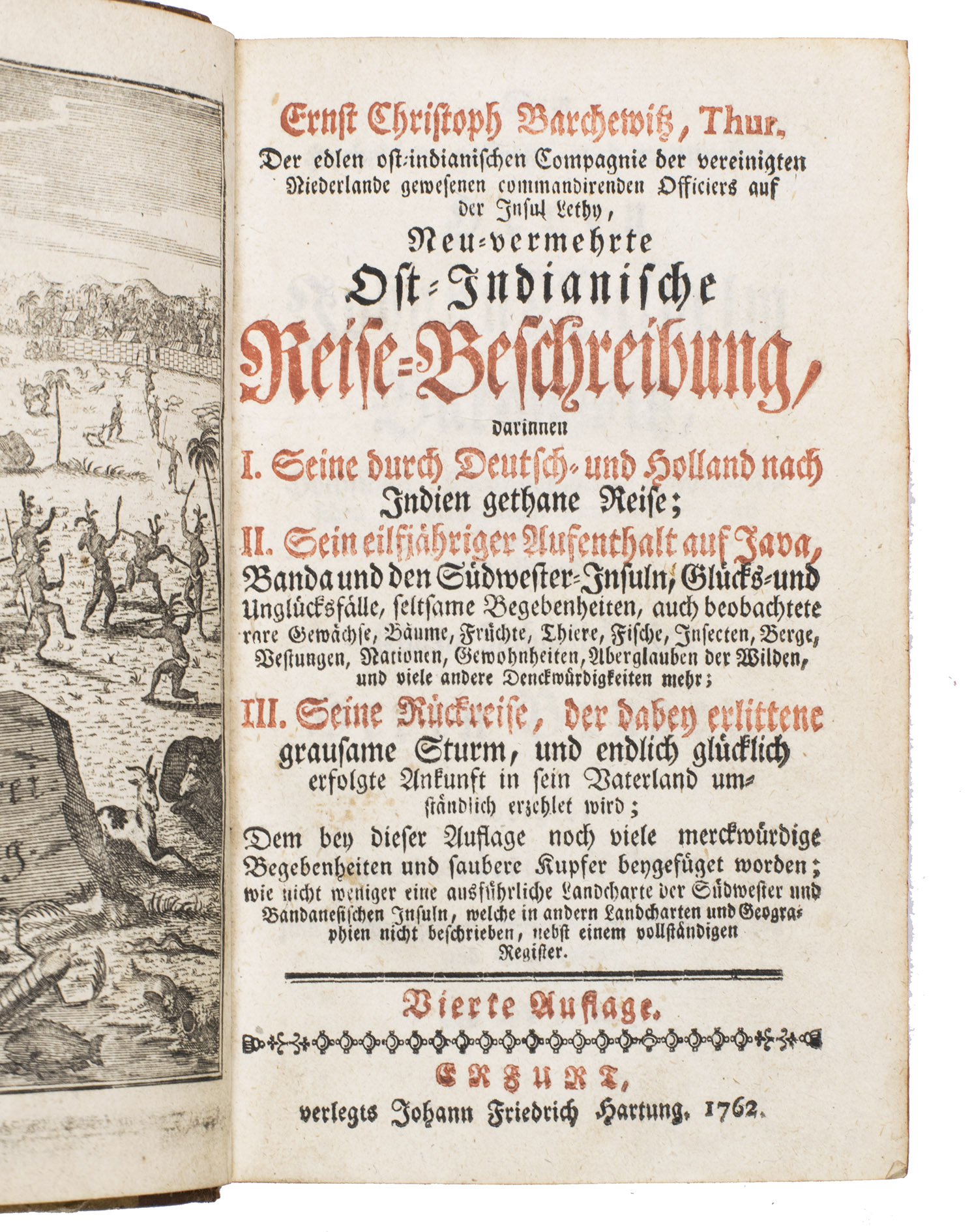 German Ernst Christoph Barchewitz (1687-1758) left his hometown Erfurt in 1707 to travel. He eventually reached Rotterdam, where he was employed by the VOC. In 1711, he embarked on a journey to the East Indies and became the Governor of the Island of Leti. Barchewitz reports extensively on his vicissitudes and gives interesting information on the local natural history, inhabitants and their customs. He also makes mention of sightings of mermaids. The illustrations depict views of Cape of Good Hope with pictures of Hottentots, the Island Banda, Leti, buildings in Batavia, Ambon, and trees and fruits. The work also includes a map of the Banda Sea with its islands. Barchewitz returned to Erfurt in 1722, where he wrote his travel account. The present work is the fourth edition.