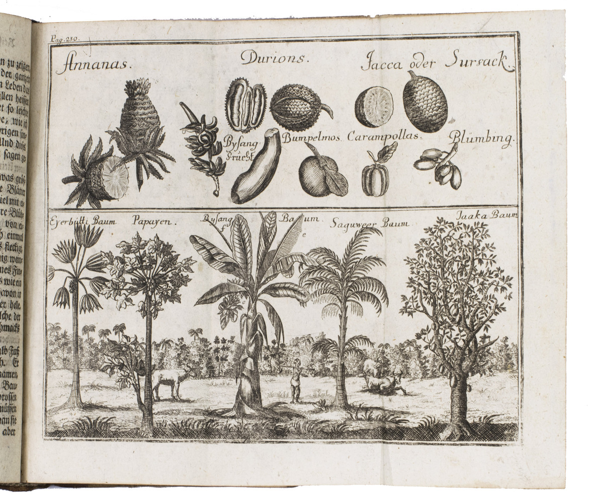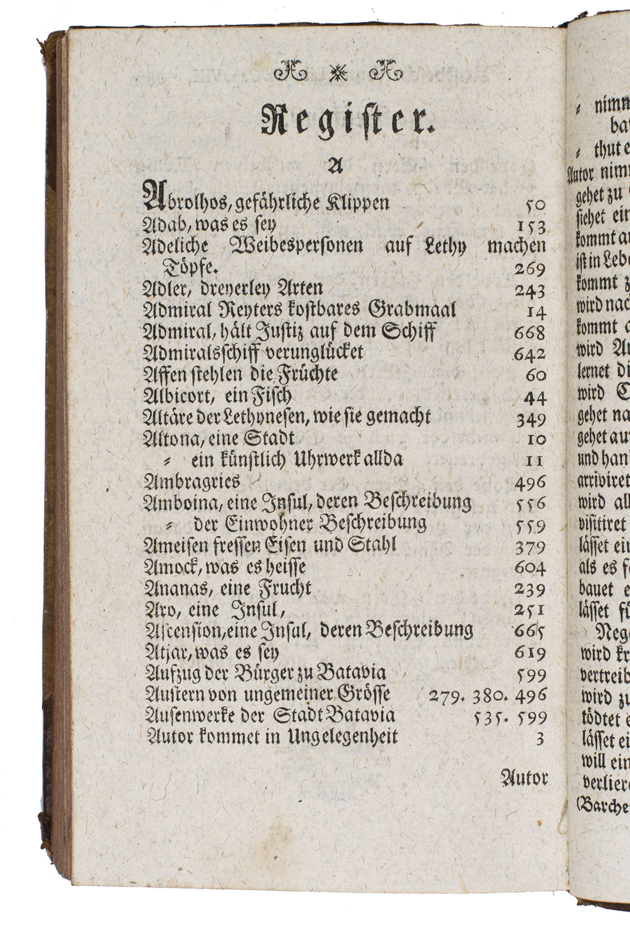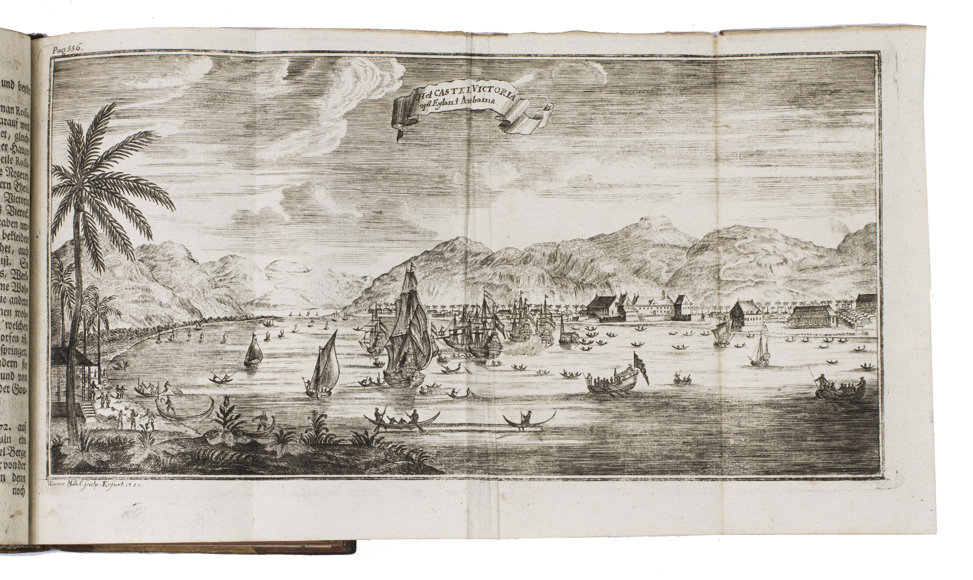 German Ernst Christoph Barchewitz (1687-1758) left his hometown Erfurt in 1707 to travel. He eventually reached Rotterdam, where he was employed by the VOC. In 1711, he embarked on a journey to the East Indies and became the Governor of the Island of Leti. Barchewitz reports extensively on his vicissitudes and gives interesting information on the local natural history, inhabitants and their customs. He also makes mention of sightings of mermaids. The illustrations depict views of Cape of Good Hope with pictures of Hottentots, the Island Banda, Leti, buildings in Batavia, Ambon, and trees and fruits. The work also includes a map of the Banda Sea with its islands. Barchewitz returned to Erfurt in 1722, where he wrote his travel account. The present work is the fourth edition.