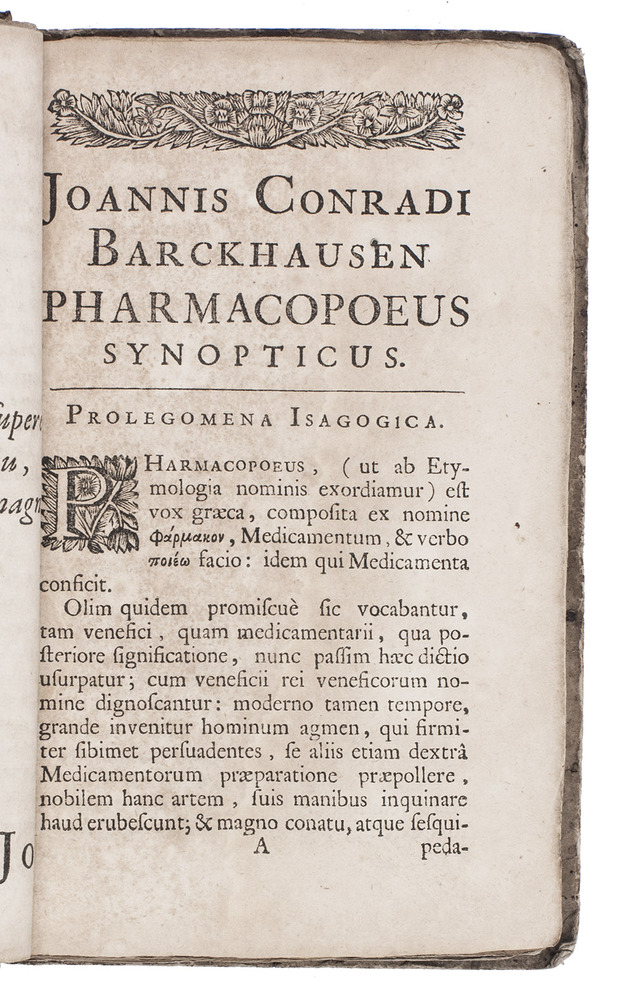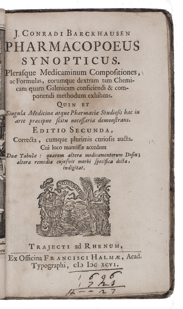 Johann Conrad Barchusen (1666-1723) was a pharmacologist, chemist, physician. At the University of Utrecht, he was the first person to teach chemistry as a specific subject (not just as part of medicine). He published four textbooks on chemistry and two on medicine. The Pharmacopoeus synopticus is the first, published in 1690 in Frankfurt. Our copy belongs to the second, revised edition, published in Utrecht; the third appeared in Leiden (T. Haak, 1712).