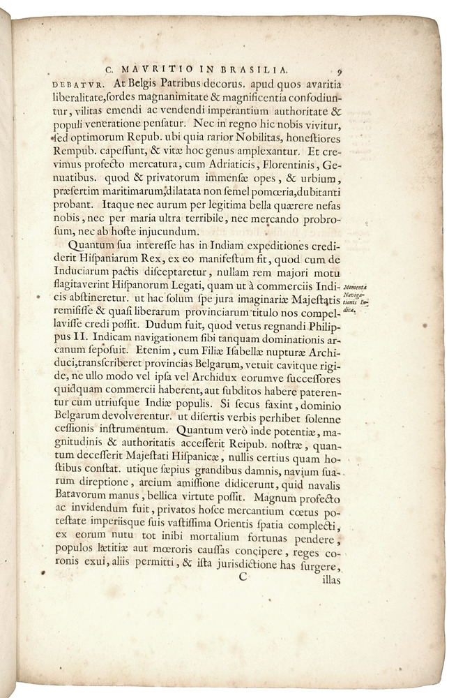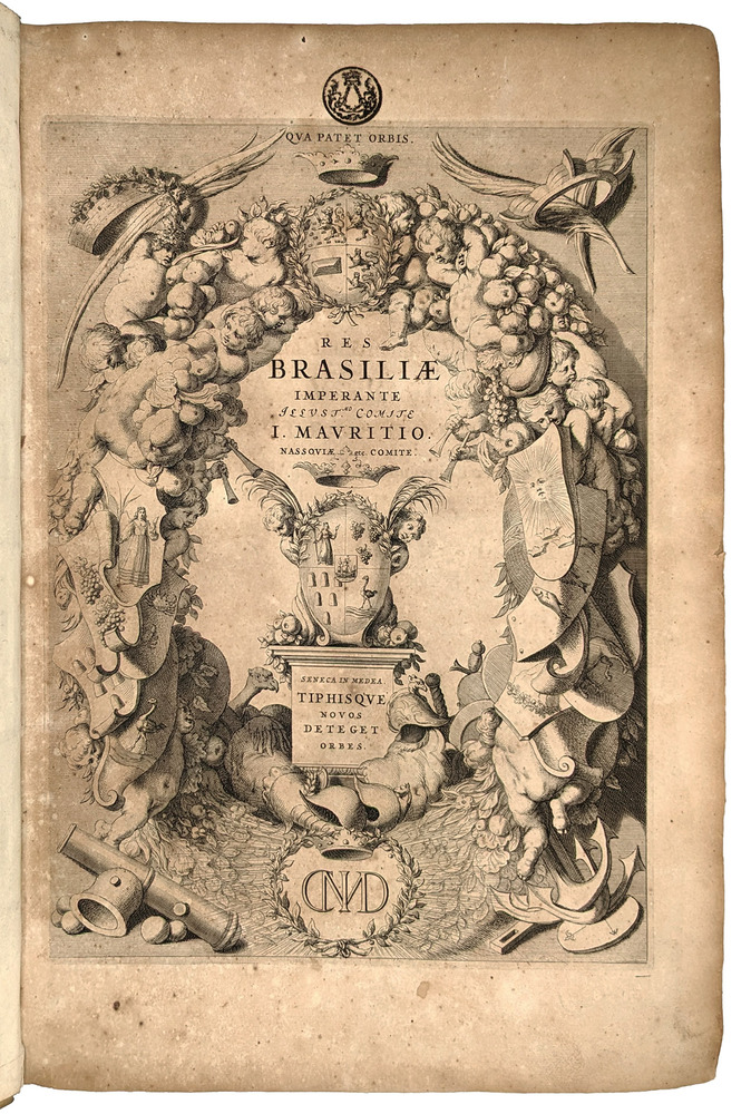 "... Barlaeus interwove passages about Johan Maurits´s actions as governor with descriptions of the geography, the flora and fauna, the population and the sugar plantations in the colony. His history painted a picture of a colonial administration that endeavored to be fair to everyone. Johan Maurits and his fellow governors appeased the Portuguese and the other population groups by means of a carefully-weighed balance of military presence and measures aimed at promoting prosperity and cooperation. They maintained sufficient troops to suppress any rebellion that might threaten... They protected the Indians in the colony from slavery in another guise, placed them under the authority of their own village elders and recruited them as auxiliary forces by rewarding them appropriately. They made allies of savage, cannibal Indians from the outlying areas and tried to civilize them. By promoting economic recovery, Johan Maurits and his fellow administrators did the whole population, including the black slaves, a service. They stopped the extortion of plantation owners by local commanders and restored peace and order to rural areas. They protected the inhabitants against the Portuguese incursions from Bahia and against raids by marauding Maroons in southern Pernambuco. By resuming the import of slaves and by selling on credit they ensured that the worforces on the plantations grew and sugar production increased. They promoted regulated free trade between the colony and the Netherlands to replace the WIC monopoly. This created the opportunity to establish fair prices for Brazilian exports and European imports and encouraged trade with the home country... Barlaeus was consequently able to conclude his history with praise for the governor..." (Van den Boogaart, Ernst. "A Well-Governed Colony: Frans Posts Illustrations in Caspar Barlaeuss History of Dutch Brazil." The Rijksmuseum Bulletin 59, no. 3 (2011): 236-71, p.238-239).