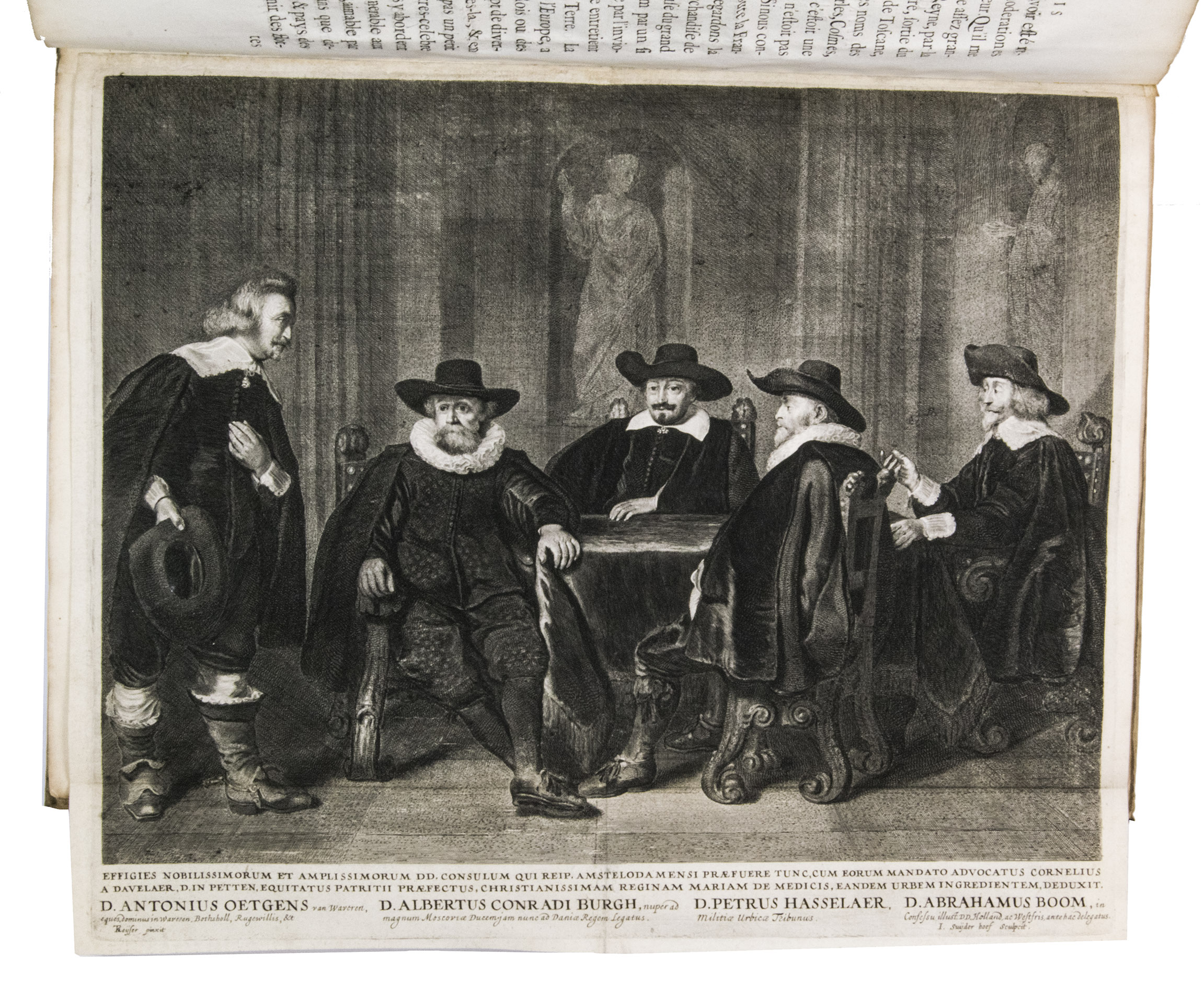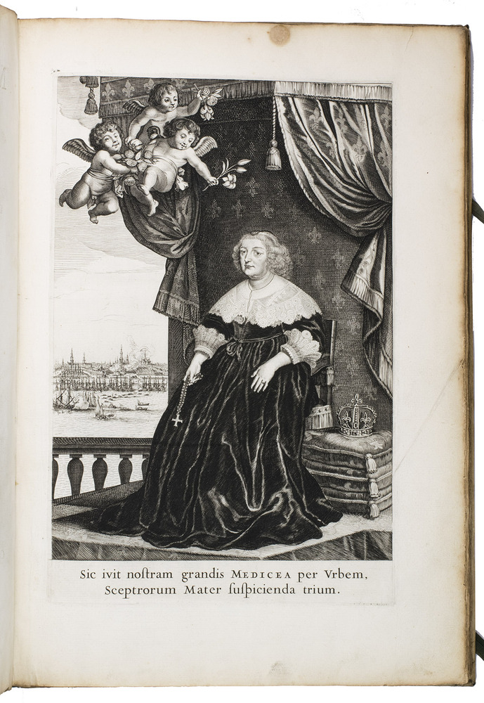 Superb large paper copy of the first edition in French of a beautifully illustrated Dutch Royal Entree book, with the extremely rare plate of the four burgomasters included. Published simultaneously in French and in Latin, it is the first official description of an entrance in the Northern Netherlands, a tradition which had flown over from the South. The ceremonial entry of Marie de' Medici (1575-1642) was an important moment in the history of Amsterdam. Although her presence was a politically sensitive issue, she was received with great honour. The present work, complete with all 17 engravings and the extra burgomasters plate, is a beautiful visual and textual homage to this event.