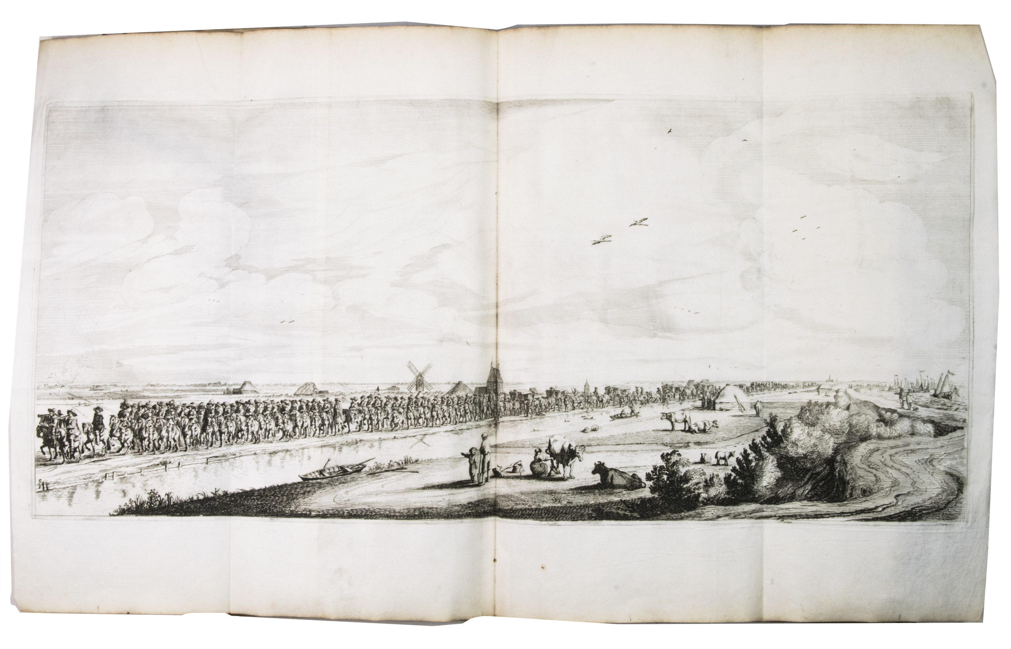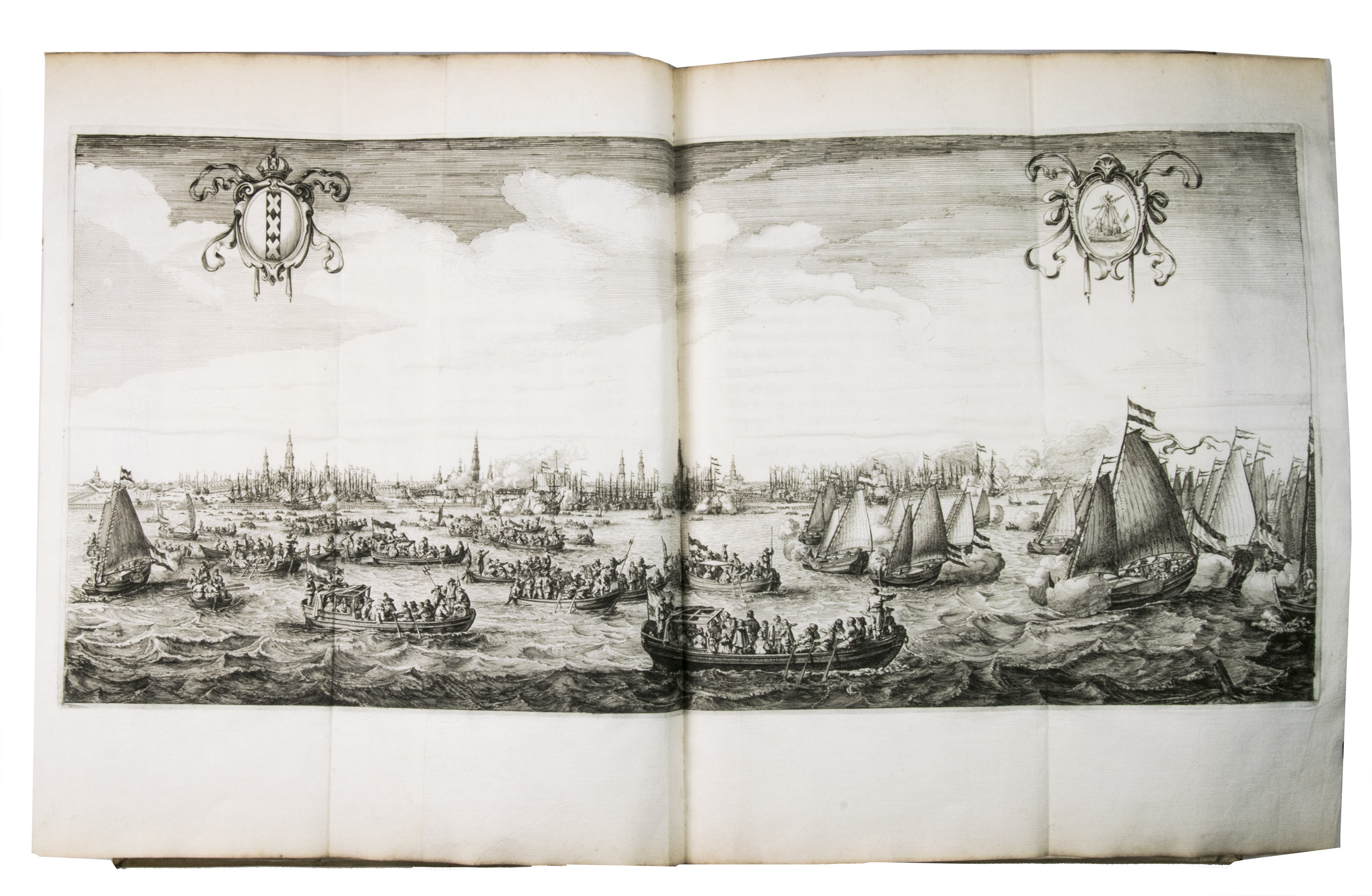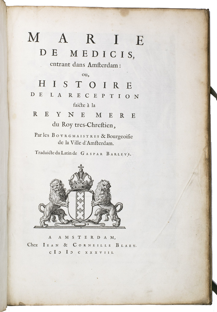 The work is especially known for its impressive plates, which are known to have had either two or three different states, depending on the plate. In the present copy, all plates are in their second state. This is easily recognisable by the lack of numbers at the very bottom of the plates, but the addition of the view of Amsterdam on the frontispiece portrait of Marie de' Medici, and the coats-of-arms at the top of the folding plate with the view of Amsterdam from the IJ. Copies with plates in early states are also usually larger than those with plates in later states. This is the case here, as the present copy is extremely large, with very ample margins.