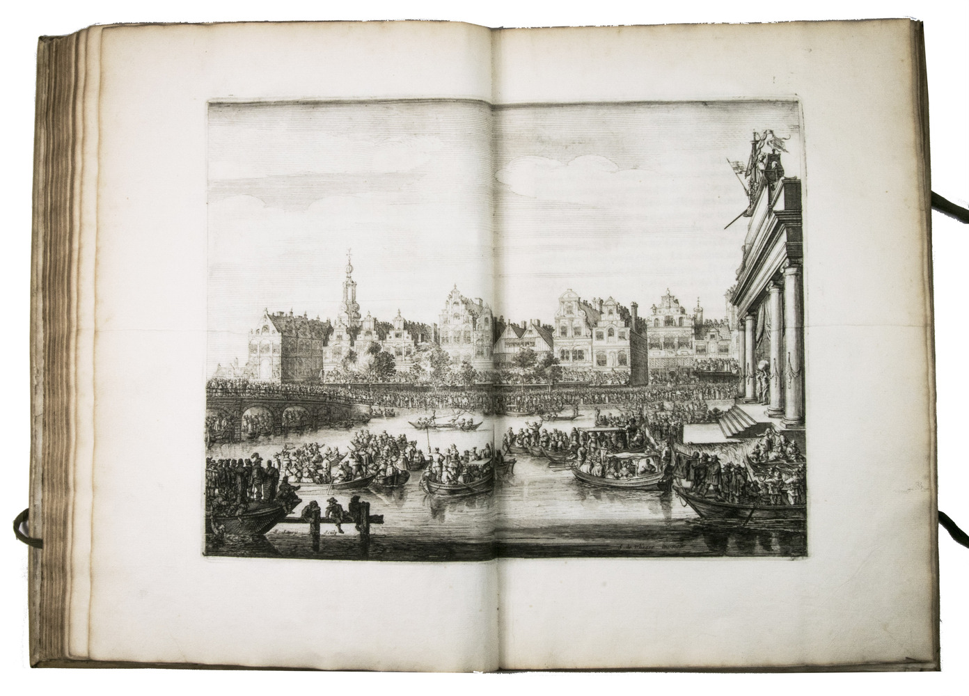 The beautiful plates were drawn and engraved by different artists. Nine were engraved after Claes Moeyaert (1592-1655), who designed the triumphal arch built for De' Medici's entry, as well as the dramatic tableaux based on her life that were shown to her. These 9 engravings depict these tableaux. The portrait of Marie de' Medici, is drawn after a painting by Gerard van Honthorst (1592-1656). The remaining 7 plates, engraved by Salomon Savery (1594-1666), represent the festival in exceptional detail. The folding plate, for example, shows the hundreds of boats and ships in the IJ, with the city in the background. The other topographic plates show the old city hall (burned down in 1652) and weigh house (demolished in 1808) on the Dam, and the triumphal arches built for the occasion (1 on an artificial island). The very rare plate of the four burgomasters was engraved by I. Suyderhoef and is only present in a few copies.