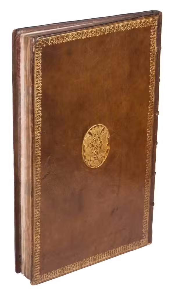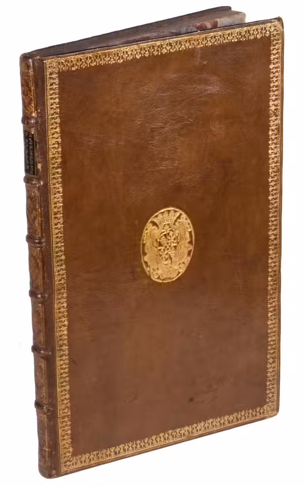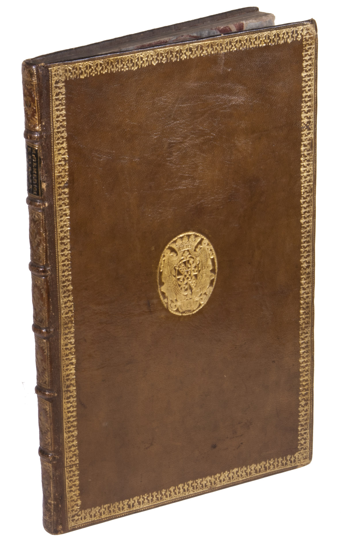 Amsterdam, Joan & Cornelis Blaeu, 1638. Folio. With 17 engraved plates (1 frontispiece, 15 double page, and 1 folding), a woodcut coat-of-arms of the city of Amsterdam on the title-page, and two decorated woodcut initials. Near contemporary gold-tooled brown morocco, with the coat-of-arms of the Comte de Calenberg on both boards, a black morocco title label on the spine lettered in gold, gold-tooled board edges, gilt edges, marbled end papers. 97, [3 blank] pp.