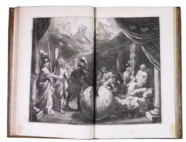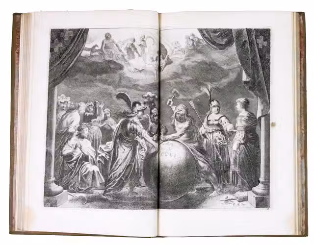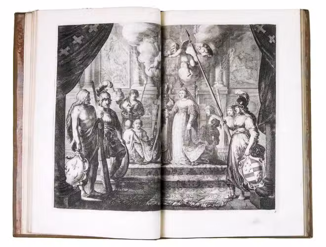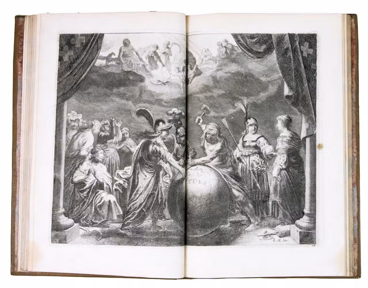 With an owner's inscription on the back of the front flyleaf ("call to pert: HB. Marck. 1850"). The corners of the boards are very lightly scuffed, the boards are lightly bumped and rubbed, with a small hole on the hinge on the back. The 17th-century marbled end papers have been repaired in the gutter with 19th-century marbled paper, the title page is somewhat browned and has been reinforced in the inner margin, a small water stain in the lower outer corner throughout, without affecting the text or plates. Otherwise in very good condition. Landwehr, Splendid ceremonies 109; Hollstein XIV, Nolpe 86-94; Hollstein XXIV, Saverij 144 a-h; Lipperheide 2665; Muller, Nederlandse historieplaten 1793 & supplement 1793; Snoep, Praal en propaganda, pp. 39-76; STCN 85007293X (11 copies); Vinet 489.