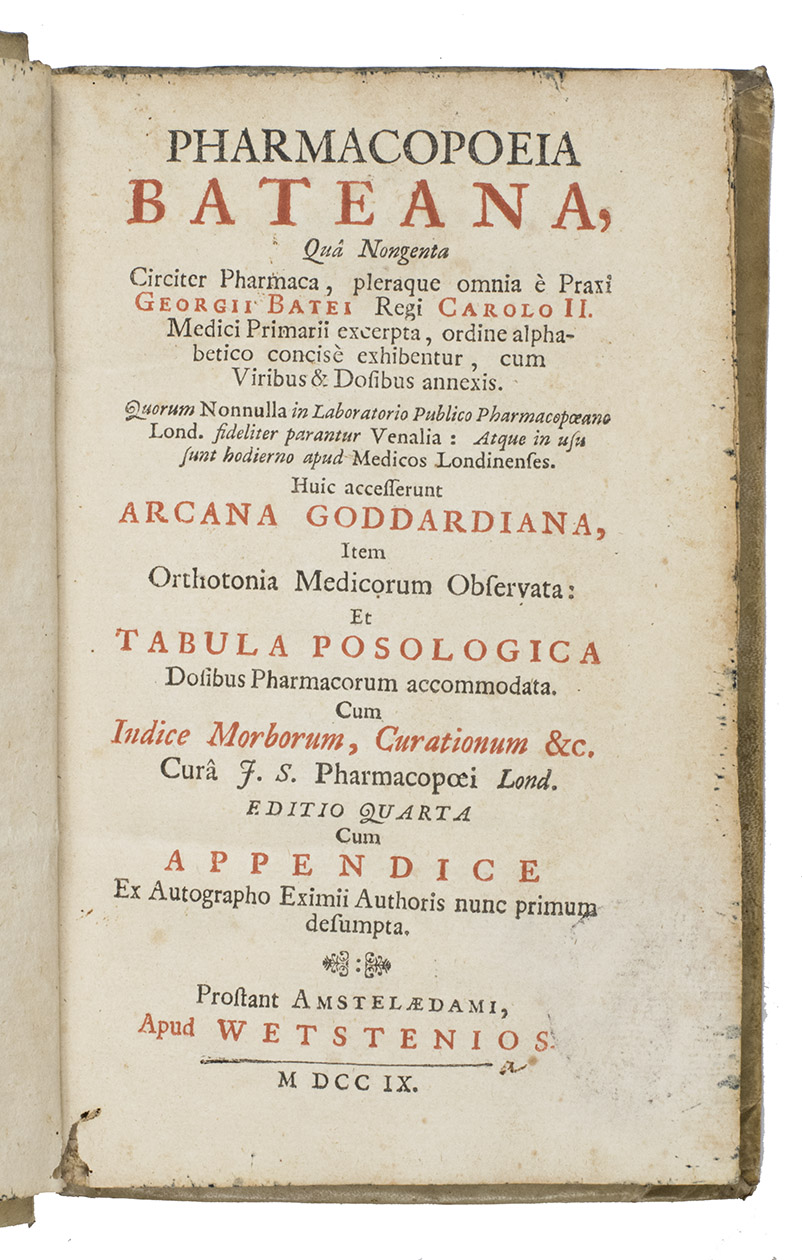 Pharmacopoeia Bateana, quâ nongenta circiter pharmaca, pleraque omnia è praxi Georgii Batei ... excerpta ... cum viribus, & dosibus annexis. ... Huic accesserunt Arcana Goddardiana, item Orthotonia medicorum observata: et Tabula posologica ... Cum indice morborum, curationum &c. Curâ J.S. Pharmacopoei Lond. Editio quarta cum appendice ex autographo eximii authoris nunc primum desumpta.