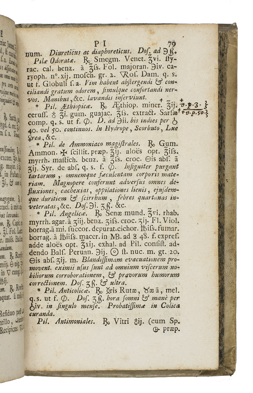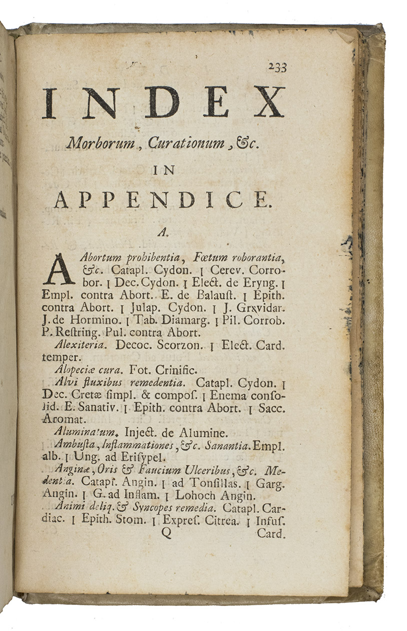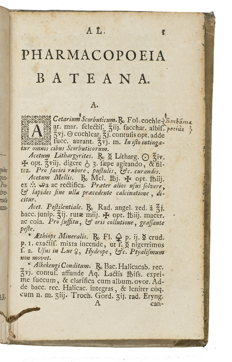 The first true Amsterdam edition (calling itself the fourth Latin edition, but apparently ignoring the 1702 Frankfurt and 1703 Venice editions) of the famous Pharmacopoeia Bateana, an internationally authoritative collection of pharmacological recipes and prescriptions compiled posthumously by James Shipton from the papers of the British physician George Bate (1608-1668/69), first published at London in 1688. The first edition was also reissued with a 1688 Amsterdam imprint. The 1691 edition first added the "Arcana Goddardiana" with recipes by Jonathan Goddard (1607-1675). The Wetsteins published further editions that they called the fifth (1719) and sixth (1731).