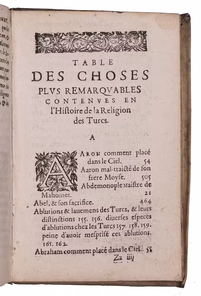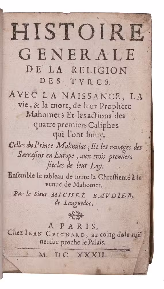 Second edition of "the most complete treatment of Islam up to its time in France" (Atabey). Written by Micheal Baudier (ca. 1589-1645), historiographer to the Court of France. The book is presented as a history of the religion of the Turks, who controlled, at that time, a large part of the Islamic world, and gives a detailed description of Islam and its prophet Muhammad.