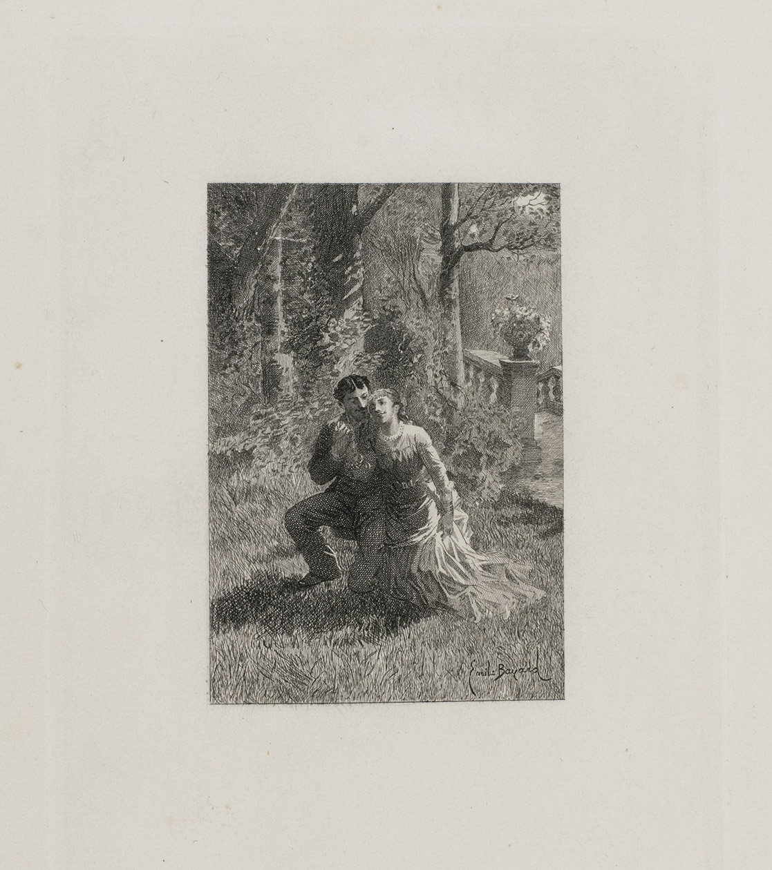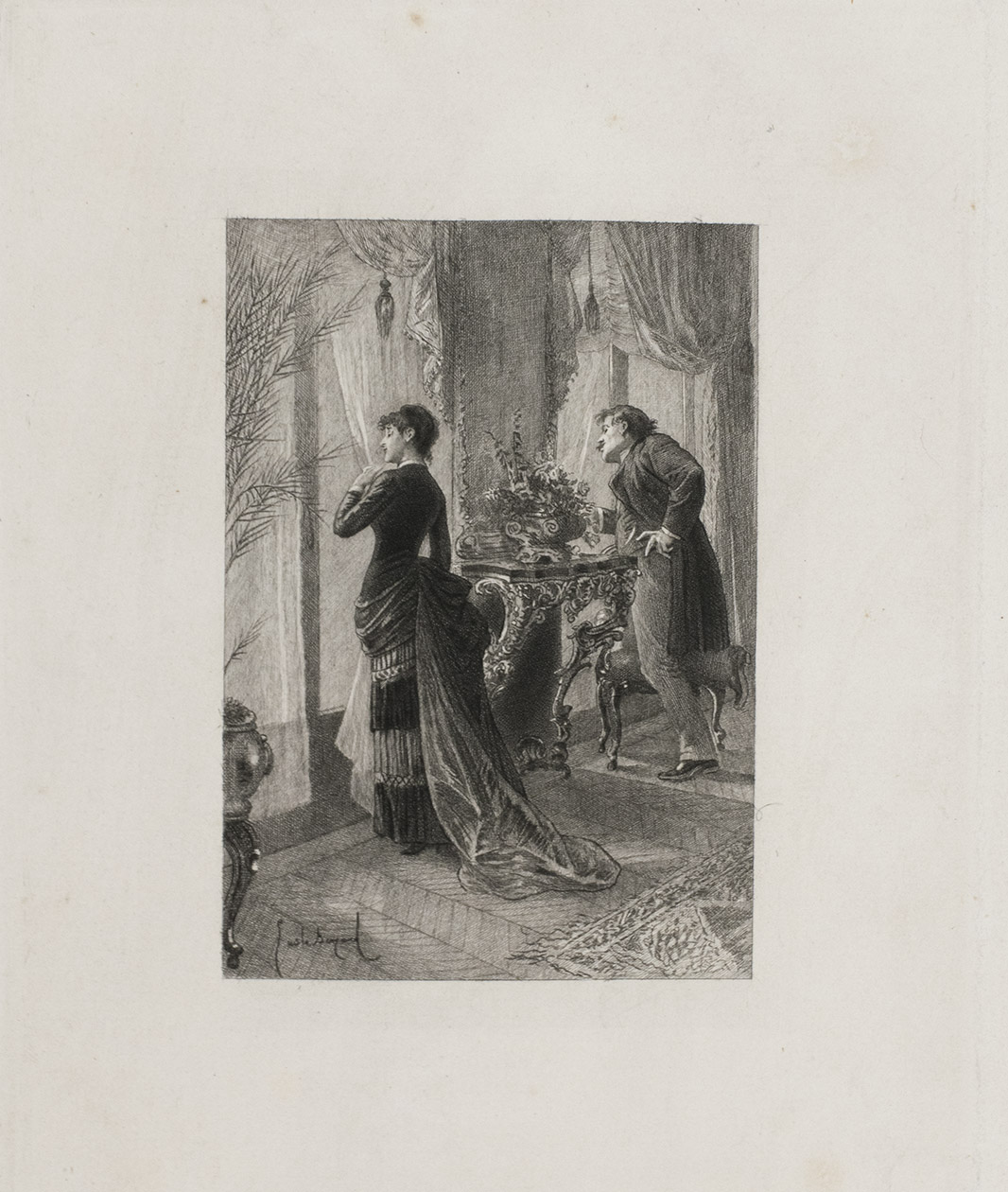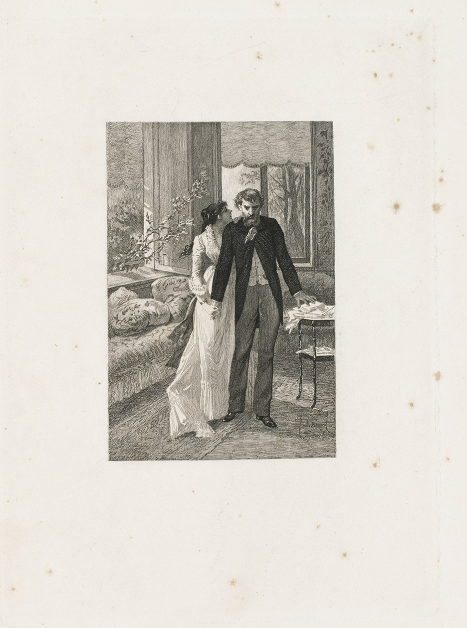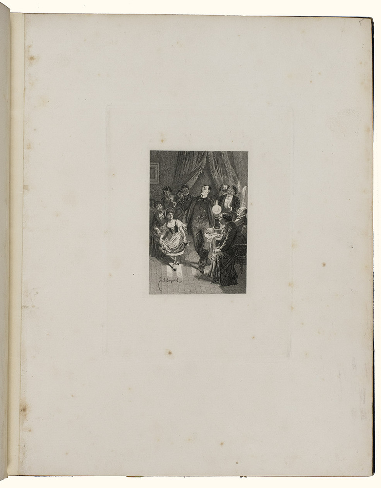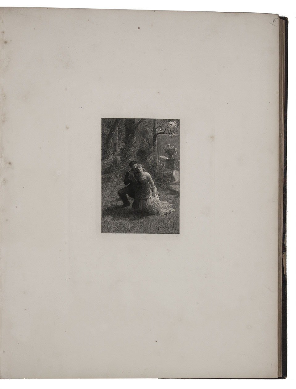 An extensive collection of proof impressions of all 12 illustrations drawn by Émile Bayard (1837-1891) and engraved by Jules Massard (1848?-1891?) and Eugène Michel Joseph Abot (1836-1894) for the 1885 edition of Alphonse Daudet's Fromont jeune et Risler aîné. Moeurs parisiennes. This novel, first published in 1874 was a great critical and popular success, quickly making Daudet's name famous. As a result it went through many editions, some luxuriously illustrated. The definitive illustrations were published by Louis Conquet in Paris in 1885 in a limited edition (500 copies) of the novel with the present twelve masterly plates "gravées à l'eau-forte" after Bayard. The present set has 4 to 8 impressions of each plate, most or all in 4 or more states. All have the engraved signature of the artist in the image area, but only two have any further engraved text. The first proof of the first plate has "E. Abot aqua f d'après E. Bayard" and the last proof of the same plate has "Jules Massard. sc.", both in the plate below the image. The engraving is usually credited to Massard, but it would appear from this early proof that Abot began the work and Massard finished it. The last proof of the eleventh plate has the pencilled initials of the artist, "E. B." below the image, apparently in his own hand.