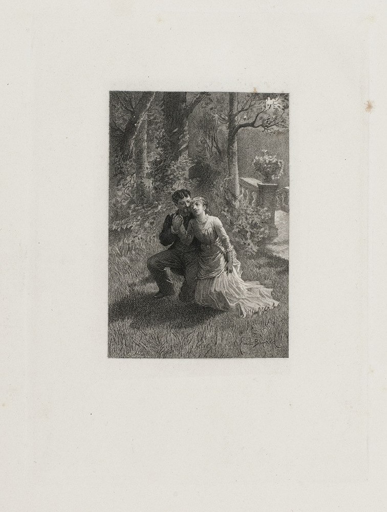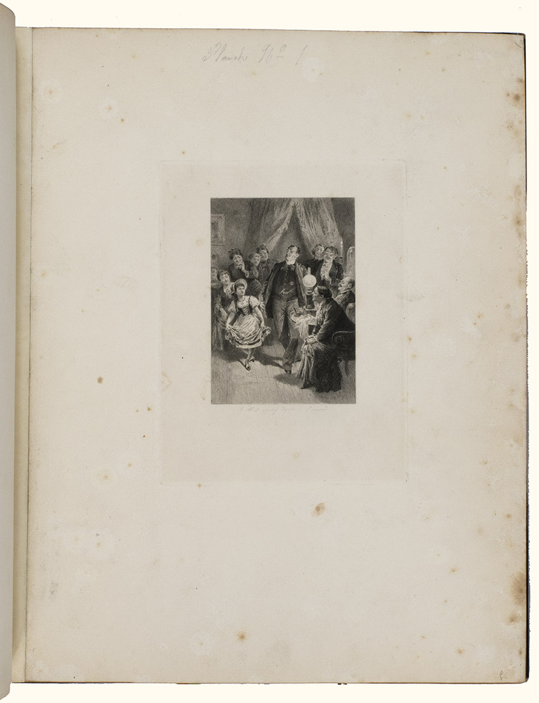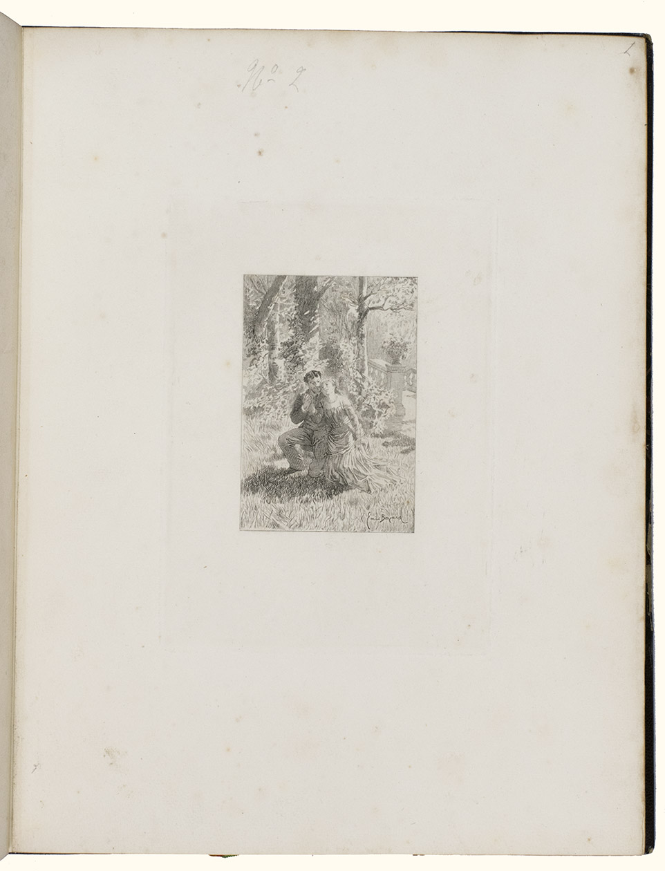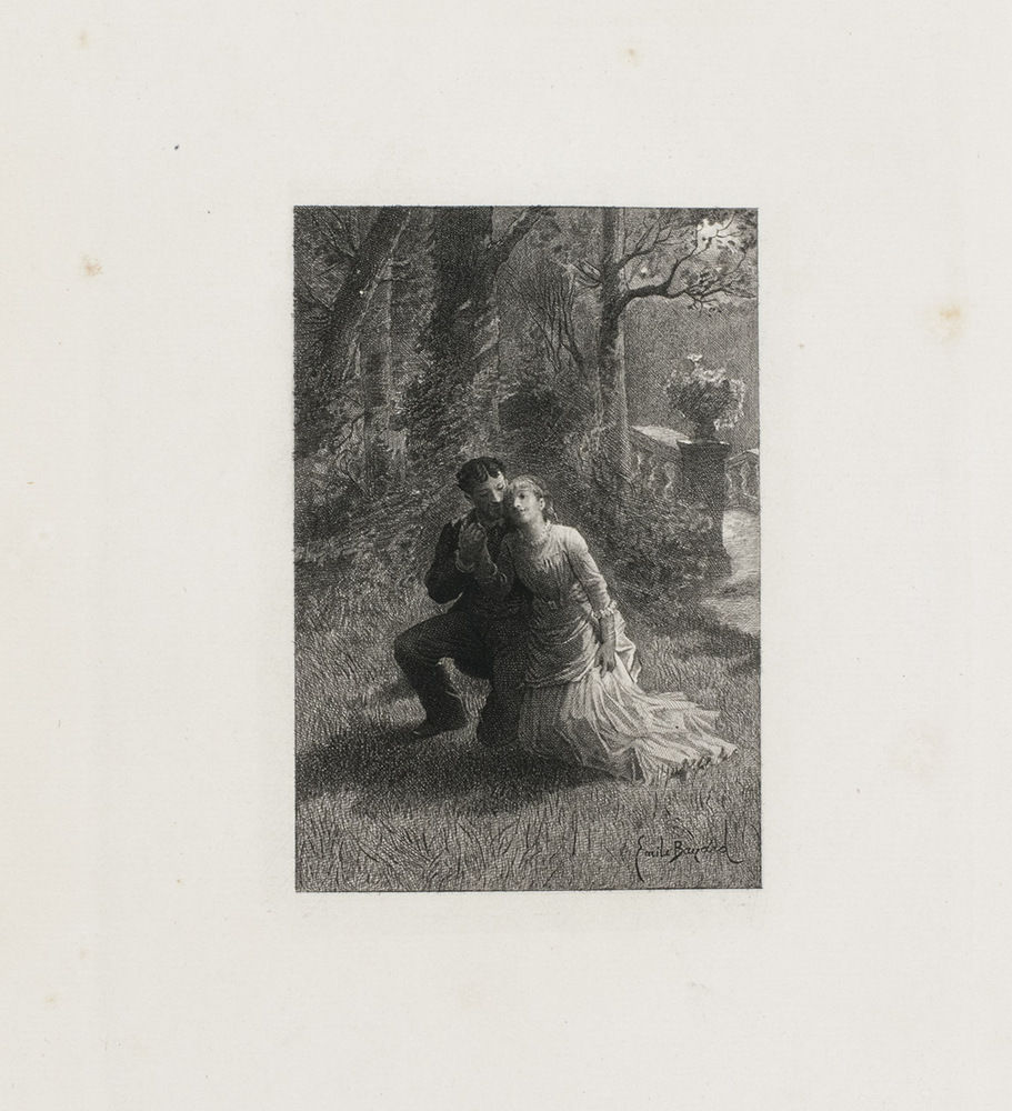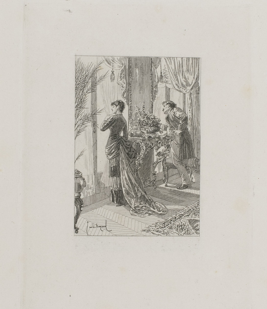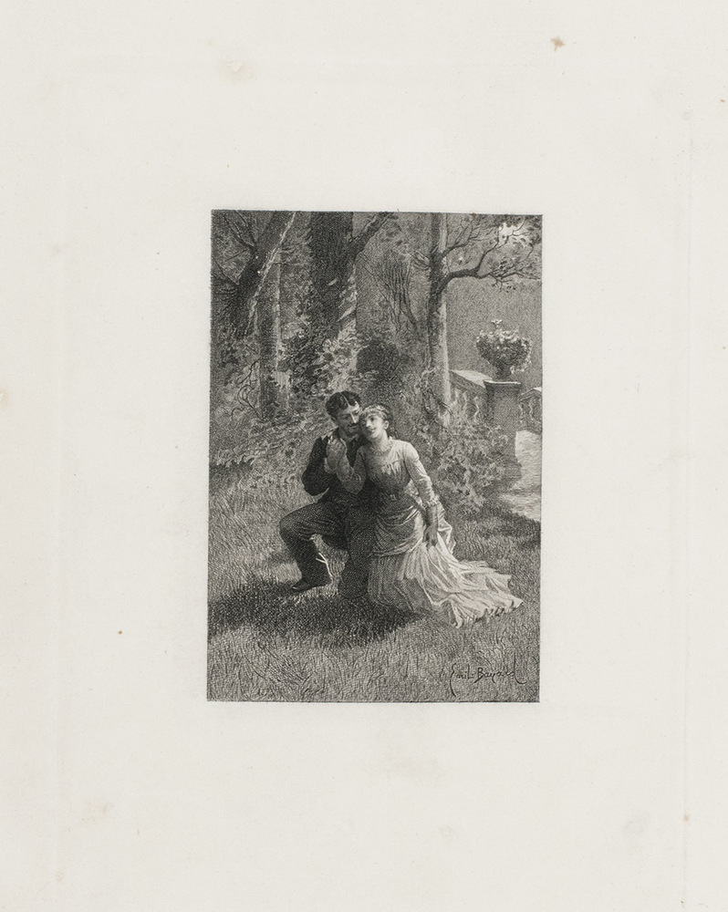 An extensive collection of proof impressions of all 12 illustrations drawn by Émile Bayard (1837-1891) and engraved by Jules Massard (1848?-1891?) and Eugène Michel Joseph Abot (1836-1894) for the 1885 edition of Alphonse Daudet's Fromont jeune et Risler aîné. Moeurs parisiennes. This novel, first published in 1874 was a great critical and popular success, quickly making Daudet's name famous. As a result it went through many editions, some luxuriously illustrated. The definitive illustrations were published by Louis Conquet in Paris in 1885 in a limited edition (500 copies) of the novel with the present twelve masterly plates "gravées à l'eau-forte" after Bayard. The present set has 4 to 8 impressions of each plate, most or all in 4 or more states. All have the engraved signature of the artist in the image area, but only two have any further engraved text. The first proof of the first plate has "E. Abot aqua f d'après E. Bayard" and the last proof of the same plate has "Jules Massard. sc.", both in the plate below the image. The engraving is usually credited to Massard, but it would appear from this early proof that Abot began the work and Massard finished it. The last proof of the eleventh plate has the pencilled initials of the artist, "E. B." below the image, apparently in his own hand.