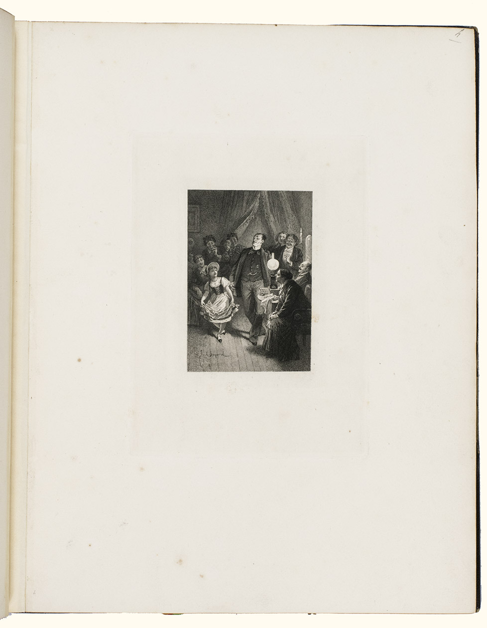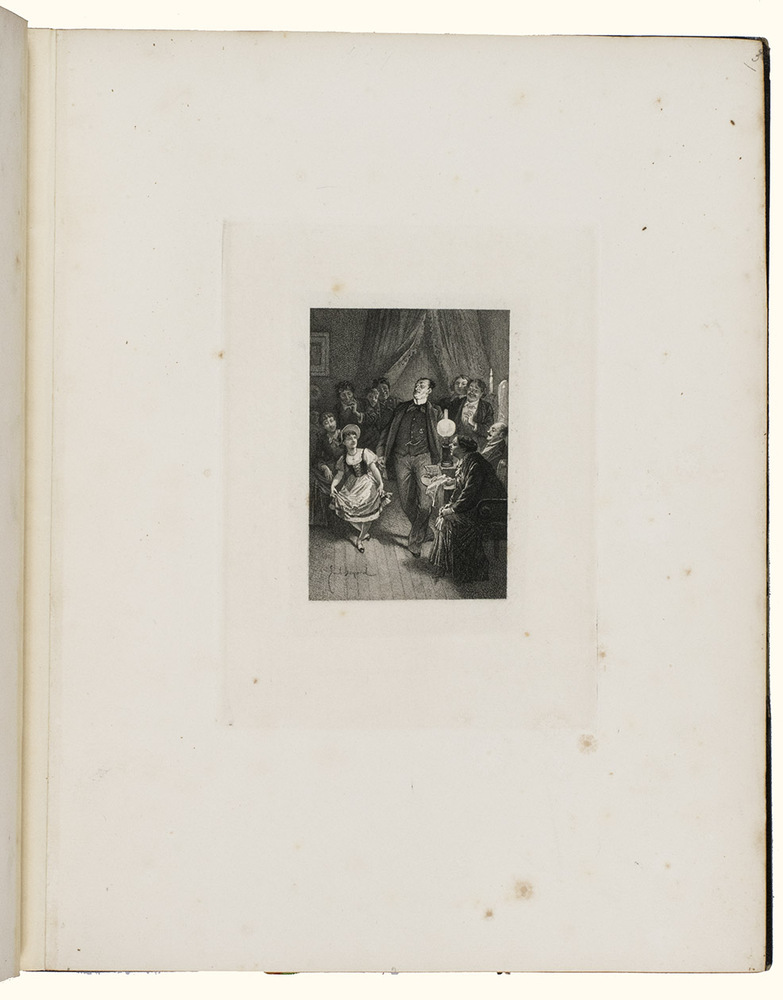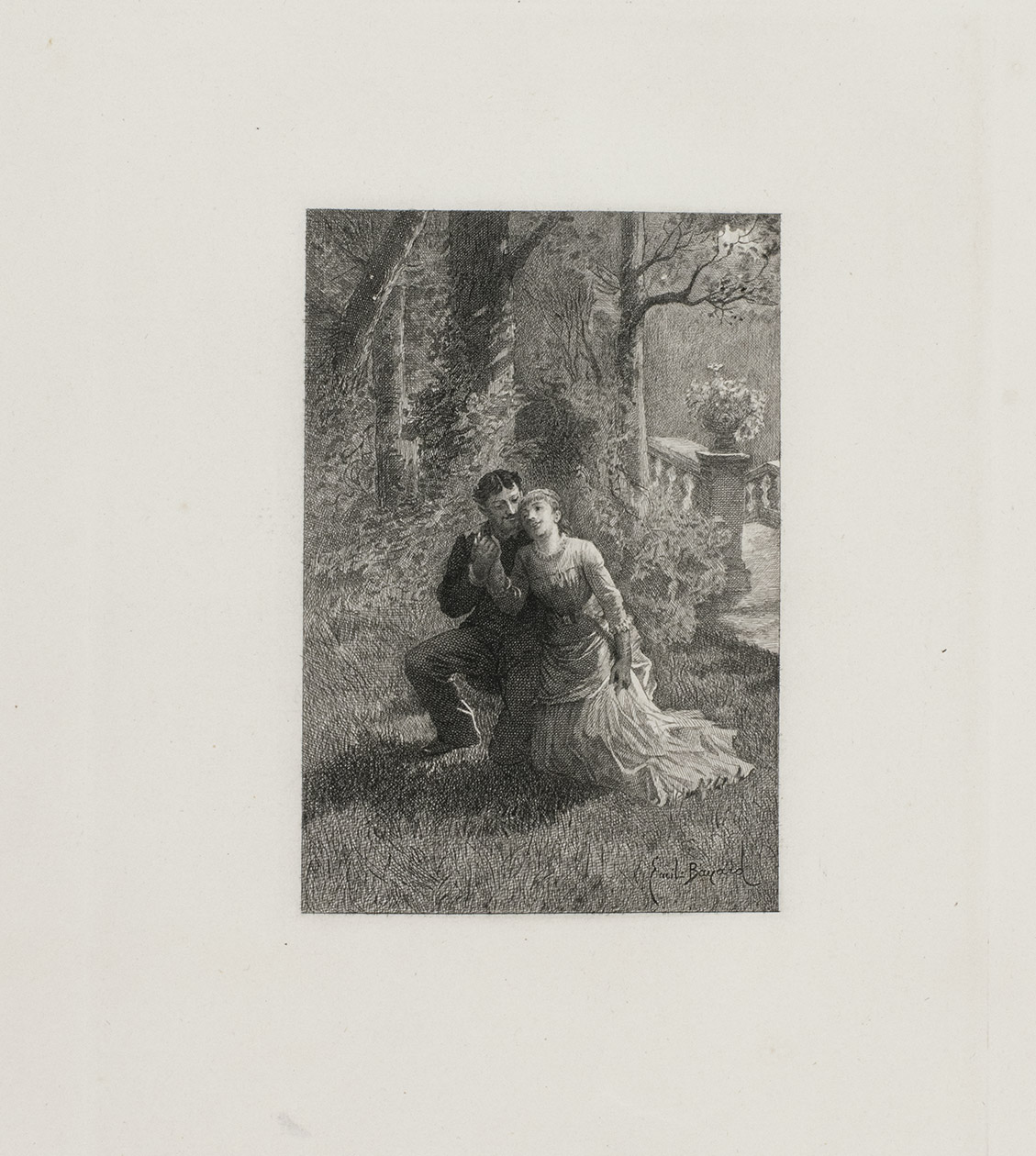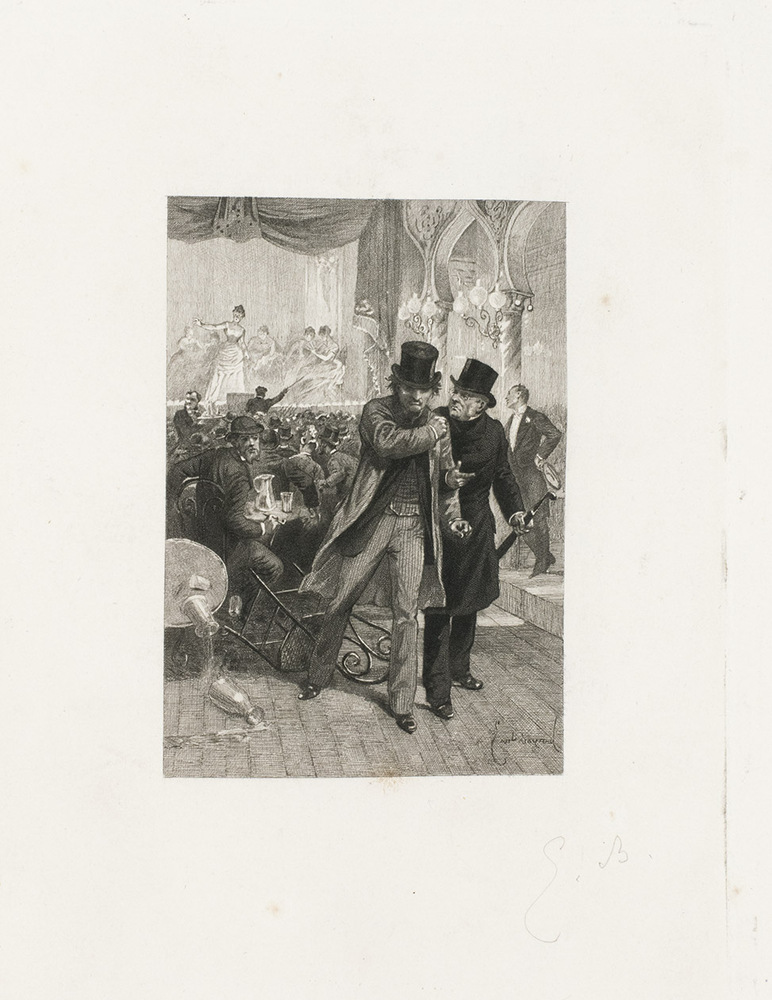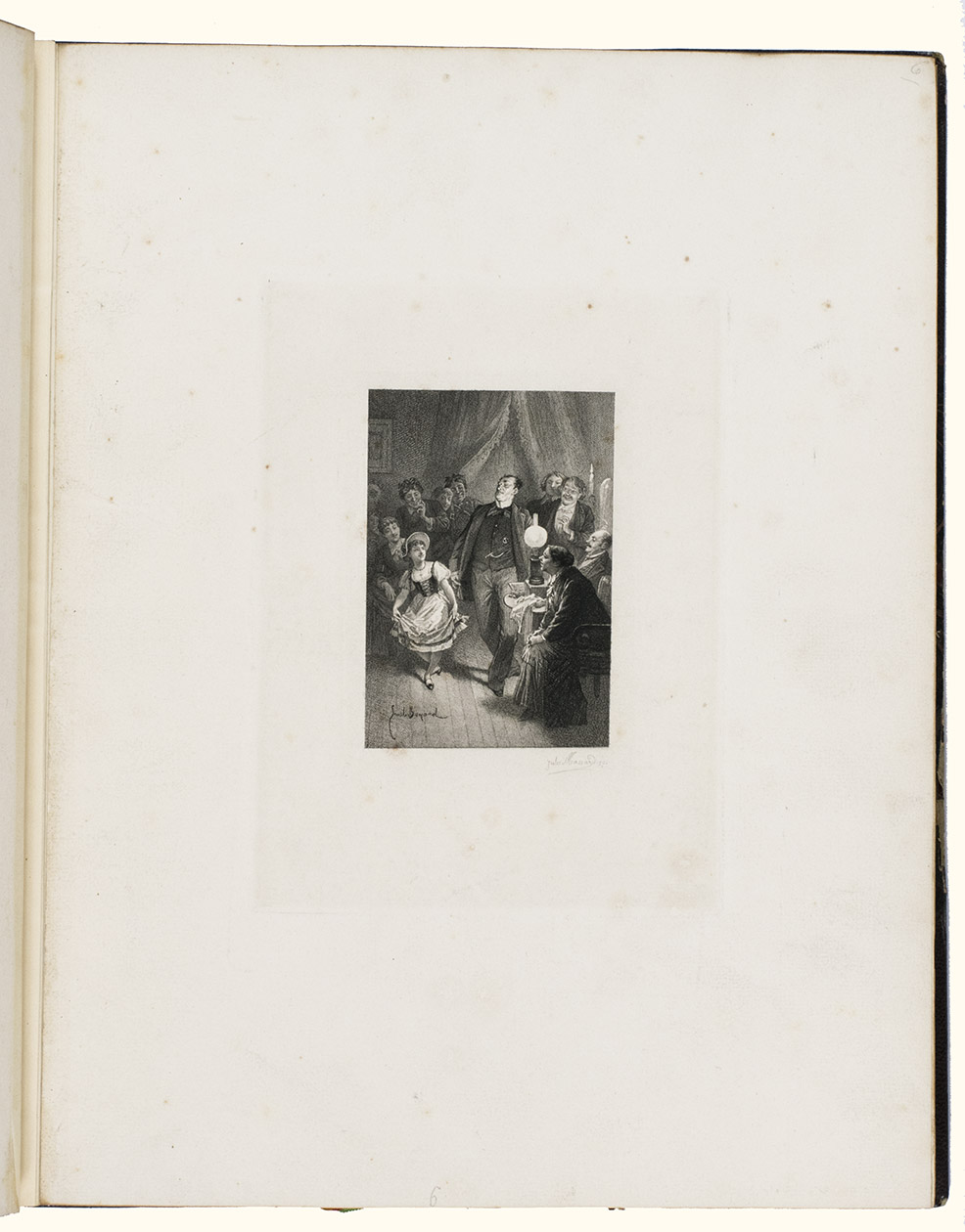 An extensive collection of proof impressions of all 12 illustrations drawn by Émile Bayard (1837-1891) and engraved by Jules Massard (1848?-1891?) and Eugène Michel Joseph Abot (1836-1894) for the 1885 edition of Alphonse Daudet's Fromont jeune et Risler aîné. Moeurs parisiennes. This novel, first published in 1874 was a great critical and popular success, quickly making Daudet's name famous. As a result it went through many editions, some luxuriously illustrated. The definitive illustrations were published by Louis Conquet in Paris in 1885 in a limited edition (500 copies) of the novel with the present twelve masterly plates "gravées à l'eau-forte" after Bayard. The present set has 4 to 8 impressions of each plate, most or all in 4 or more states. All have the engraved signature of the artist in the image area, but only two have any further engraved text. The first proof of the first plate has "E. Abot aqua f d'après E. Bayard" and the last proof of the same plate has "Jules Massard. sc.", both in the plate below the image. The engraving is usually credited to Massard, but it would appear from this early proof that Abot began the work and Massard finished it. The last proof of the eleventh plate has the pencilled initials of the artist, "E. B." below the image, apparently in his own hand.