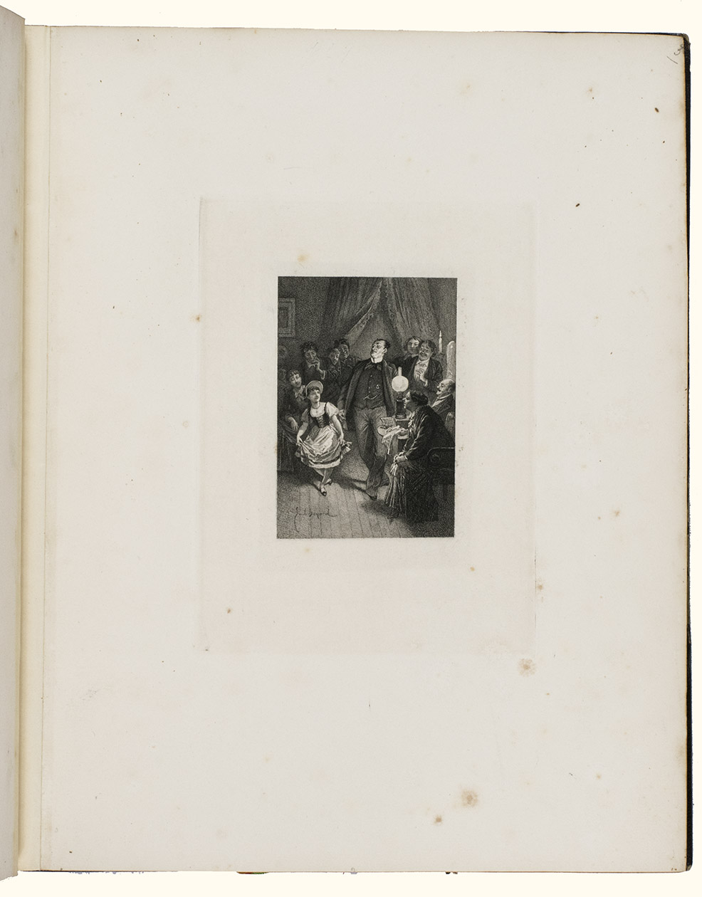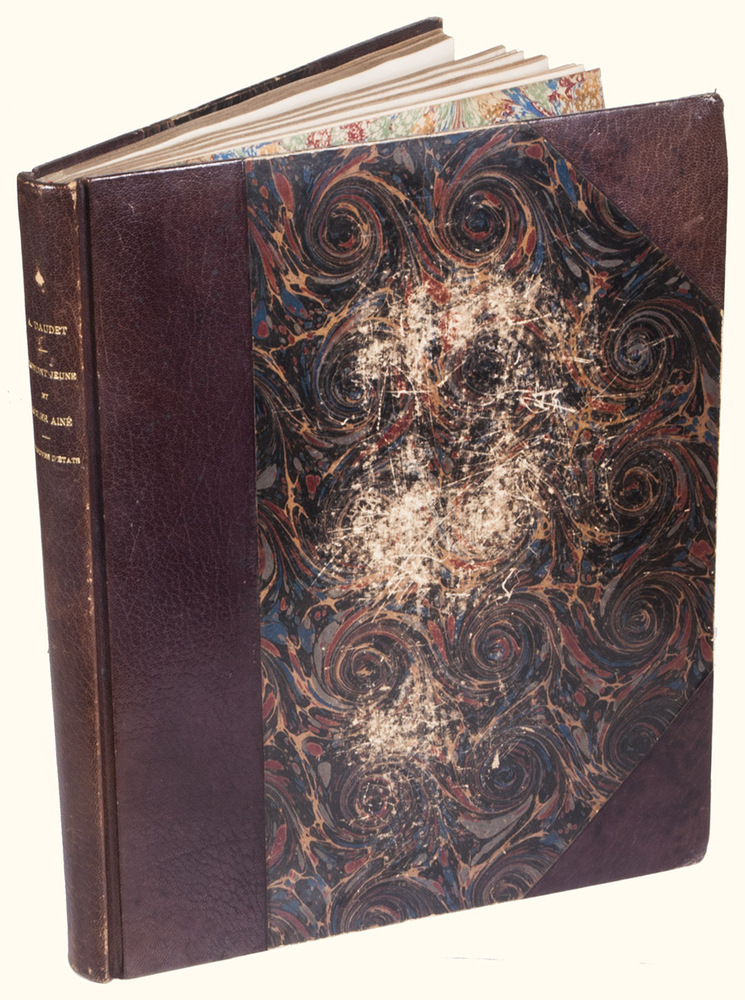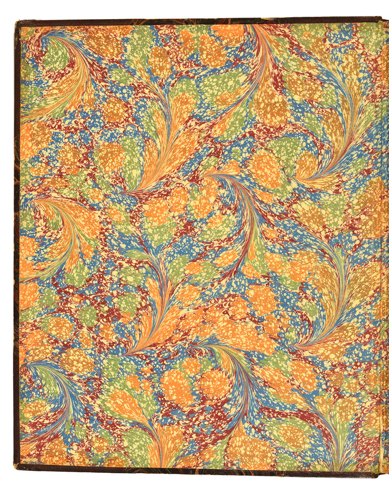 One example of one print is on wove paper, mounted on the leaf of the book, but all others are printed directly on the leaves. Their laid paper is watermarked "MBM" for Morel, Bercious and Masure, who developed machines for the Canson paper mill to make this so-called "mould-made" paper for the artist Jean-Auguste-Dominique Ingres in 1883. In very good condition, one plate with extensive foxing and a few others with very minor foxing. The marbled-paper sides of the binding are rubbed.
