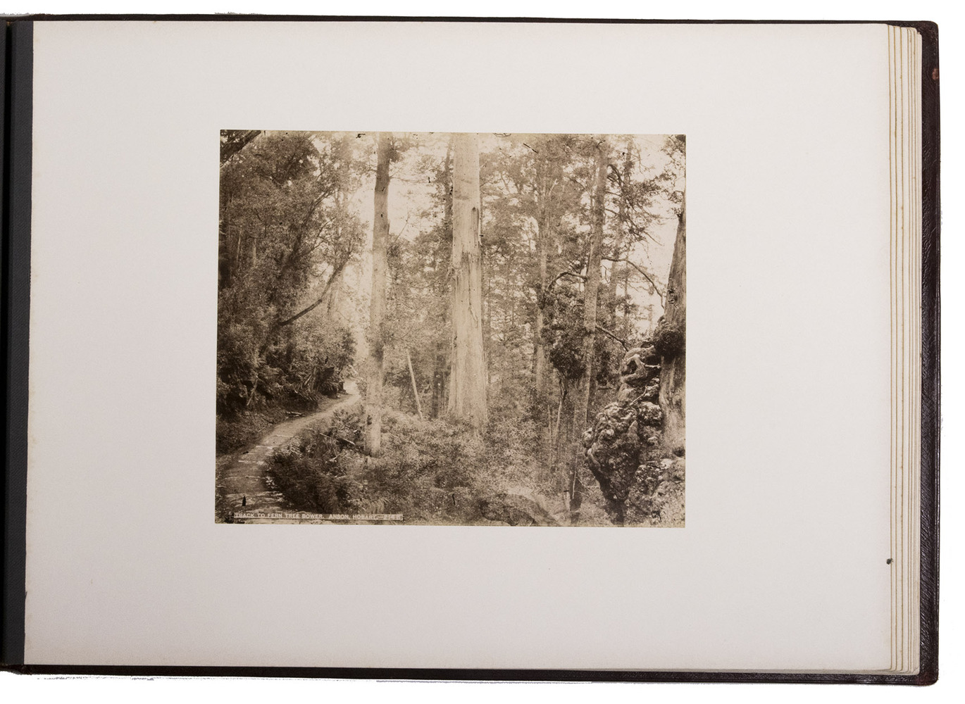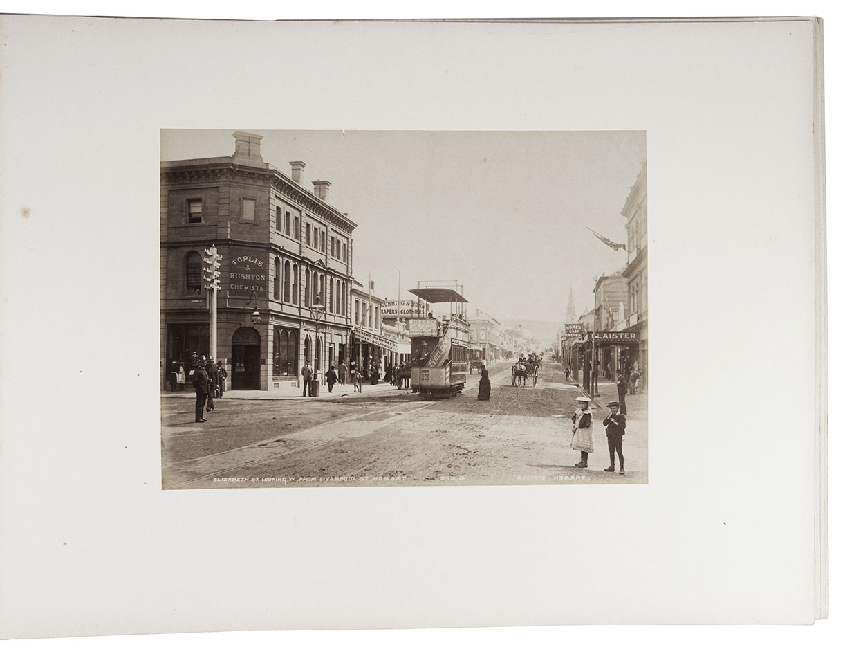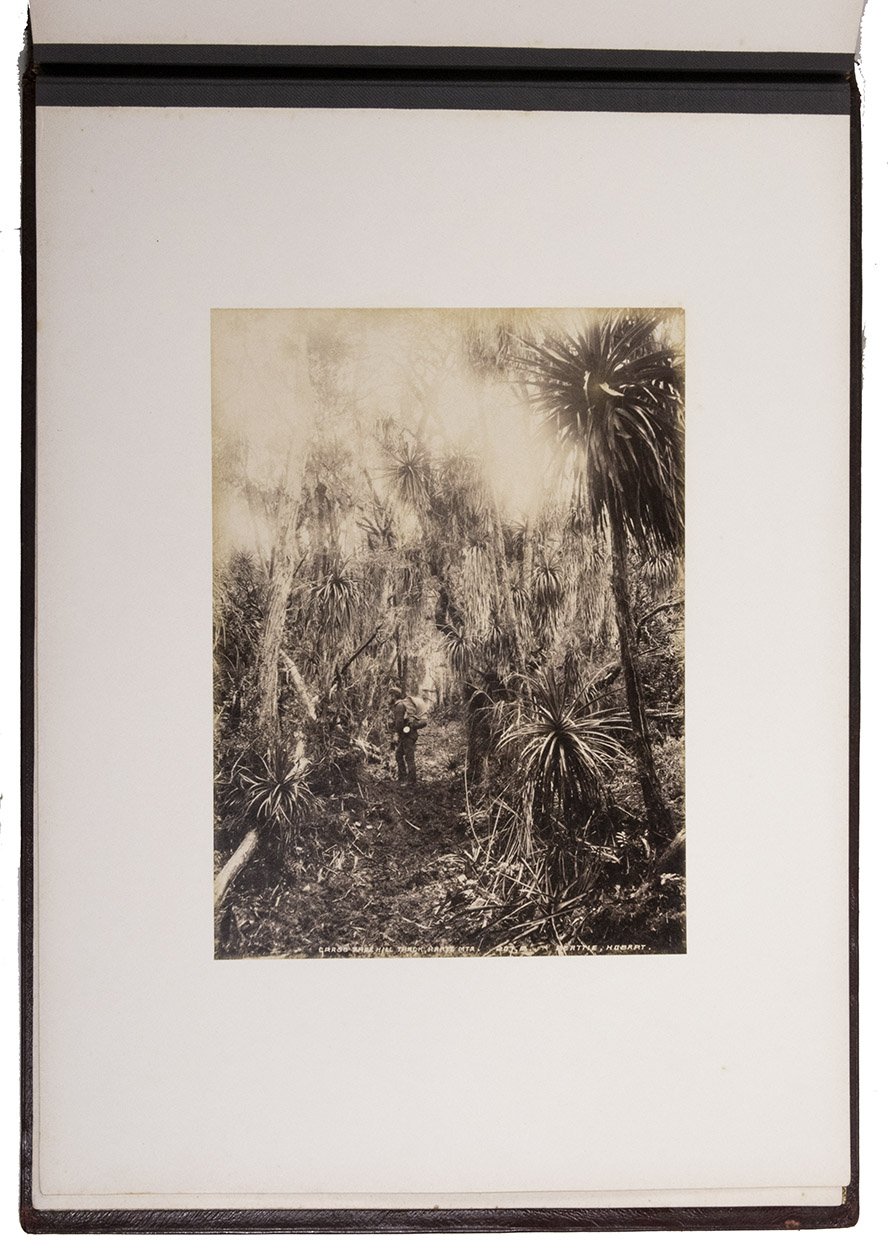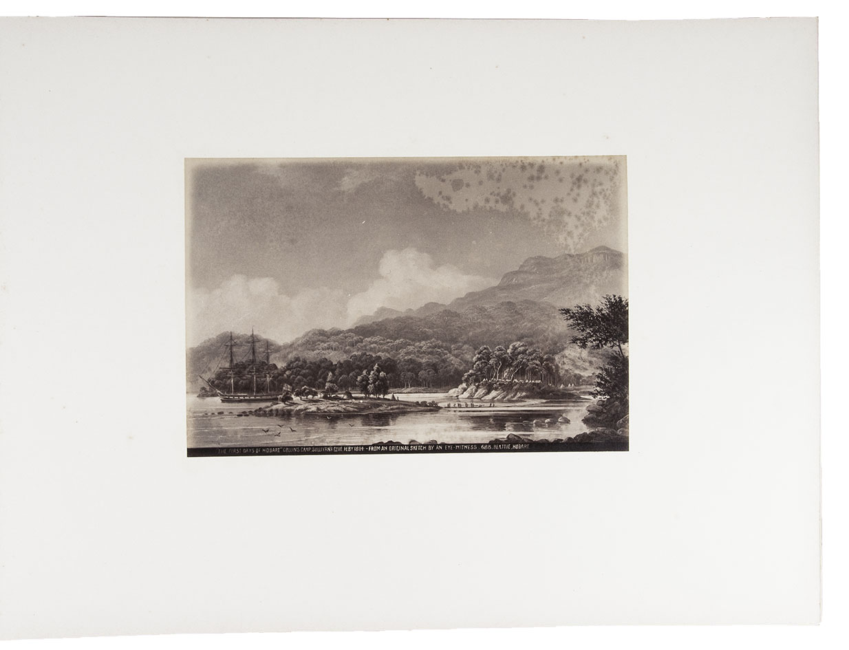 Beautifully bound album with a magnificent collection of 32 original photographs of Tasmania, made by John Watt Beattie (1859-1930) at the end of the 19th century. Beattie arrived in Tasmania in 1879 as an amateur dry-plate photographer of scenic views. He began to work with the Anson Brothers in 1882. In 1892, Beattie bought out the Anson Brothers' very large collection of large format studio portraits and negatives. The photographs include 10 views of Hobart and surroundings (including a view from the bay, a photograph of an original sketch by an eye-witness: "The first days of Hobart, Collins Camp, Sullivan's Cove, Feb. 1804", Elizabeth Street, Cathedral, Bellerive), Mount Wellington with hunter, Mount Ida, Lake St. Clair (3), Mount Byron & Cuvier, giant eucalyptus giant, cedar trees on way to Great Lake, Mount King William, from track to Arrowsmith, Track to Fern Tree Bower, forest views, Mount Olympus from Laura Creek, King Williams Pines, Lake Marion, Garrs Tree Hill track, Hartz Mountains, etc.