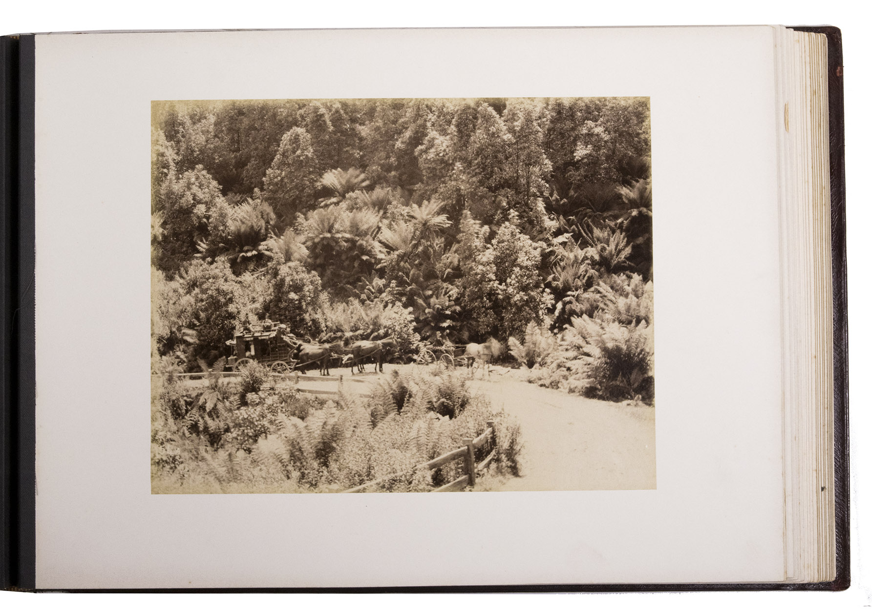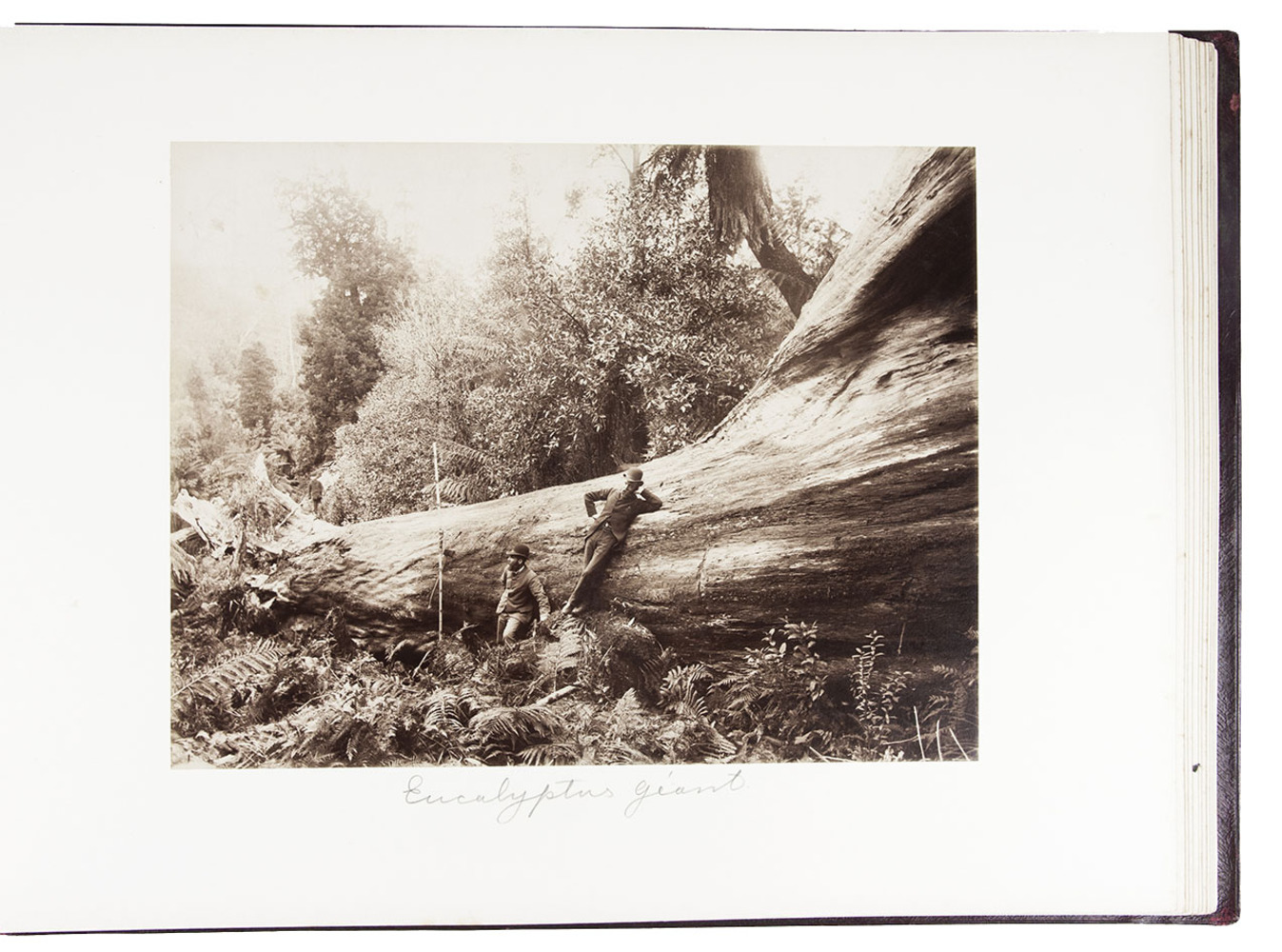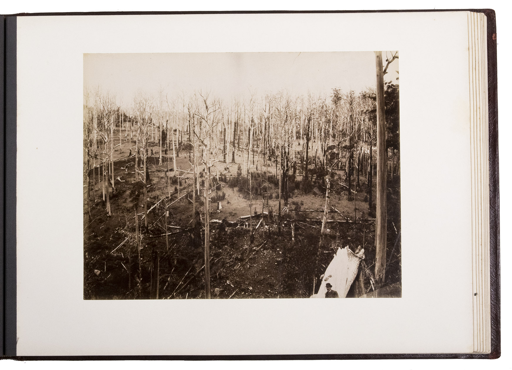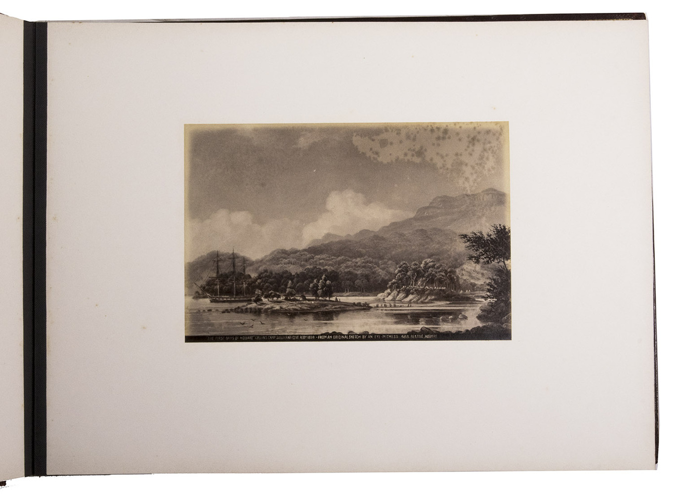 Beautifully bound album with a magnificent collection of 32 original photographs of Tasmania, made by John Watt Beattie (1859-1930) at the end of the 19th century. Beattie arrived in Tasmania in 1879 as an amateur dry-plate photographer of scenic views. He began to work with the Anson Brothers in 1882. In 1892, Beattie bought out the Anson Brothers' very large collection of large format studio portraits and negatives. The photographs include 10 views of Hobart and surroundings (including a view from the bay, a photograph of an original sketch by an eye-witness: "The first days of Hobart, Collins Camp, Sullivan's Cove, Feb. 1804", Elizabeth Street, Cathedral, Bellerive), Mount Wellington with hunter, Mount Ida, Lake St. Clair (3), Mount Byron & Cuvier, giant eucalyptus giant, cedar trees on way to Great Lake, Mount King William, from track to Arrowsmith, Track to Fern Tree Bower, forest views, Mount Olympus from Laura Creek, King Williams Pines, Lake Marion, Garrs Tree Hill track, Hartz Mountains, etc.