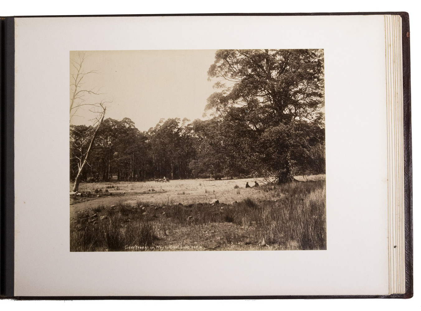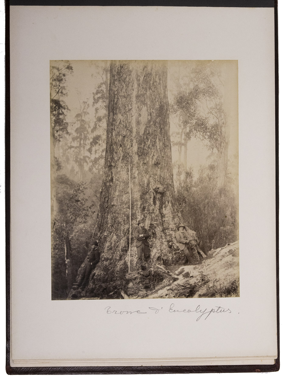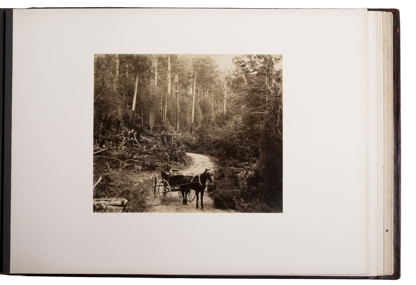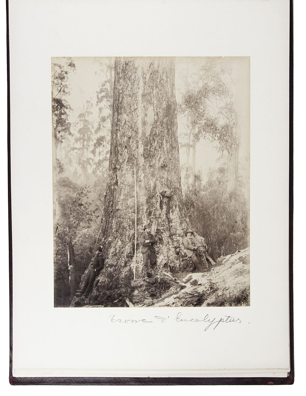 Beautifully bound album with a magnificent collection of 32 original photographs of Tasmania, made by John Watt Beattie (1859-1930) at the end of the 19th century. Beattie arrived in Tasmania in 1879 as an amateur dry-plate photographer of scenic views. He began to work with the Anson Brothers in 1882. In 1892, Beattie bought out the Anson Brothers' very large collection of large format studio portraits and negatives. The photographs include 10 views of Hobart and surroundings (including a view from the bay, a photograph of an original sketch by an eye-witness: "The first days of Hobart, Collins Camp, Sullivan's Cove, Feb. 1804", Elizabeth Street, Cathedral, Bellerive), Mount Wellington with hunter, Mount Ida, Lake St. Clair (3), Mount Byron & Cuvier, giant eucalyptus giant, cedar trees on way to Great Lake, Mount King William, from track to Arrowsmith, Track to Fern Tree Bower, forest views, Mount Olympus from Laura Creek, King Williams Pines, Lake Marion, Garrs Tree Hill track, Hartz Mountains, etc.