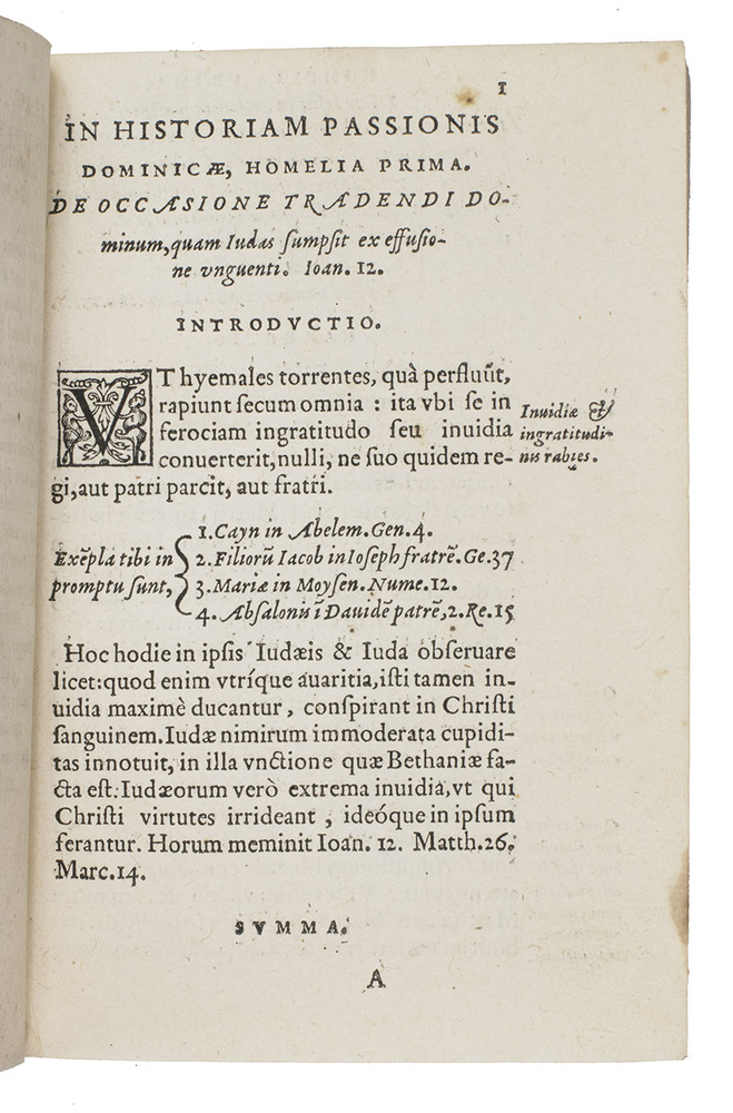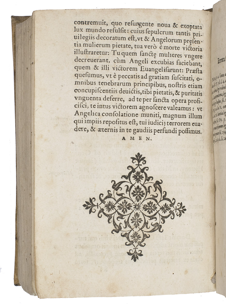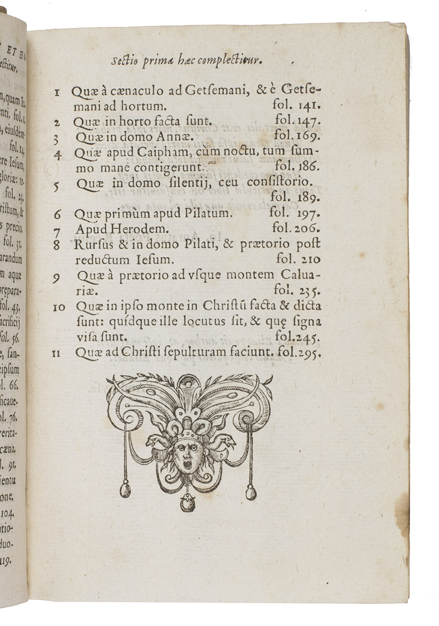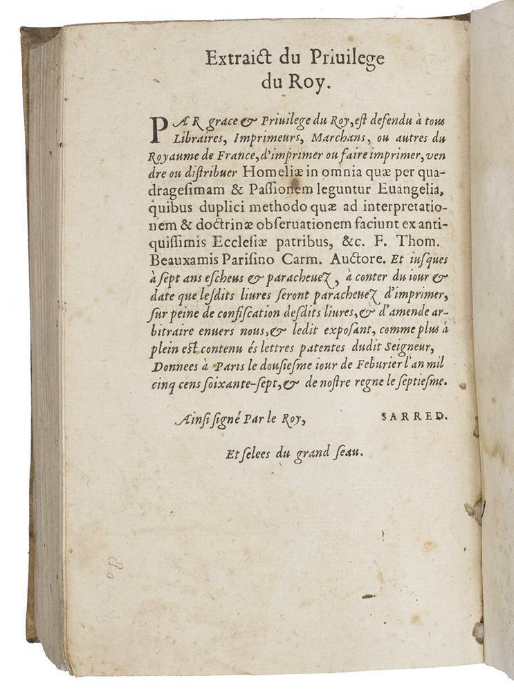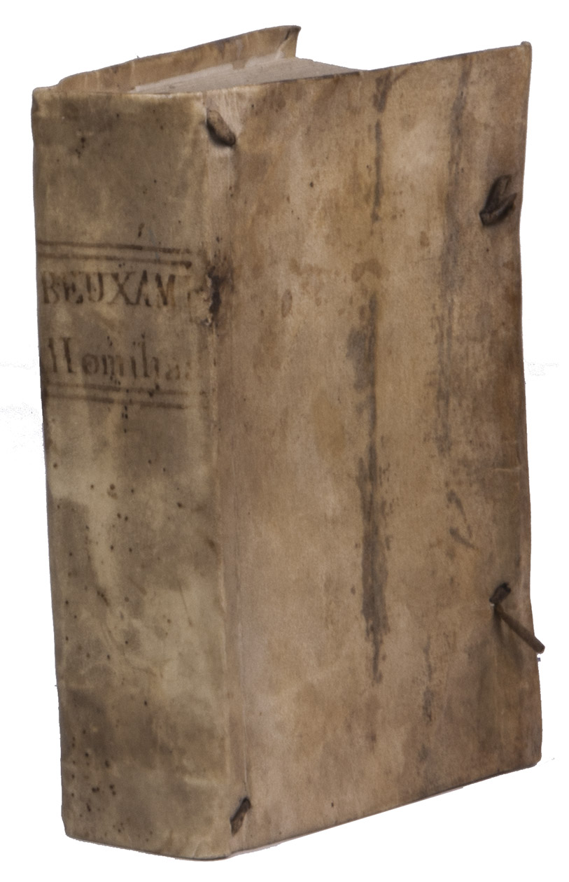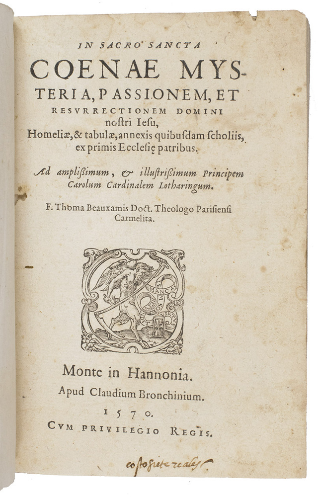 Second known copy of the Mons issue of the first edition of a collection of Latin sermons on the Last Supper, the Passion and the resurrection of Christ, by the famous French theologian and polemicist Thomas Beauxamis (1524-1589). The dedication to Cardinal Louis of Lorrain is dated 1 January 1570. The present first edition was printed in Paris by the printer and bookseller Guillaume Chaudière, and the title-page bears his device, but he changed the imprint during the press-run to produce a small number of copies for the Mons bookseller Claude de Bronchim ("Monte in Hannonia. Apud Claudium Bronchinium"). Rousselle records no Mons publications before 1580, though the USTC records examples from 1553. This appears to be the only known book with the imprint of Claude de Bronchin, though he is recorded as a bookseller at Mons from 1569 to 1578, when he did business with (probably bought books from) Christoffel Plantin in Antwerp, but he appears to have died in the latter year.