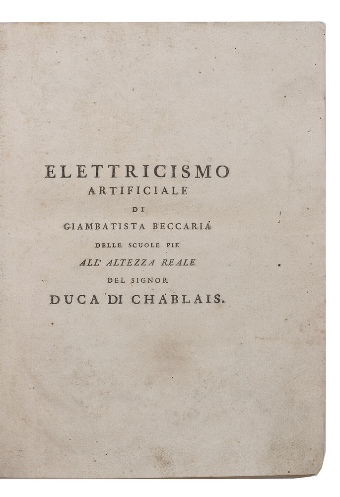 First editions of two works on electricity by the Italian physicist Giambatista Beccaria (1716-1781), who was appointed to the chair of physics at the university of Turin in 1748 and was one of the scholars who helped transform electrology into a scientific discipline defending the theory of Benjamin Franklin.