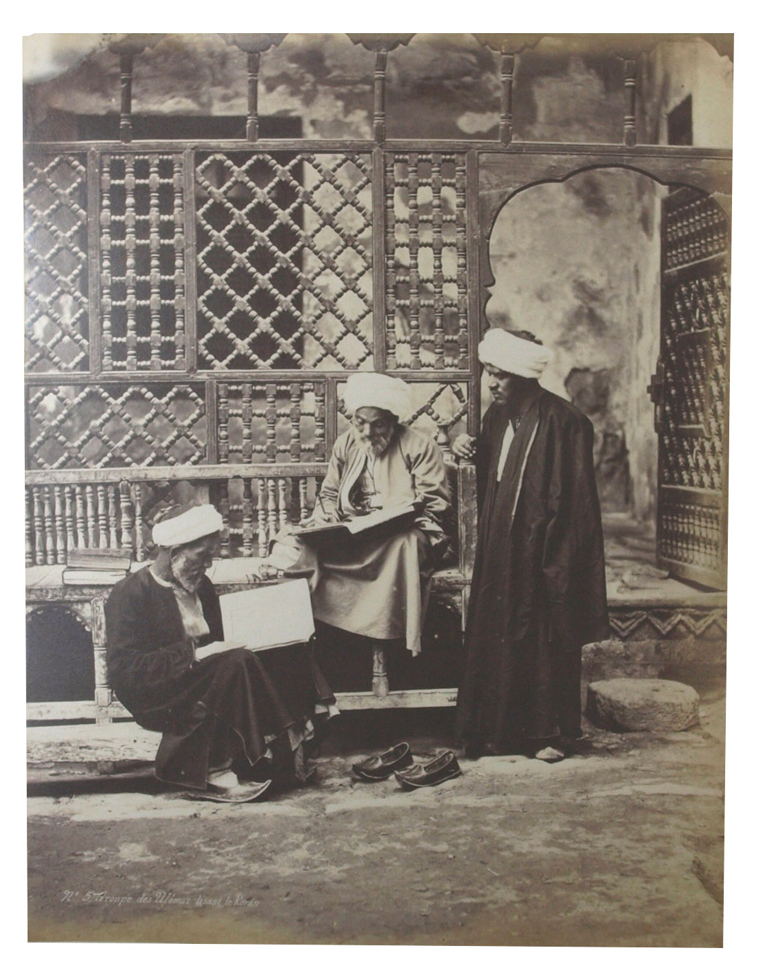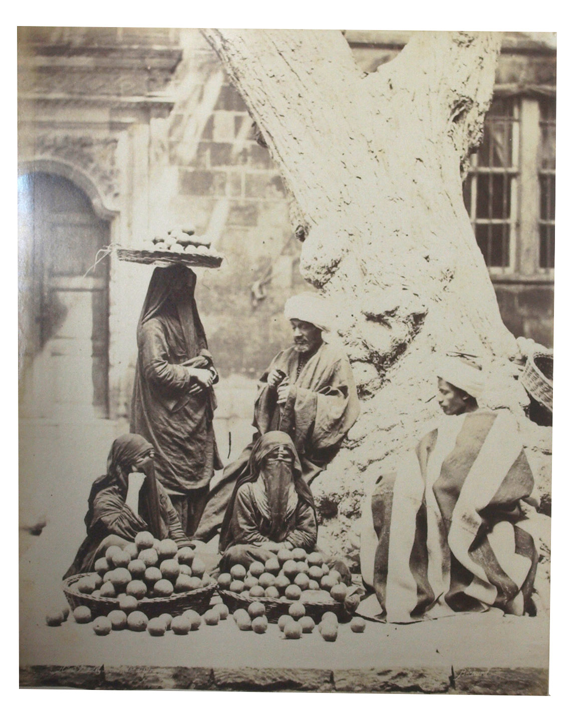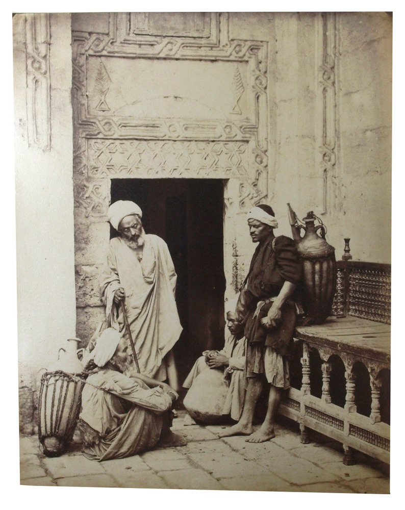 Large and beautiful photographs by Bechard: excellent vintage prints, mostly in superior condition. They represent the popular Egyptian and Nubian types, frequently in close-ups. Nissan N. Perez states that this part of the work of a photographer specializing in views of sites and monuments "has escaped general attention" (cf. Focus East, p. 123, reproducing the photograph of water carriers resting). Includes: a scribe; a sheikh reading the Qur'an, merchants and grocers, a group of ulemas (religious scholars) reading the Qur'an, an Arab drawing water, whirling dervishes, Arab peasants (a fellah carrying water), a sheikh going to the mosque, a game of Mangala, water carriers, mat manufacturers, Sheikh Sadad, a descendant of Mohammed, a falconer, washerwomen, an Arabic singer, a young fellah, a Darabouka player, labourers, a public fountain, a beggar, Arabs at prayer, Arabic coffee, etc.