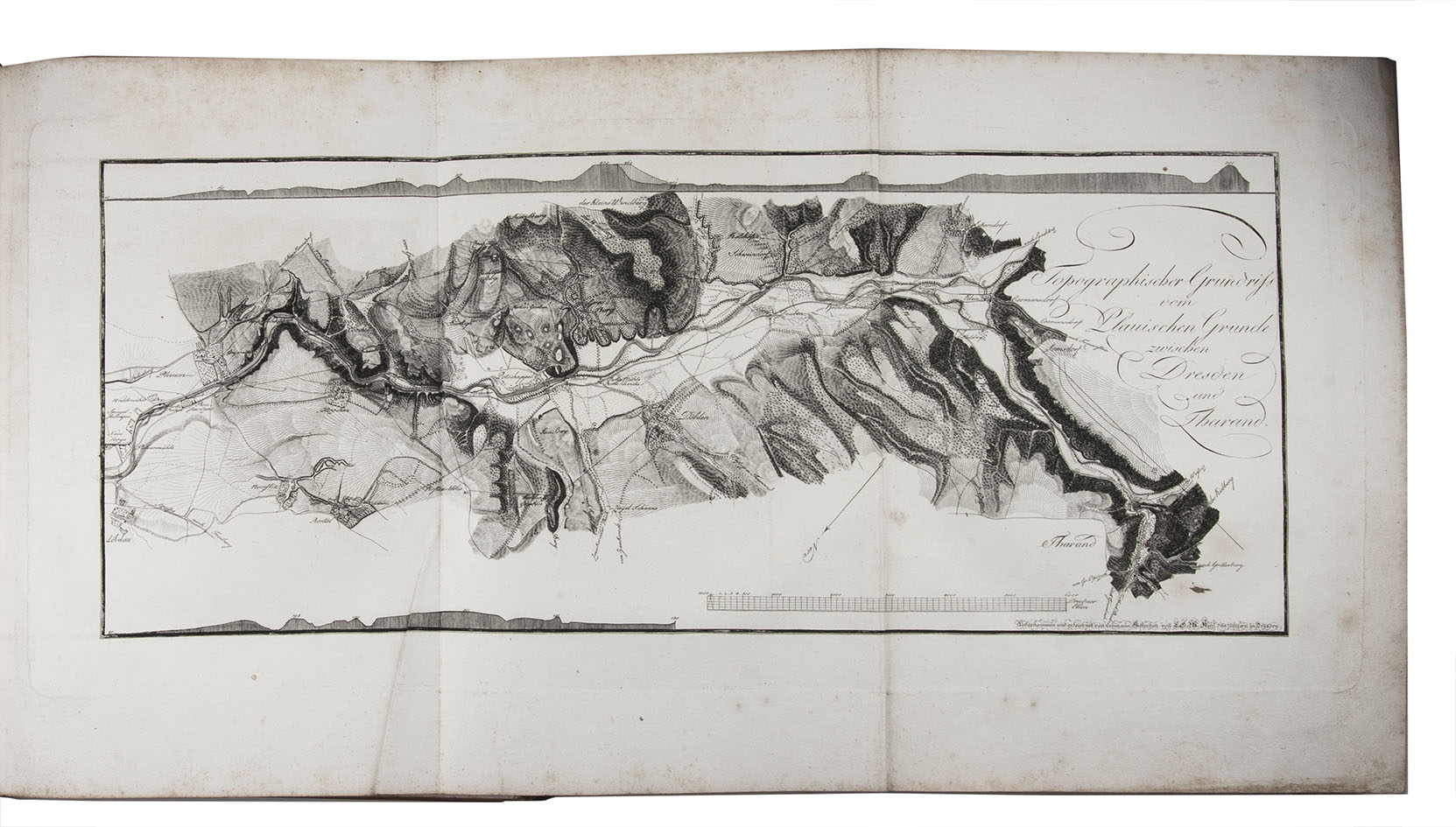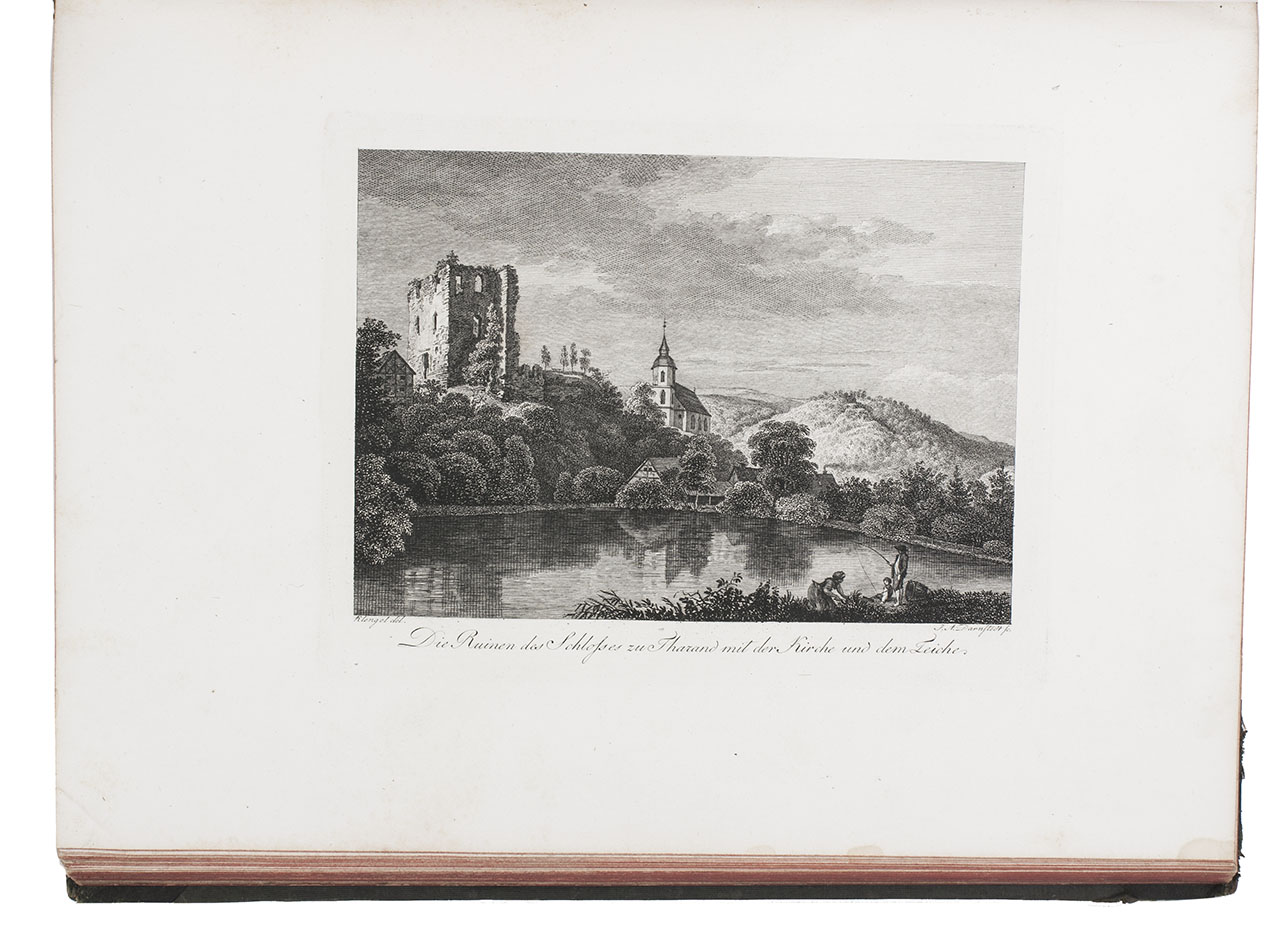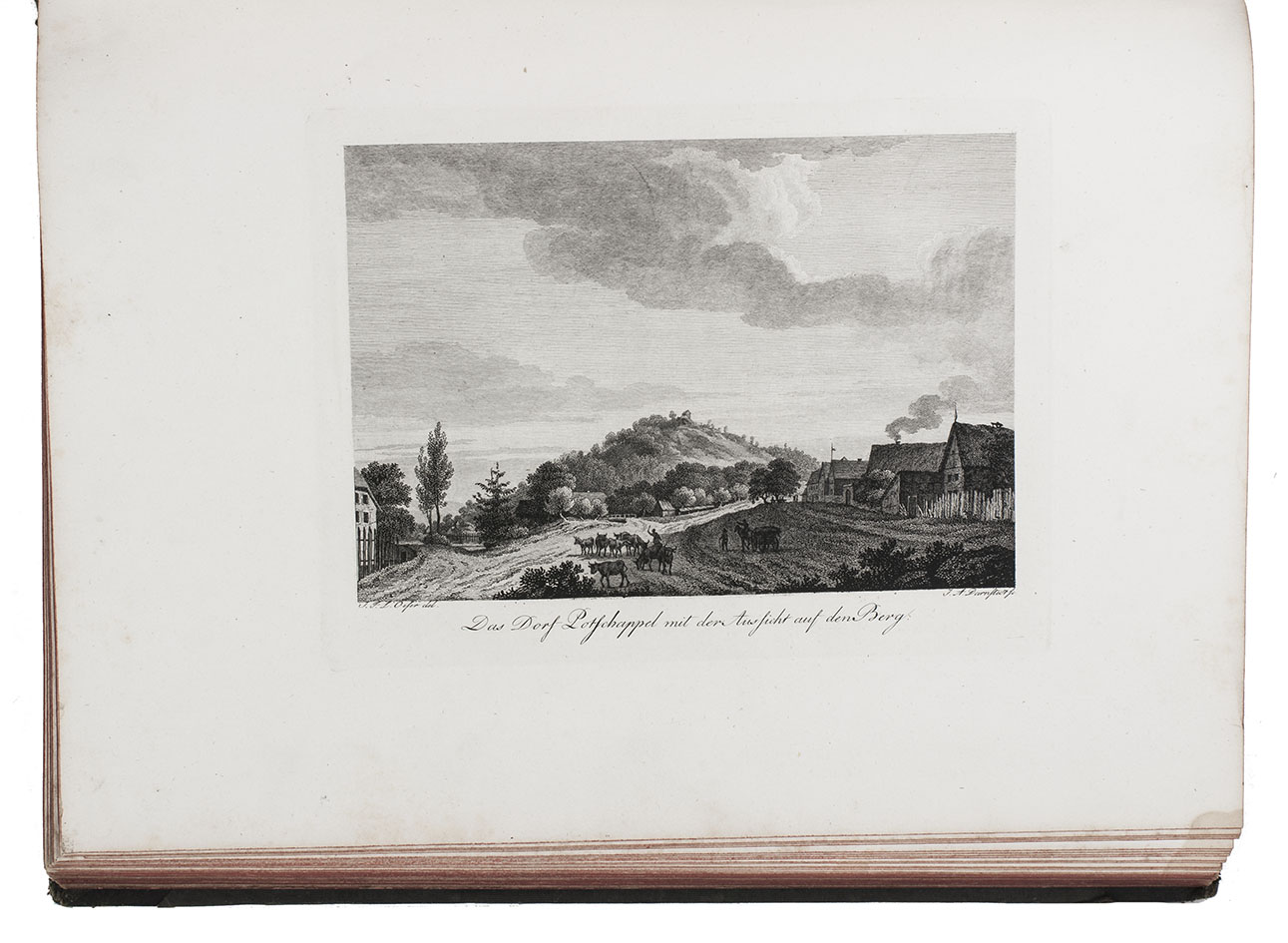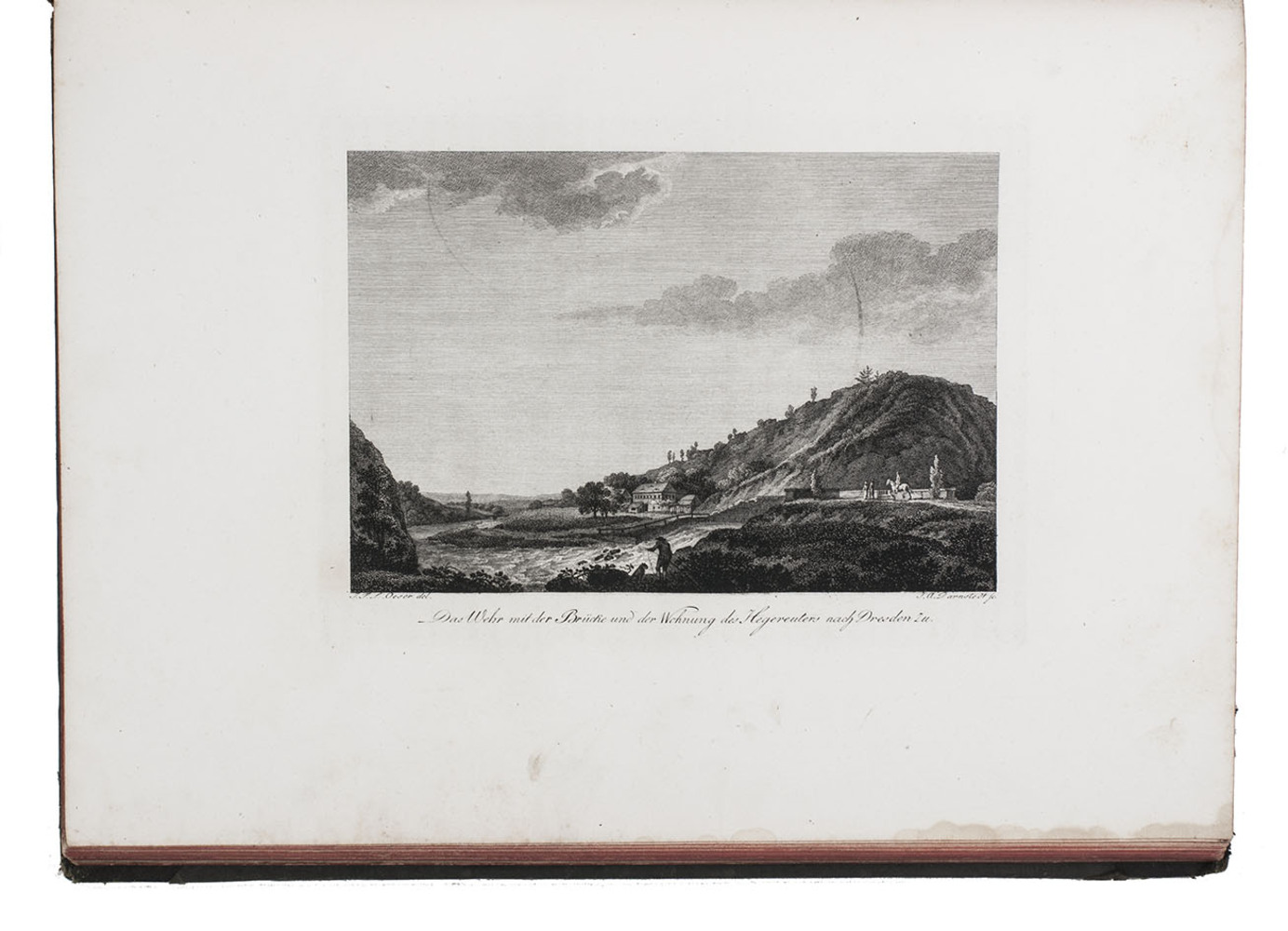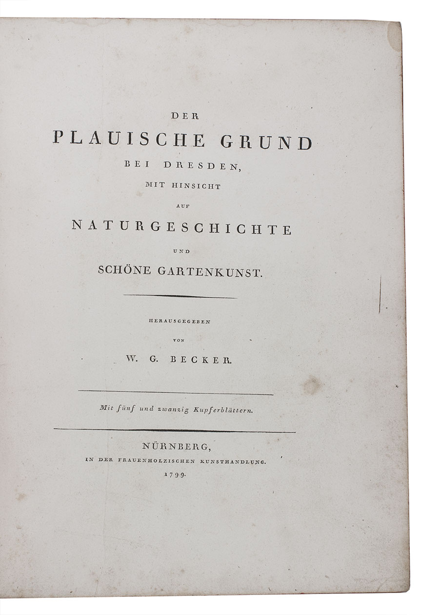 First edition of a work on landscape gardening, including the part on natural history, often lacking, written by Wilhelm Gotlieb Becker (1753-1813). The first part consists of a description of the area around Dresden, its geology, vegetation, villages and the ruins that can be found there. Twelve of the fine views of the first part are made after drawings by the famous Johann Christian Klengel (1751-1824). "Meisterwerk der Dresdner Landschaftskunst des späten 18. Jahrhunderts" (Lanck.-Oehler).The second part, describing the natural history of the region, contains three texts, each with its own divisional title: Mineralogische Beschreibung des Plauischen Grundse bis Tharand by Andreas Tauber, with four hand-coloured plates on geology and minerals, Verzeichniss der im Plauischen Grunde und den zunächst angrenzenden Gegenden wildwachsenden Pflanzen, by Friedrich Traugott Pursch and Verzeichnis der merkwürdigsten Insecten welche im Plauischen Grunde gefunden werden, by Ludwig Heinrich Freihern von Block, also with four hand-coloured plates, displaying various insects.