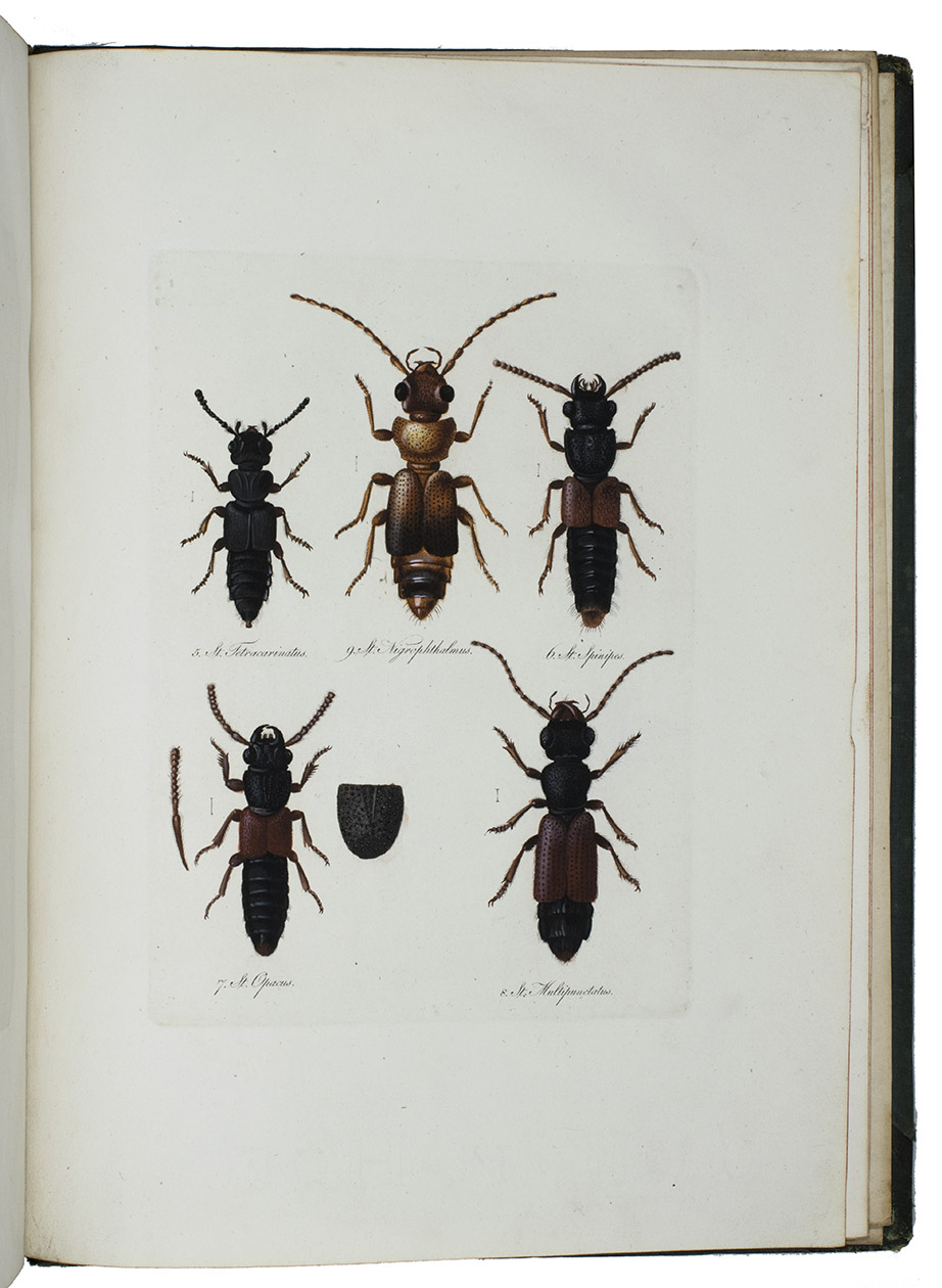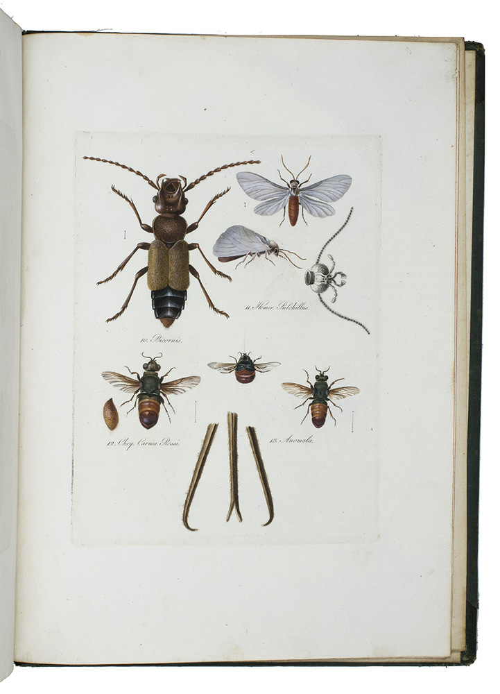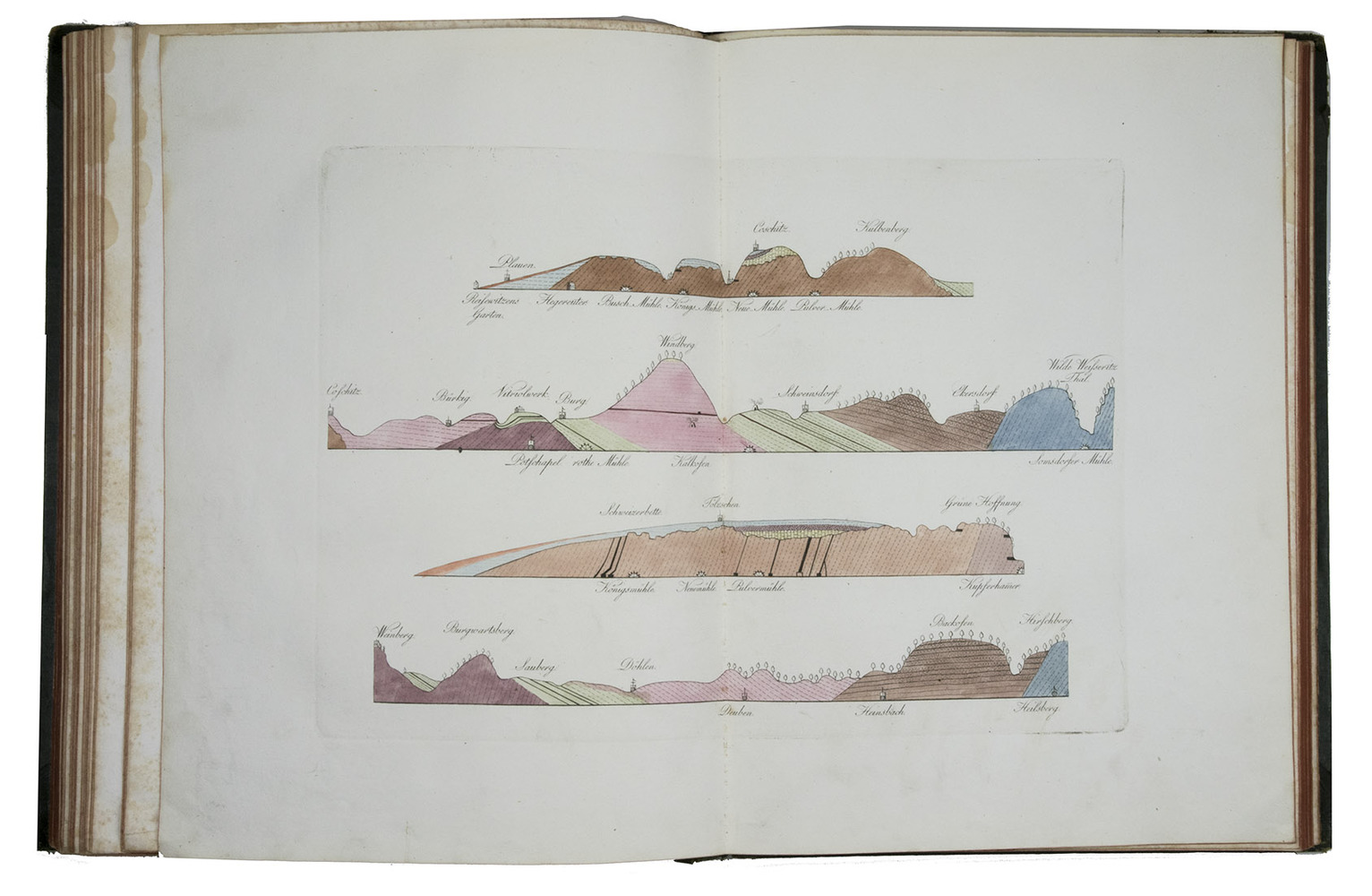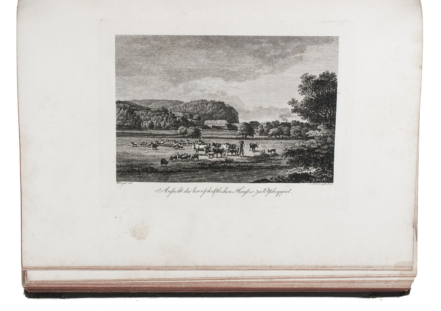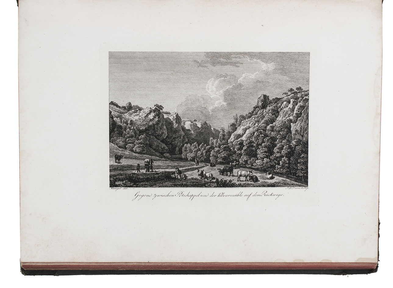 First edition of a work on landscape gardening, including the part on natural history, often lacking, written by Wilhelm Gotlieb Becker (1753-1813). The first part consists of a description of the area around Dresden, its geology, vegetation, villages and the ruins that can be found there. Twelve of the fine views of the first part are made after drawings by the famous Johann Christian Klengel (1751-1824). "Meisterwerk der Dresdner Landschaftskunst des späten 18. Jahrhunderts" (Lanck.-Oehler).The second part, describing the natural history of the region, contains three texts, each with its own divisional title: Mineralogische Beschreibung des Plauischen Grundse bis Tharand by Andreas Tauber, with four hand-coloured plates on geology and minerals, Verzeichniss der im Plauischen Grunde und den zunächst angrenzenden Gegenden wildwachsenden Pflanzen, by Friedrich Traugott Pursch and Verzeichnis der merkwürdigsten Insecten welche im Plauischen Grunde gefunden werden, by Ludwig Heinrich Freihern von Block, also with four hand-coloured plates, displaying various insects.