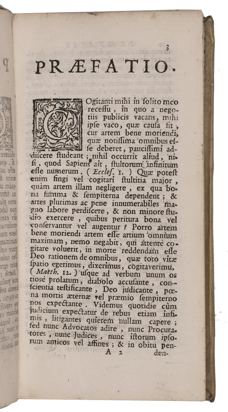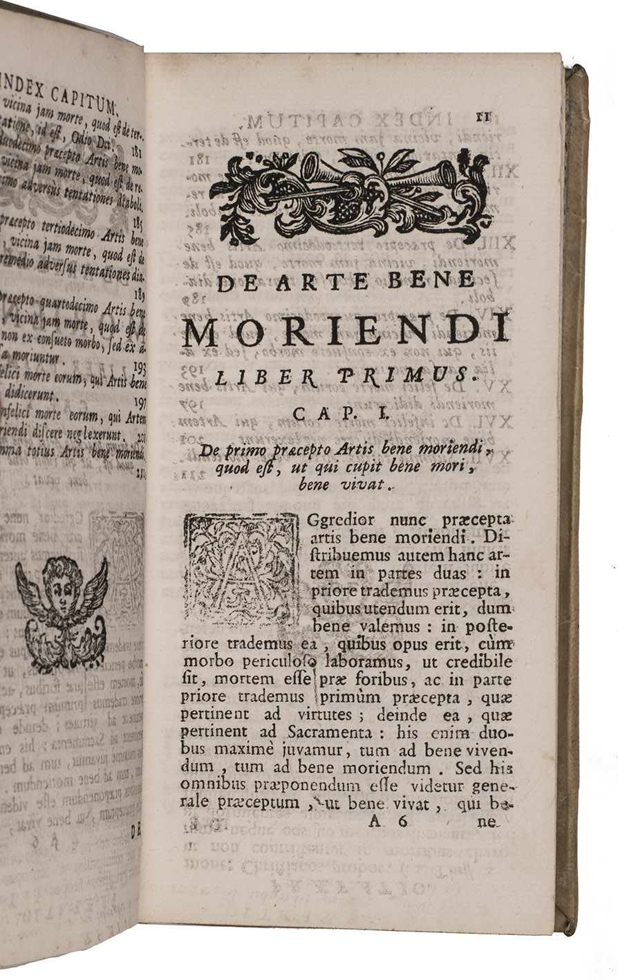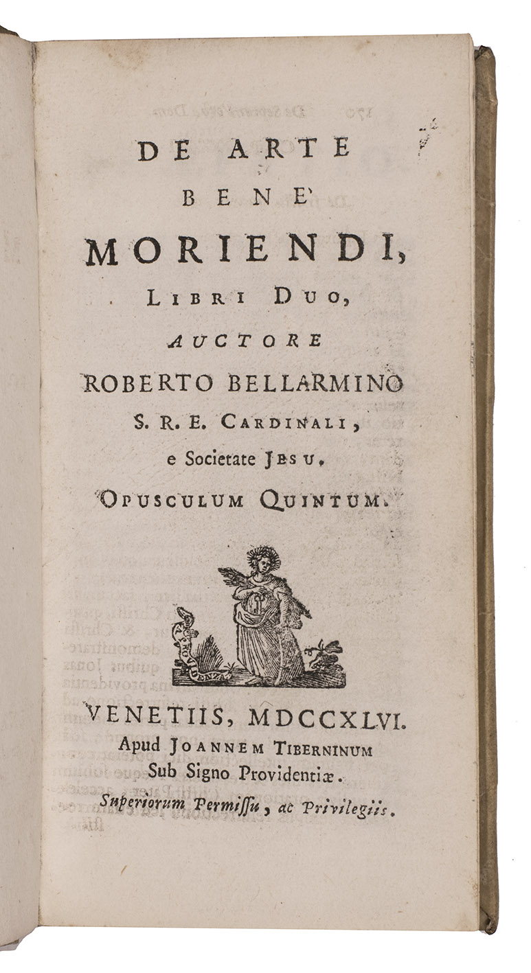 A charming little agenda 12mo edition, in the original Latin, of Cardinal Roberto Bellarmino's most famous and most popular work, known in English as The art of dying well. Roberto Bellarmino (1542-1621) or Robert Bellarmine, a learned and pious Italian Jesuit had a great reputation with Catholics and Protestants alike. He joined the Jesuits in 1560 and completed his studies at Louvain beginning in 1569, then served as professor of theology there until he returned to Italy in 1576. He became professor of theology at the new Roman College and was appointed Cardinal in 1598/99. Though a member of the committee that condemned Galileo's theses, when Galileo was much troubled by the fact that people thought he was under some severe penance, Bellarmino wrote him a certificate stating that Galileo was under no penance whatsoever, but only had signed a declaration that his theses were in contradiction with the words of the scripture. One of his famous sayings was "an ounce of peace is better than a pound of victory".