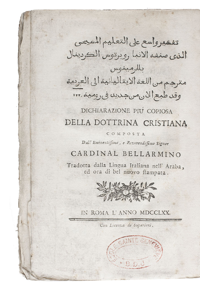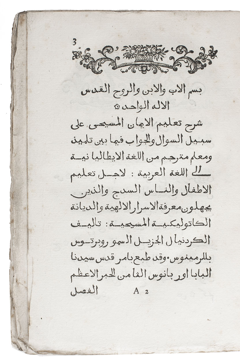 Ad 1: Third Arabic edition of the complete text of Bellarmino's immensely popular catechism. The catechism was translated into Arabic for the use of Catholic missionaries.