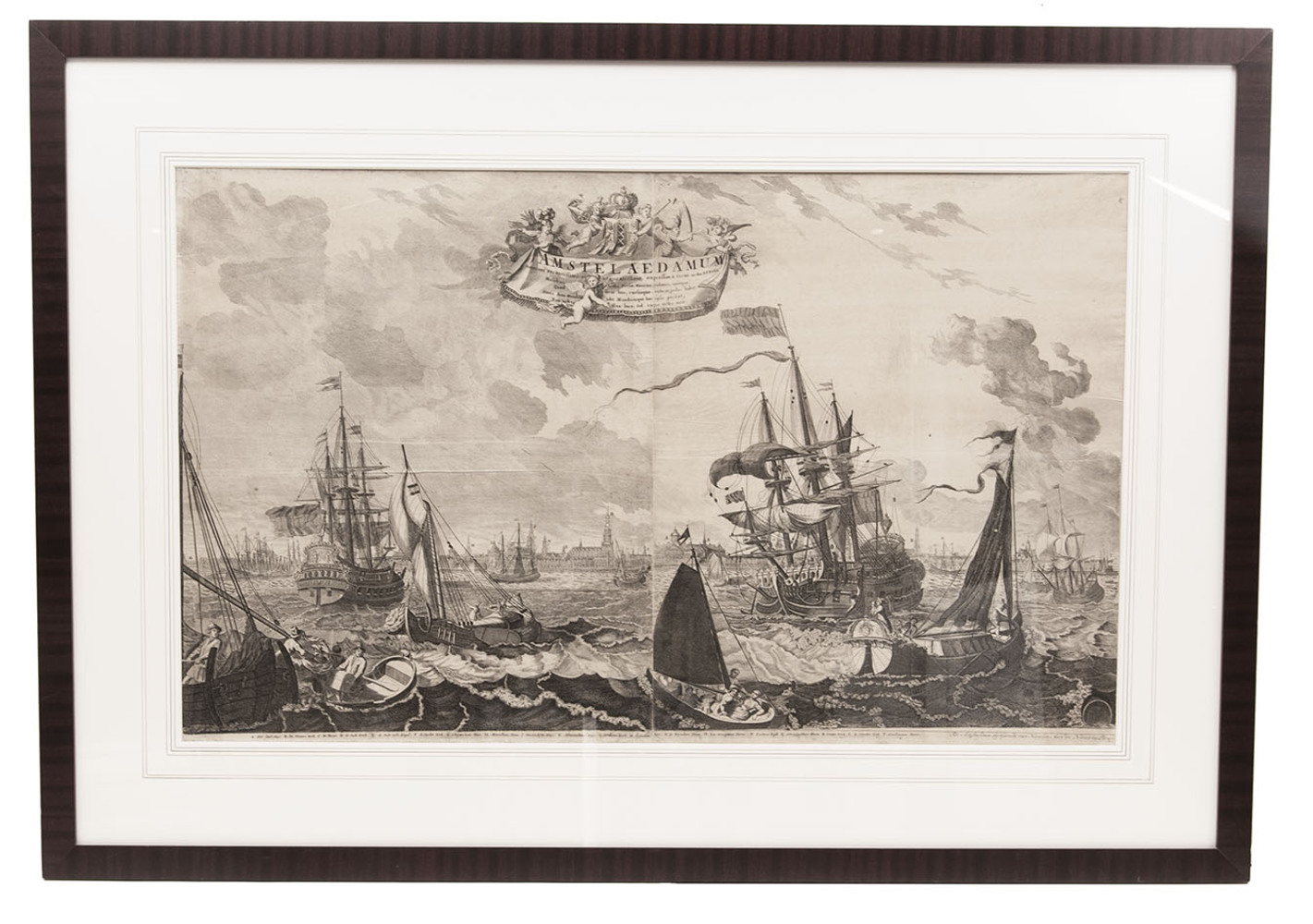 Slightly browned (primarily in the right sheet) and with a few creases, otherwise in fine condition. Rare etched view of Amsterdam, showing Peter the Great and the Dutch warship he worked on incognito. D'Ailly, Profielen der stad Amsterdam 119; R.W.P. de Vries, Amsterdamse stadsgezichten 20 (= 2nd state); Bakker & Schmitz, Het aanzien van Amsterdam 58; not in Hollstein.