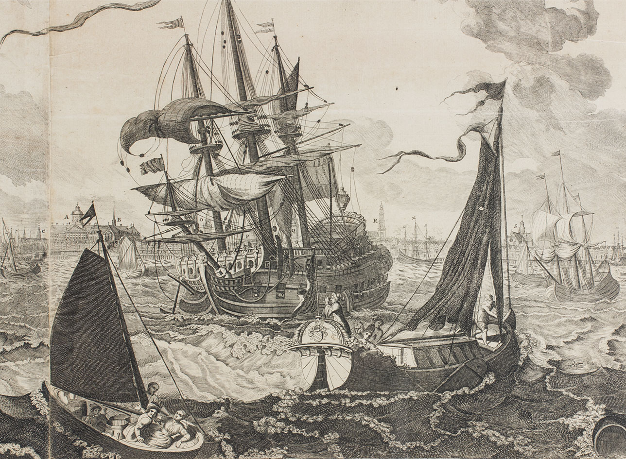 After Tsar Peter's ship was finished the artist Pieter van den Berge (Amsterdam, 1659-1737) made this etching. It was printed on two leaves by Gerard van Keulen (1678?-1727), the son and scholarly partner of Johannes van Keulen, the famous Amsterdam publisher of maritime atlases. He took over from his father in 1715, dating this print between then and his death. The Tsar may even have been acquainted with the Van Keulen family, for his print collection included many of their prints.