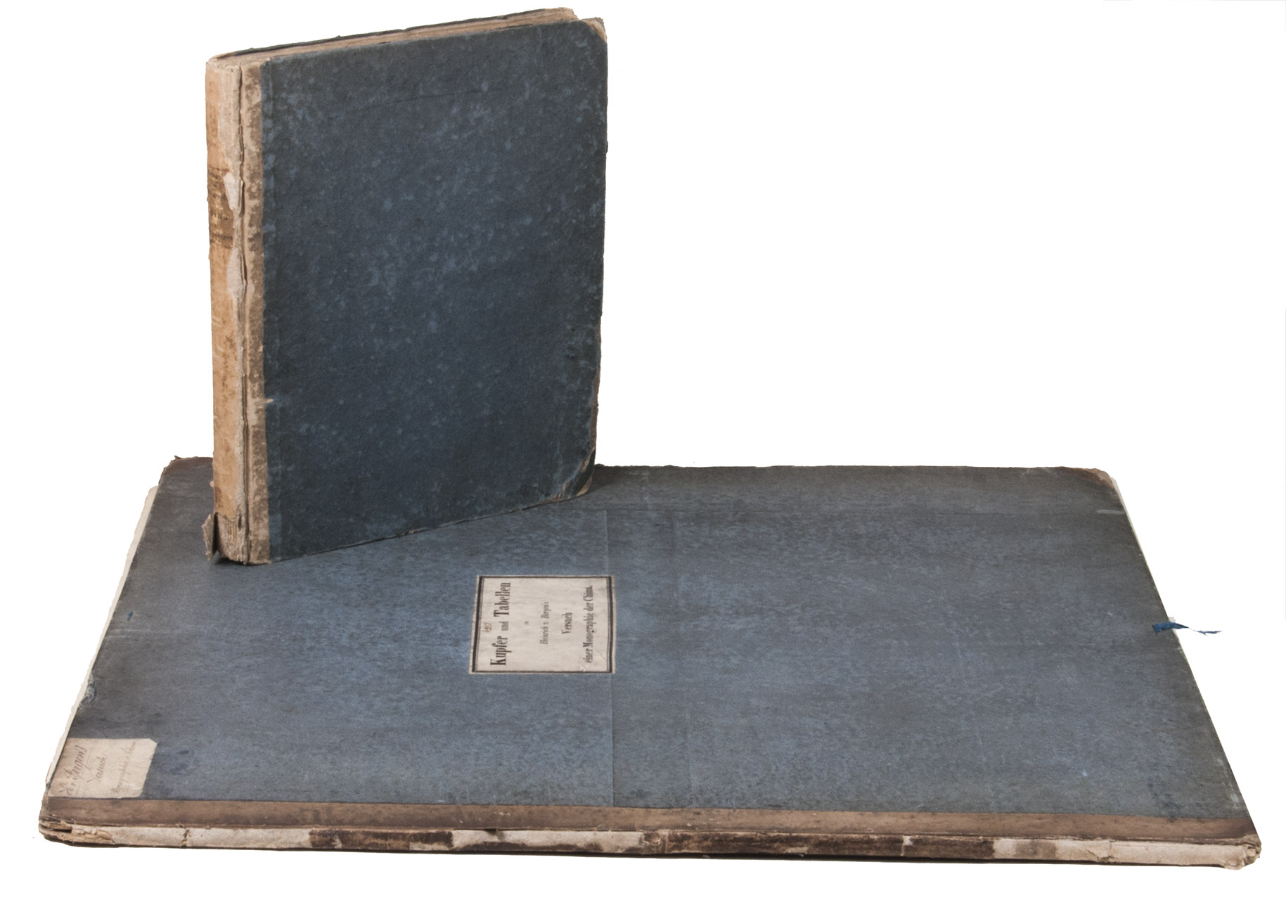 With the ex libris book plate of Van der Wiele mounted on the front pastedown of the text volume and an additional manuscript title-label mounted in the upper left corner of the front board of the atlas volume. Both bindings show clear signs of wear, with loss of material around the edges and corners of the boards and the spines, large water stains on the back board of the atlas volume. The text volume is browned throughout. Otherwise in good condition. Arnold Arboretum, p. 76; BMC NH, p. 140; Nissen, BBI 144; Pritzel 655; Wellcome II, p. 147.