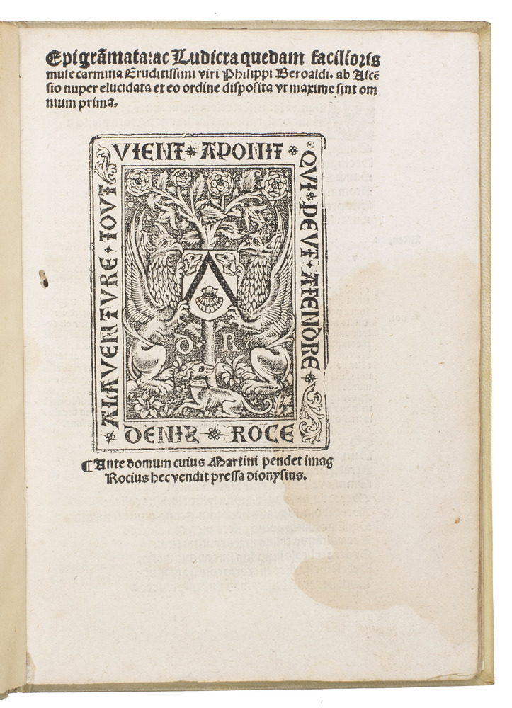 Epigra[m]mata: ac ludicra quedam facilioris muse carmina eruditissimi viro Philippi Beroaldi. Ab Afsefio nuper elucidate et eo ordine difpofita vt maxime fint omnium prima, C Ante domum cuius Martini pendet imag Rocius hec vendit pressa Dionysius.