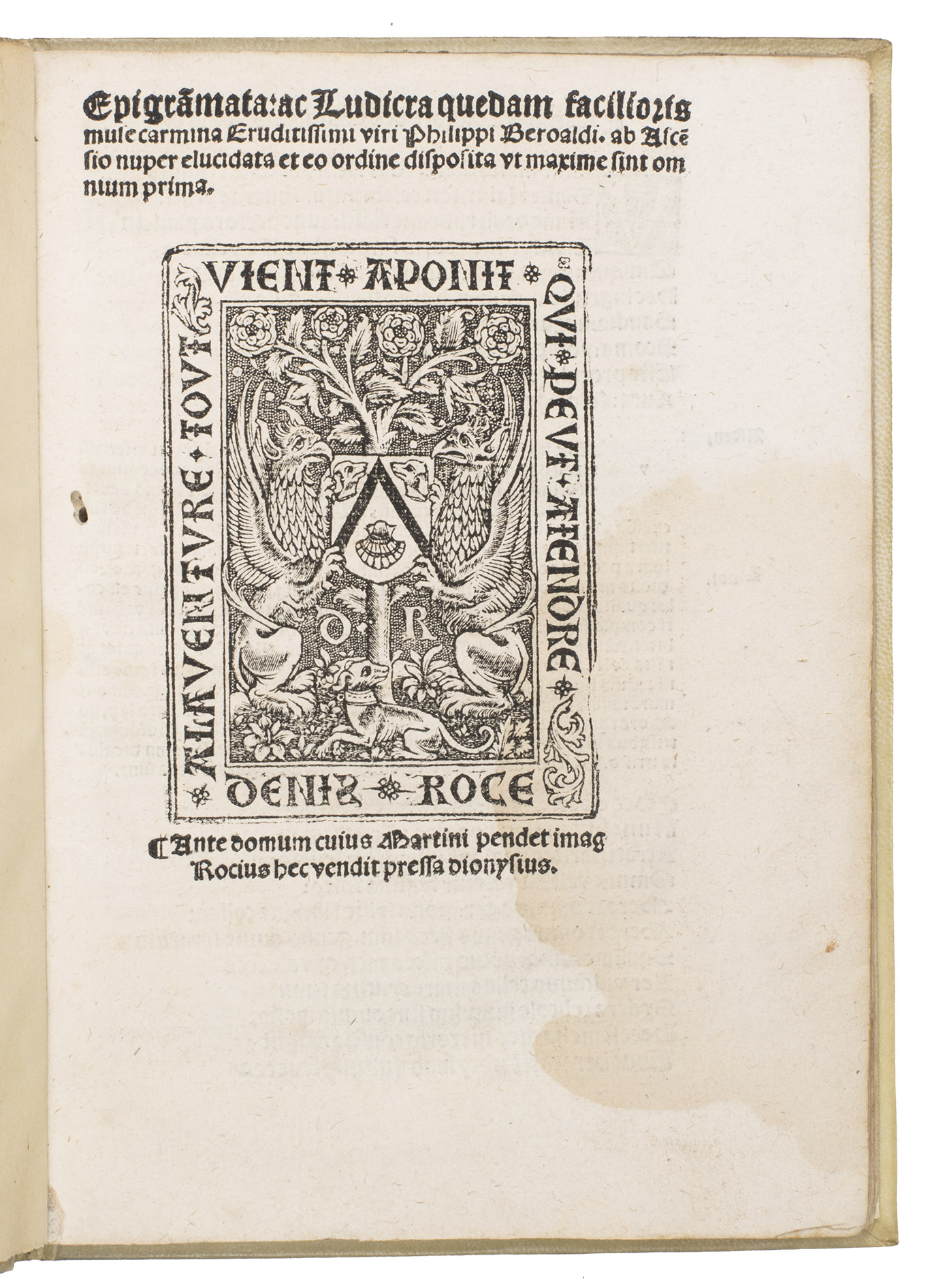 Beroaldo's poems were first printed in 1492 by Joannes Trechsel in Lyon, together with his speeches. This edition, titled Orationes et poemata, was edited by Jodocus Badius Ascenius (1462-1532), who had been a student of Beroaldo. The same work was published a second time in 1499 by Michel Tholoze for Denis Roce. In the 16th century, the speeches and poems were separated, and the poems were published under a new title, Epigrammata. The present work, published by Denis Roce, is very likely the first edition of the epigrammata. It is difficult to ascertain, because the work is not dated, but it most likely predates the second edition published by Ascenius in 1508.