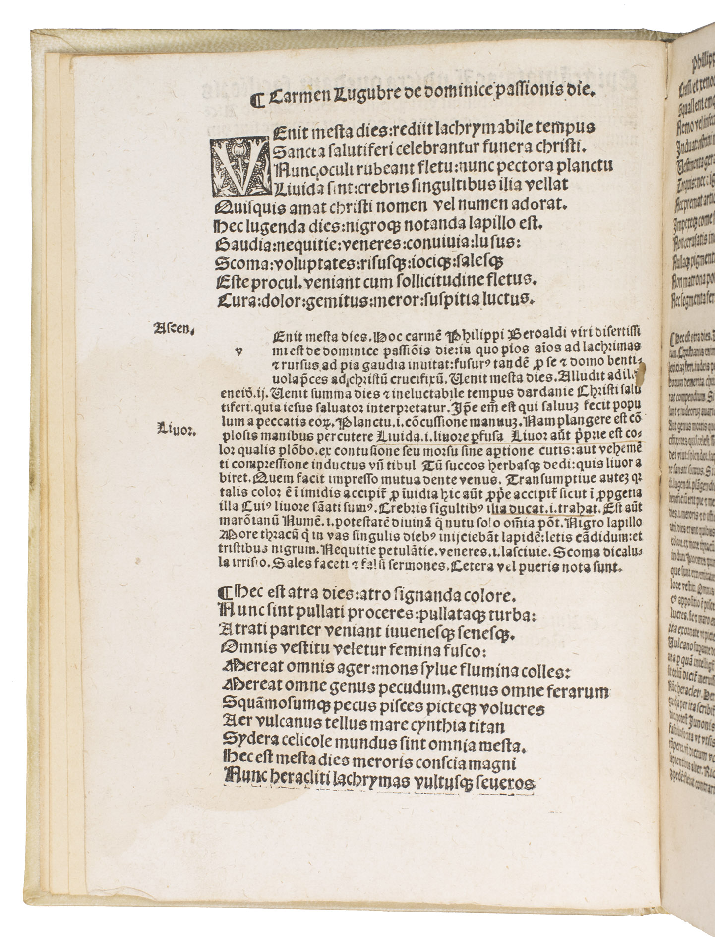Very rare work with poetry by Filippo Beroaldo the Elder (1453-1505), one of the leading Italian humanists. The work contains twenty different poems and includes Carmen lugubre, which is considered one of Beroaldo's masterpieces, because he combined all his oratorical skills in it. The present work is very rare. It has been recorded in just three libraries, and we have only been able to find two other copies in sales records of the past hundred years.