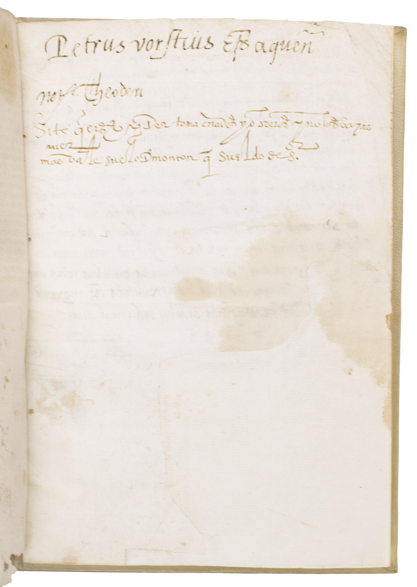 With a later annotation on the recto of the final blank leaf ("Petrus vorstius ep[iscopu]s aquen nota Theoderi"), another underneath, and two longer annotations on the verso of the final blank leaf, one in a contemporary and one in a later hand, with sermons of prayers. A water stain in the outer margin throughout, somewhat affectign the text, and wormholes in the inner margin throughout, slightly affecting the text, outer corner of final blank leaf restored, with some loss of the manuscript annotations. Otherwise in good condition. BM, French books, p. 50; USTC 180181 (1 copy); WorldCat 1041570796, 1025718194 (2 copies).