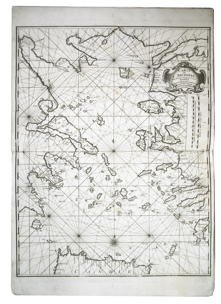 The first chart is called Nouvelle carte de partie des cotes de terre Ferme et isles situees sur l´ocean, and shows the entrance to the Mediterranean, with the coasts of Spain, Portugal, France, the United Kingdom, and the north-west coast of the African continent, with the Azores, Madeira, and the Canary Islands. The second and third chart together form one large chart, titled Carte des Cotes de la Mediterranée. They show the east and west side of the Mediterranean sea respectively. The final chart is called Carte de l'archipel and shows the Aegean Sea, the part of the Mediterranean between Greece and Turkey, and the numerous islands in that region, in more detail.