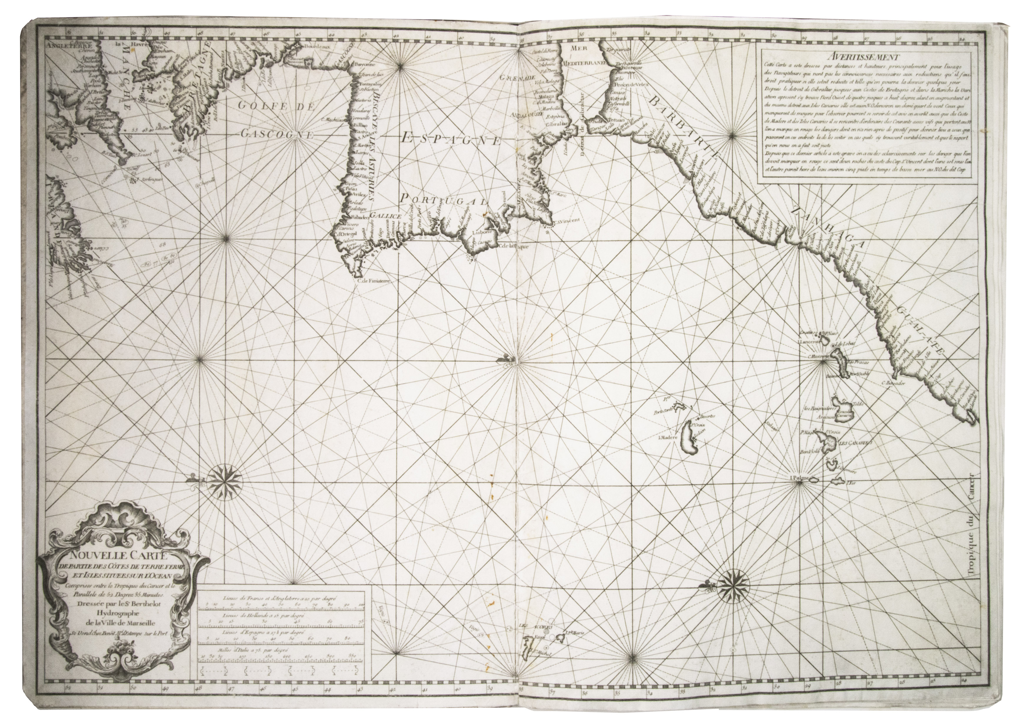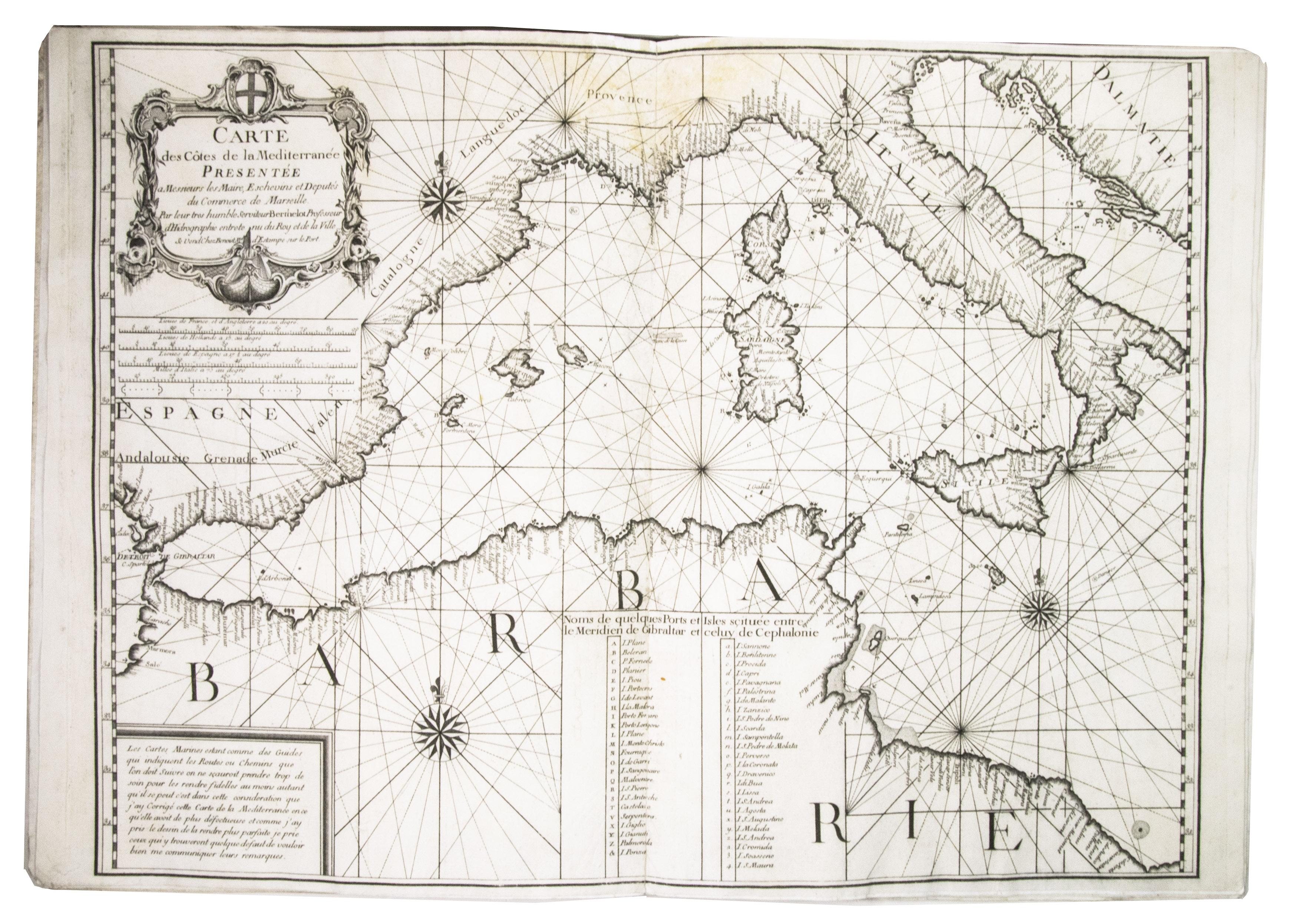 Marseille, "se vend chez Benoît", 1720-1730. Large folio (40 x 55 cm). With 4 double-page engraved maps, with the first half of the first map as the front paste-down and the second half of the last map as the back pastedown. Contemporary vellum-backed boards, reinforced with light brown leather at the head and foot of the spine. 4 nautical maps on [8] pp.