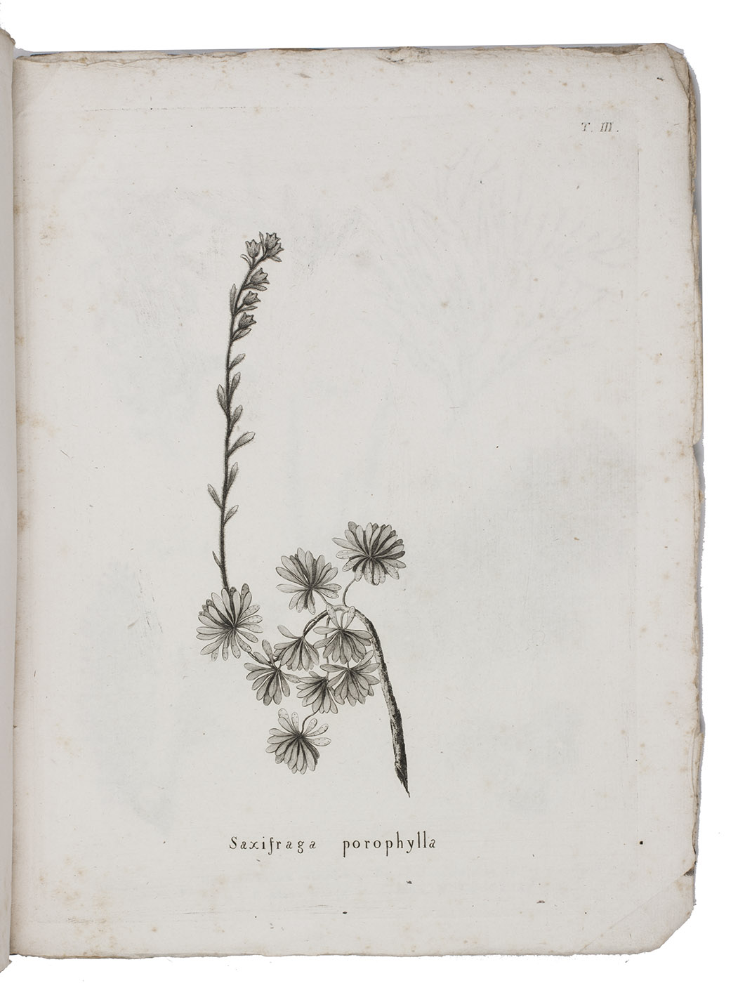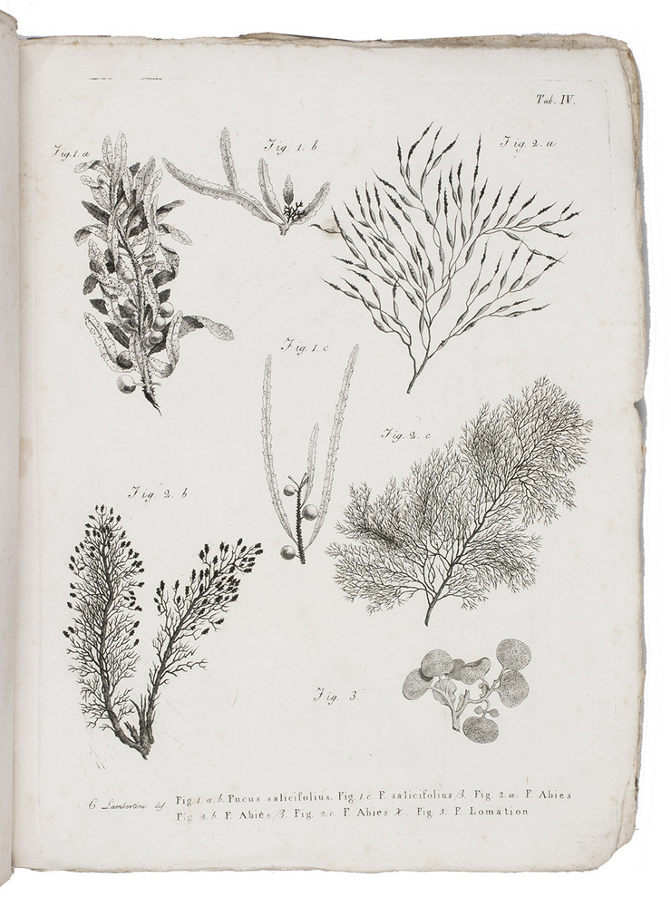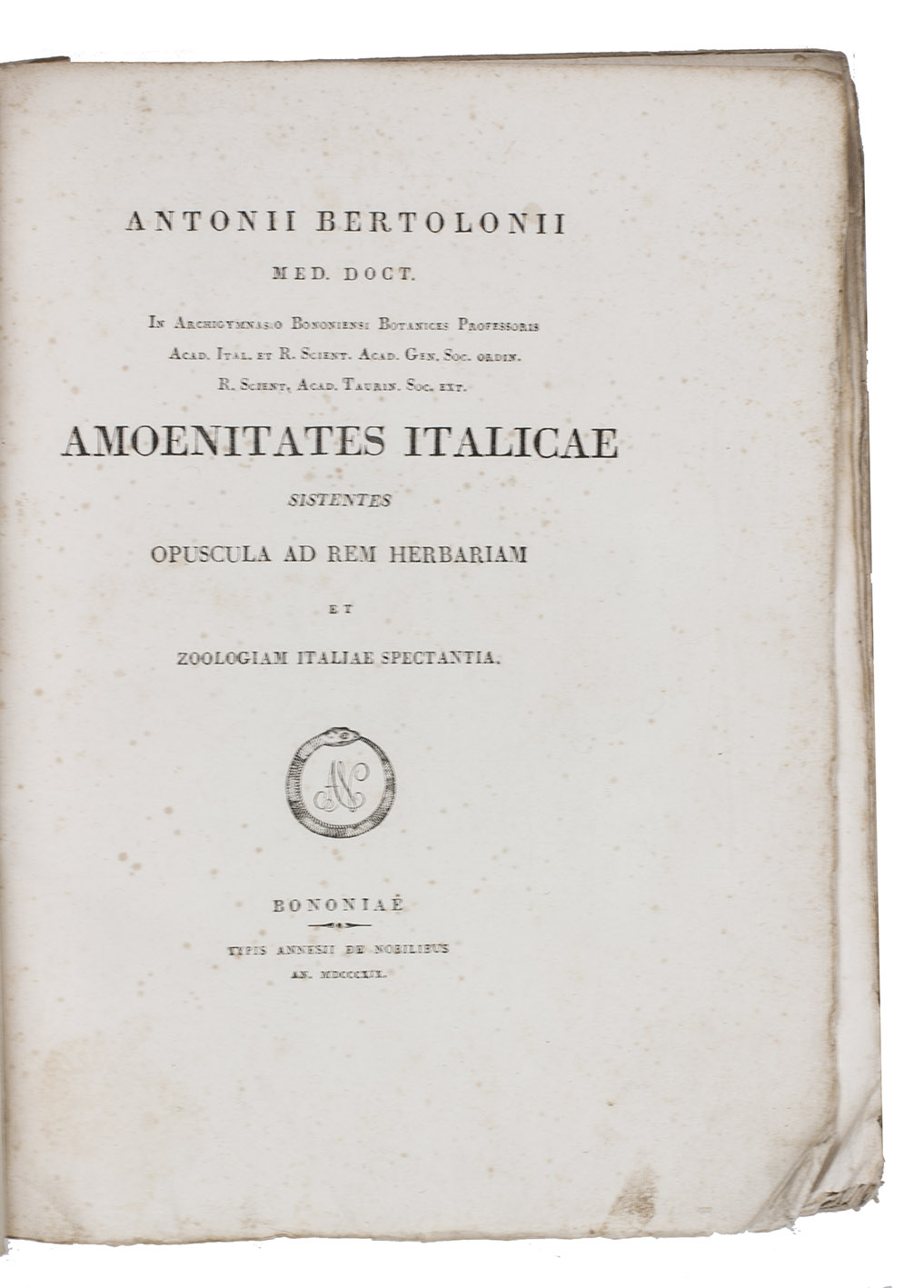First edition of an extensive work on Italian plants by the Italian botanist and physician Antonio Bertoloni (1775-1869), professor of botany at Bologna. It included nine essays, some not previously published, each dealing mostly with a specific type of plant, or plants that can be found in a specific region, for example, Genoa and Ravenna. Each essay lists many species of plants, with brief taxonomic descriptions and often mentioning where the plants can be found. Two of the essays are devoted to zoophytes (animals that resemble plants) in the waters of Luni. Included at the end are an index and six engraved plates.