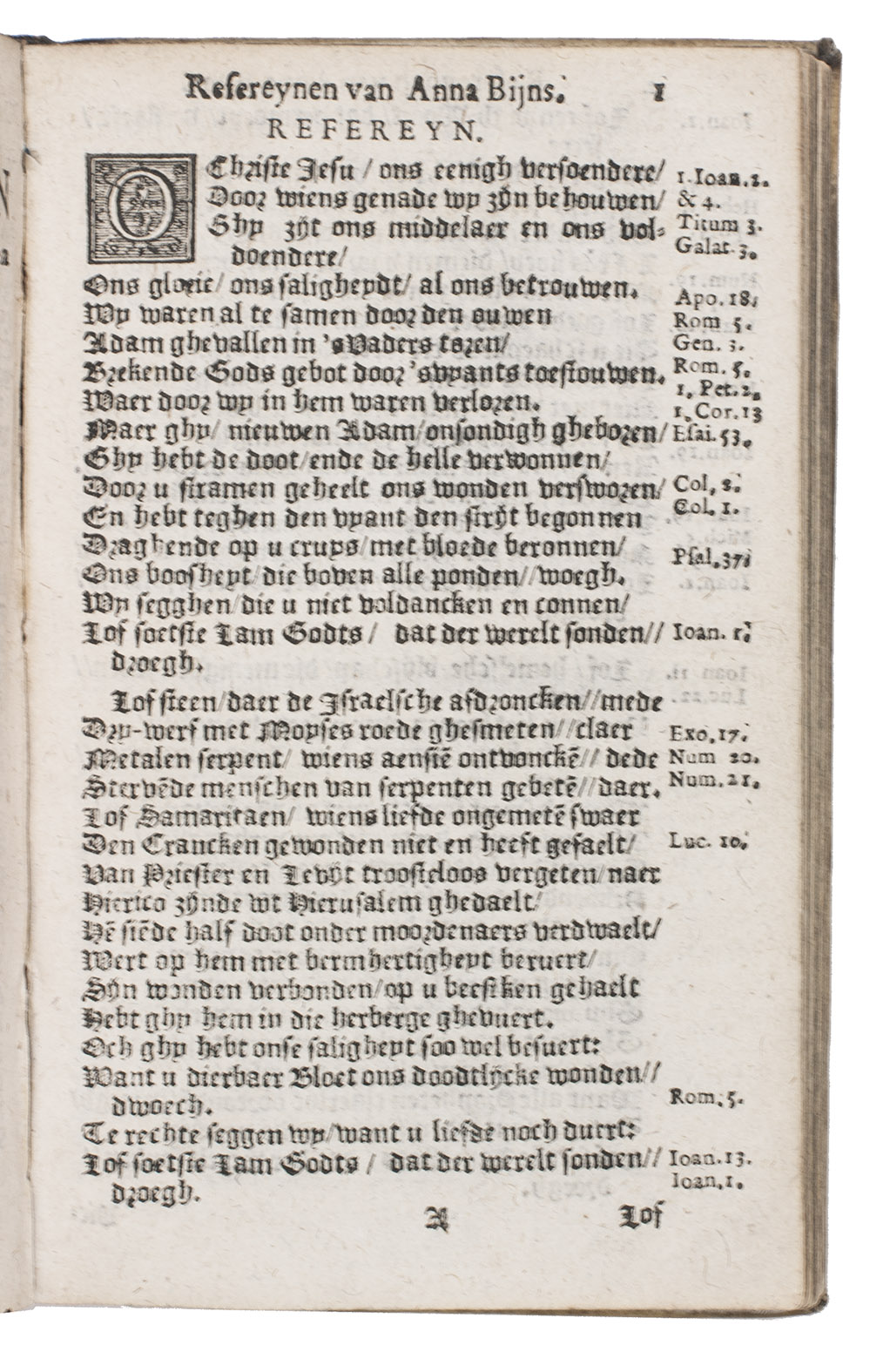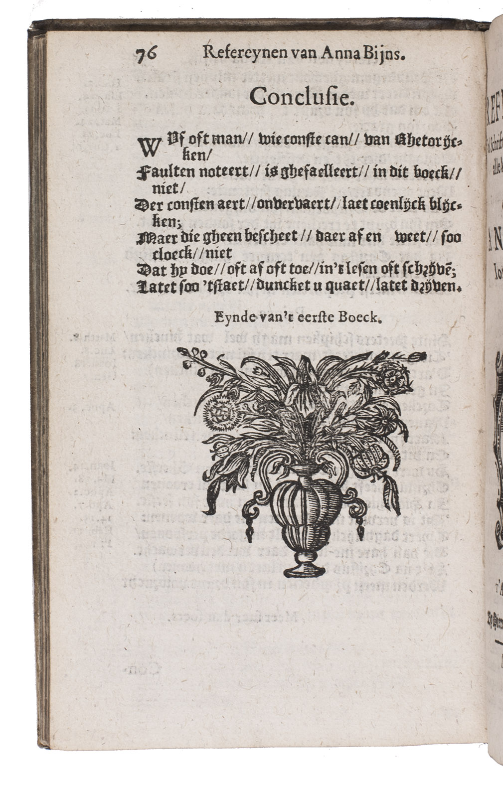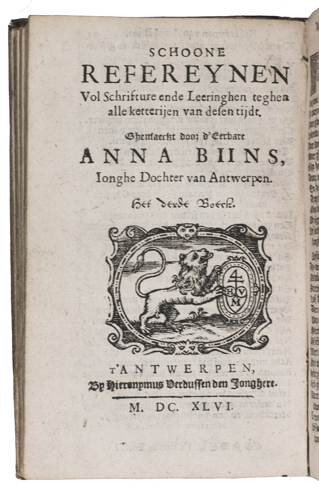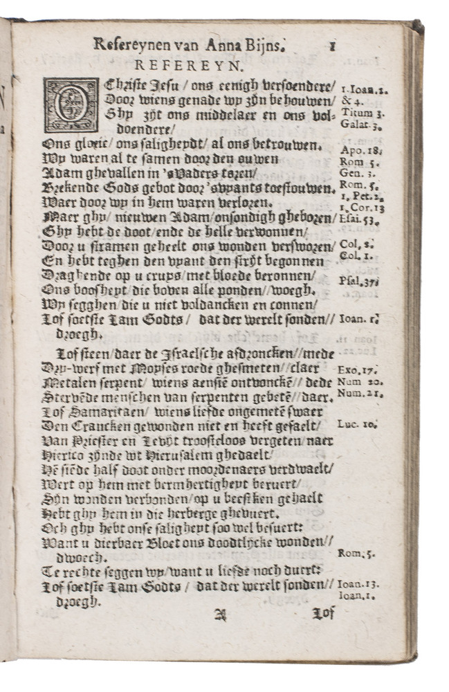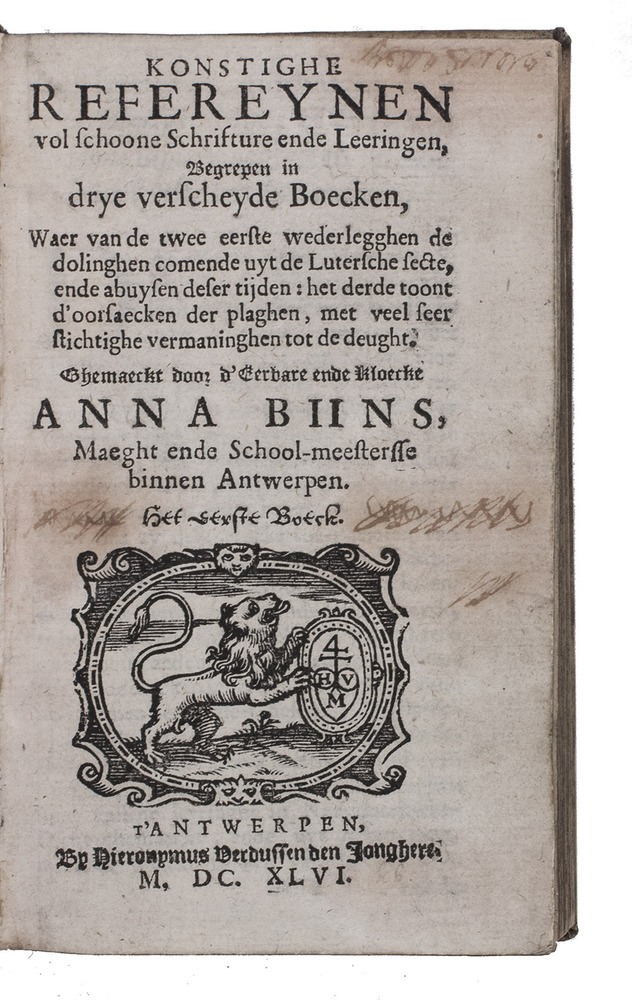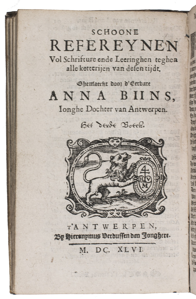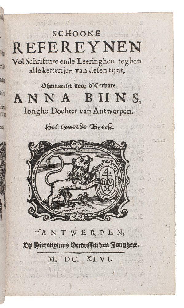 First edition of the complete collection of religious and moralizing poems by Anna Bijns (1493-1575), a nun and schoolmistress in Antwerp. Since she was a faithful orthodox Catholic, many of her poems harshly criticize Martin Luther and Protestantism in general, naming herself an "avenging angel of the insulted faith". In the margins of most poems references to specific Bible passages can be found. Her poems are so-called "refreinen", "a complex poem of a least four 15 to 19 line stanzas with an epigrammatic refrain, natural rhythm, a complicated rhyme scheme, enjambment and caesura. Bijns's refreinen are filled with extraordinarily vivid and acerbic images drawn from daily observation and well illustrate her motto 'more sour than sweet' (meer suers dan soets)" (Aercke). She is often called one of the greatest "rederijkers", an association of Dutch poets from which Bijns, being a woman, was actually excluded.